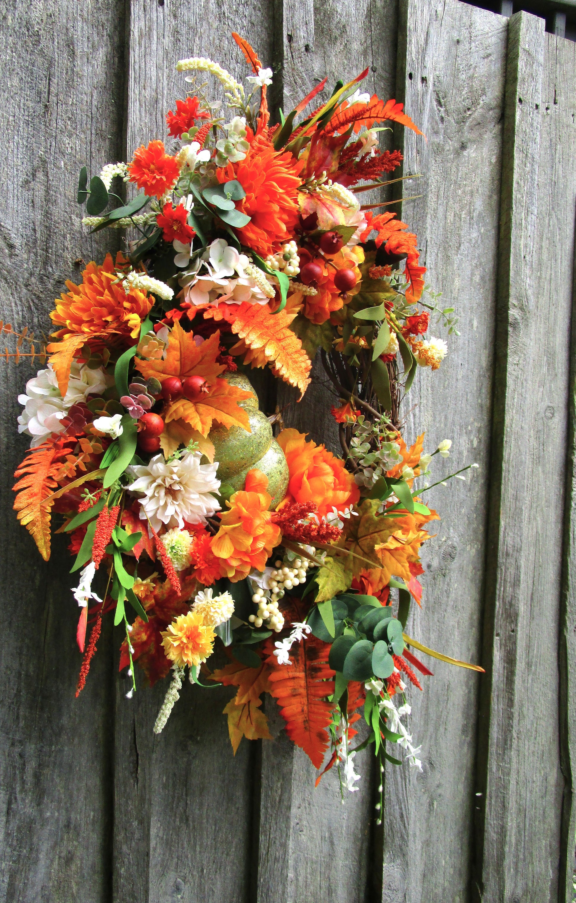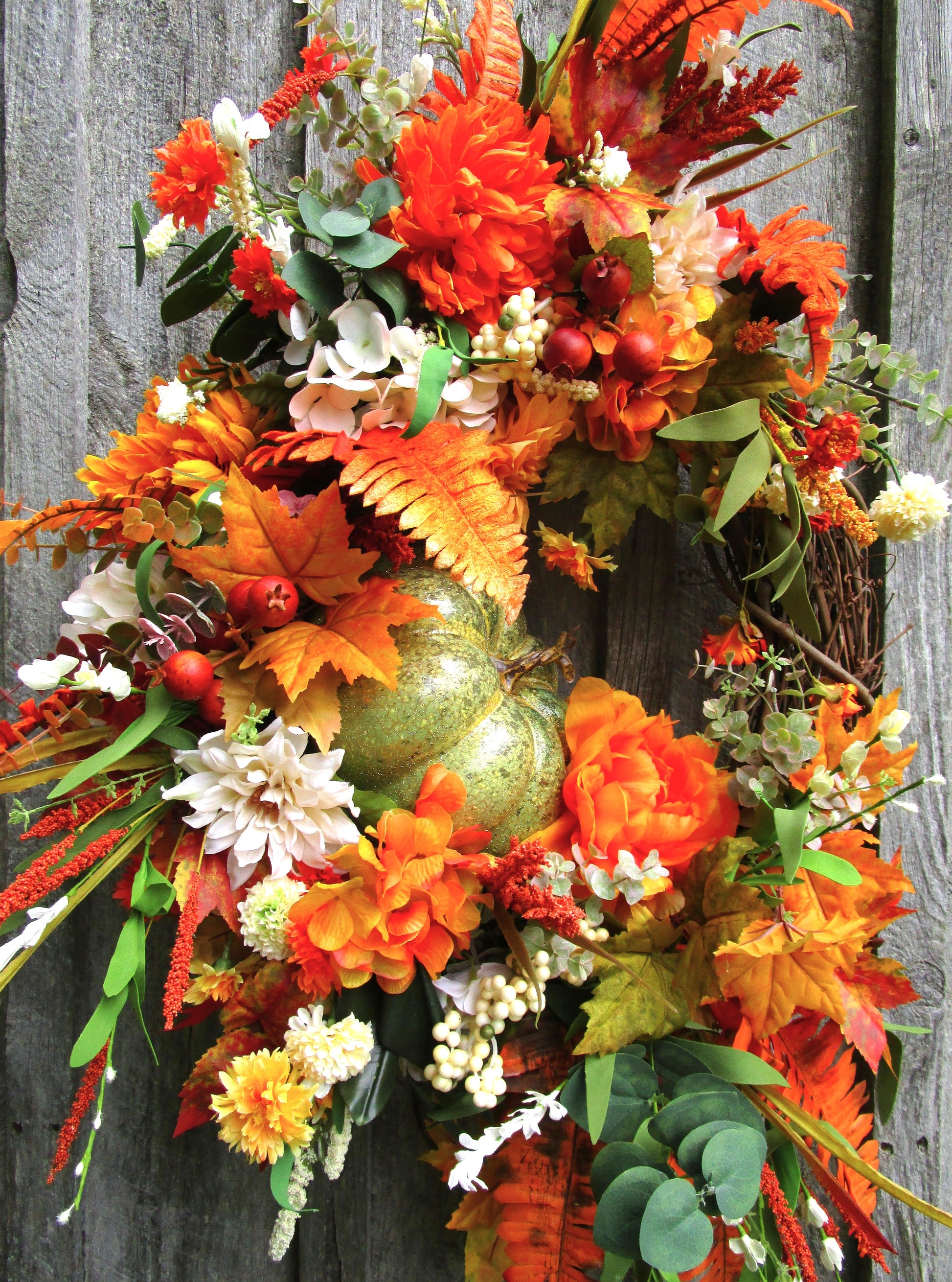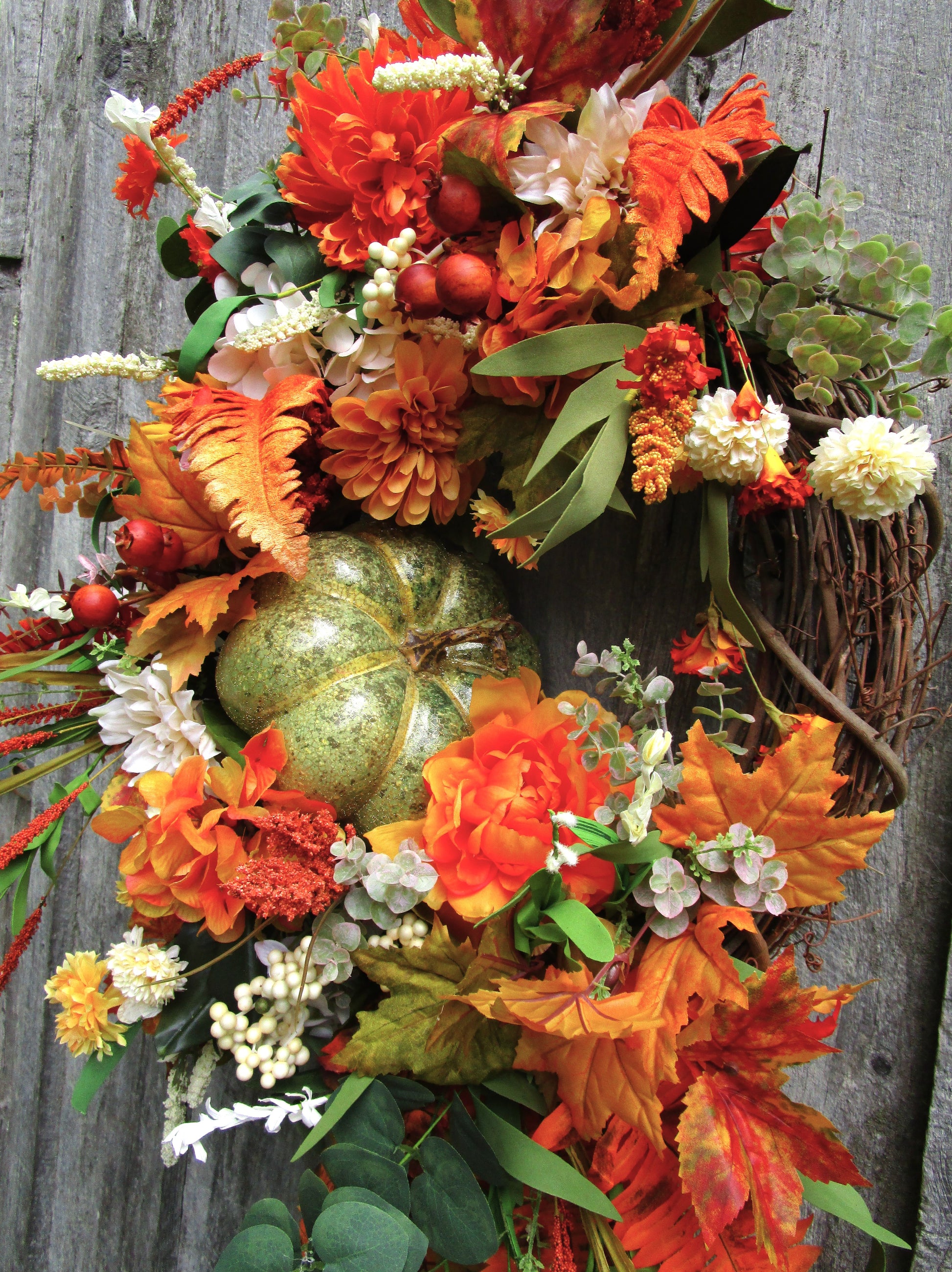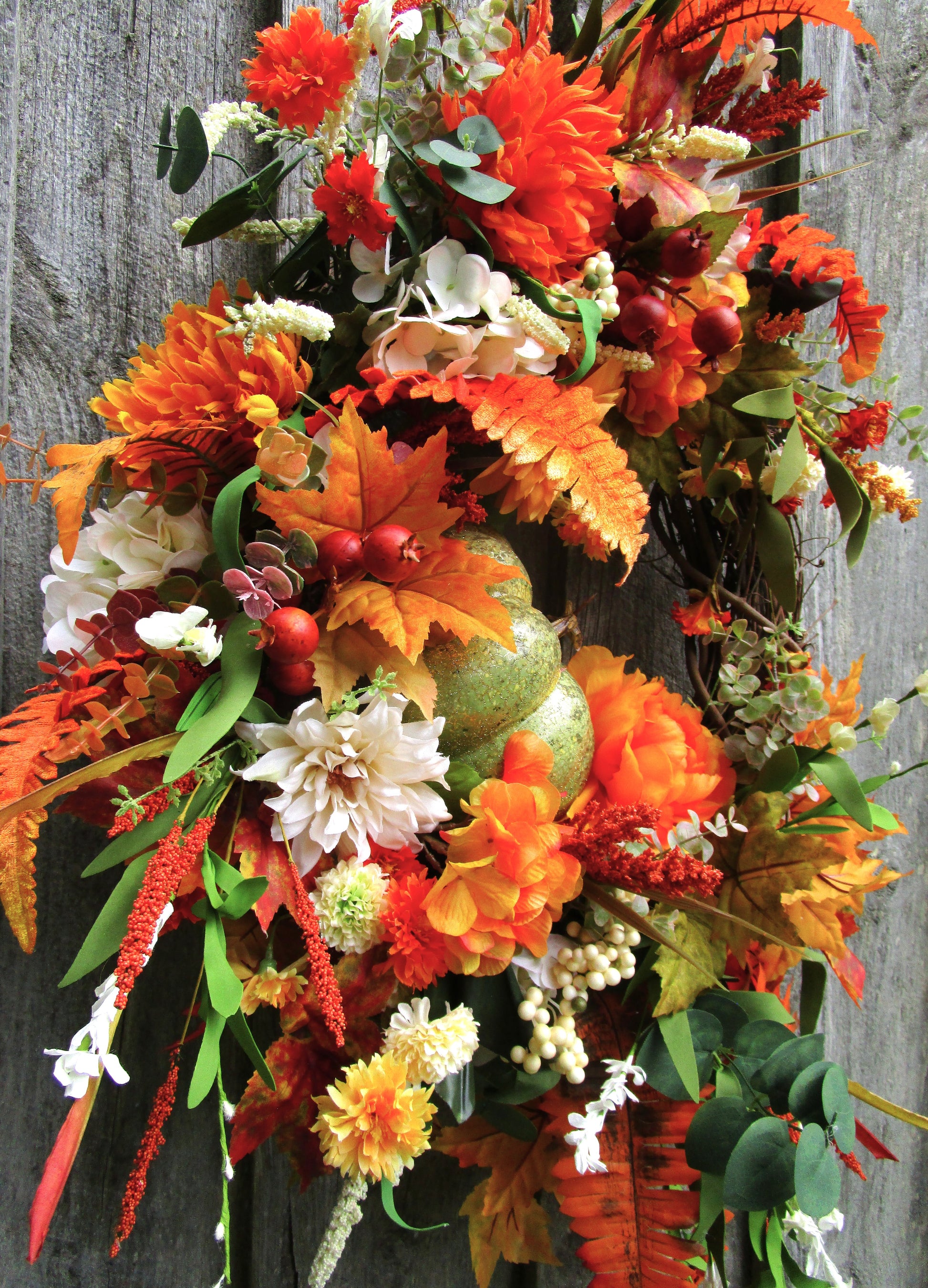 ~ Faux hydrangeas, mums, peonies, wildflowers, and fall foliage