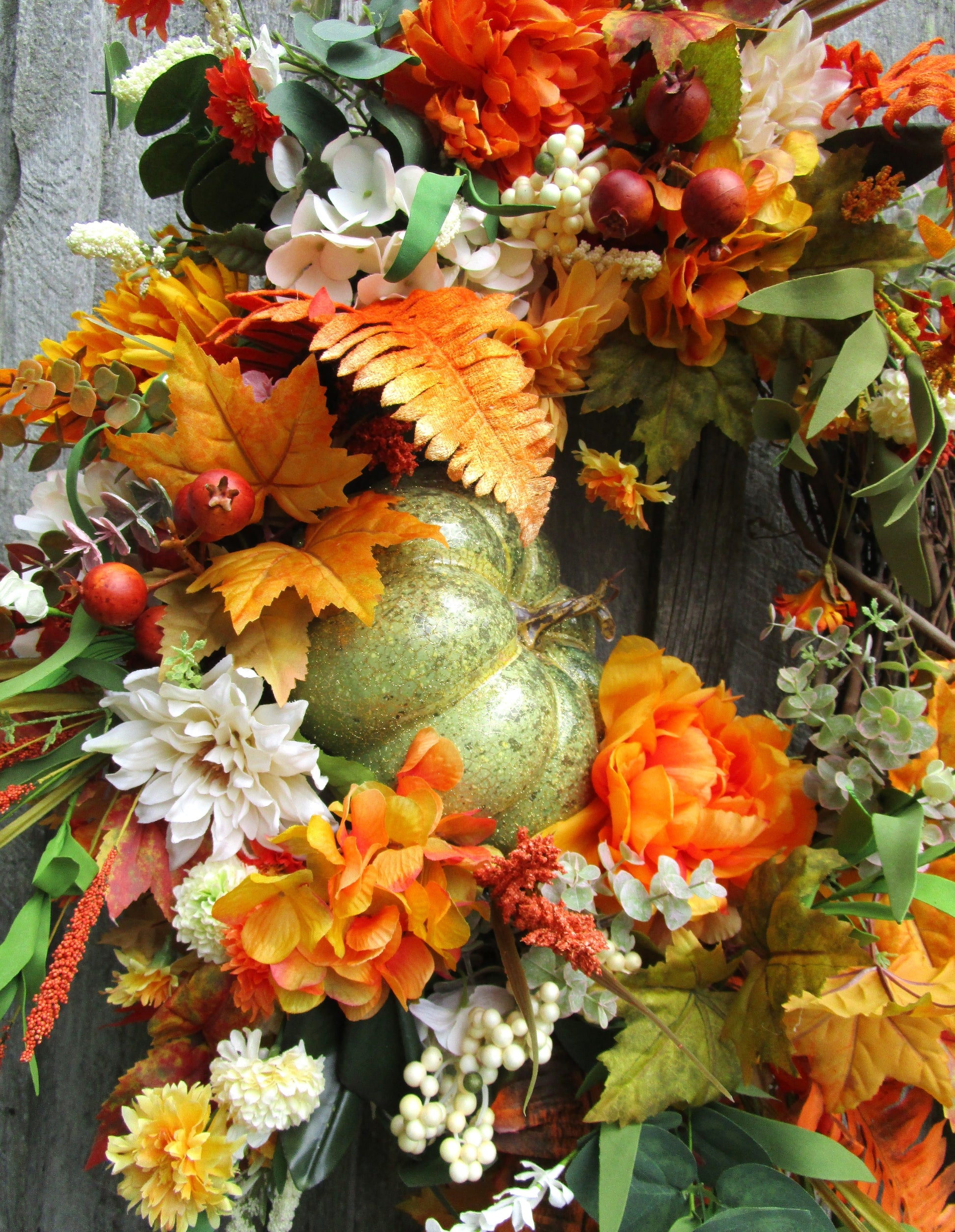 Celebrate the season with this elegant fall wreath featuring lush hydrangeas, peonies, mums, and wildflowers in warm romantic hues. Boston ferns, eucalyptus, softly colored leaves, and berry branches add rich autumn texture. Nestled among the florals is a glittered pale green pumpkin for a soft seasonal accent.