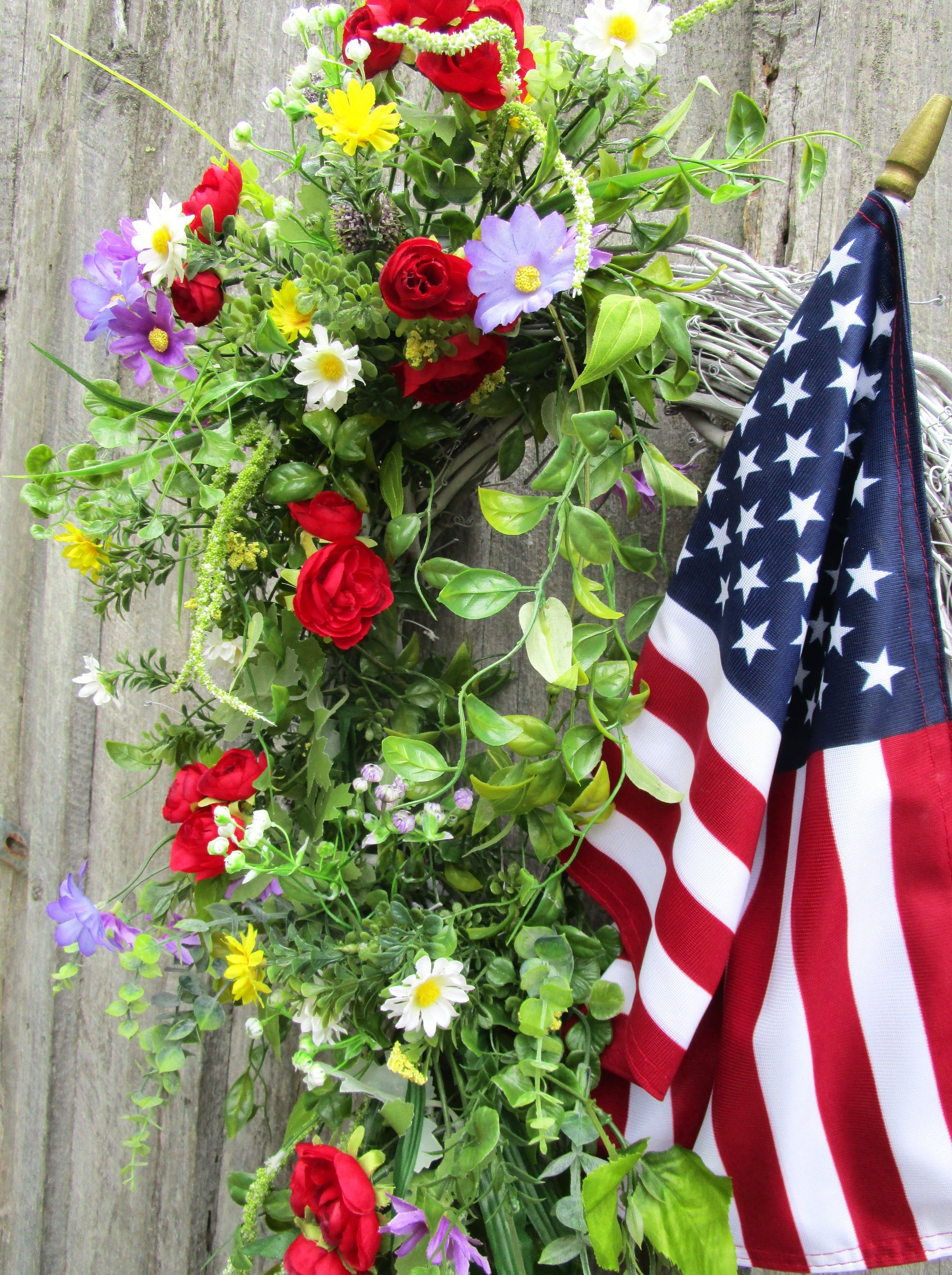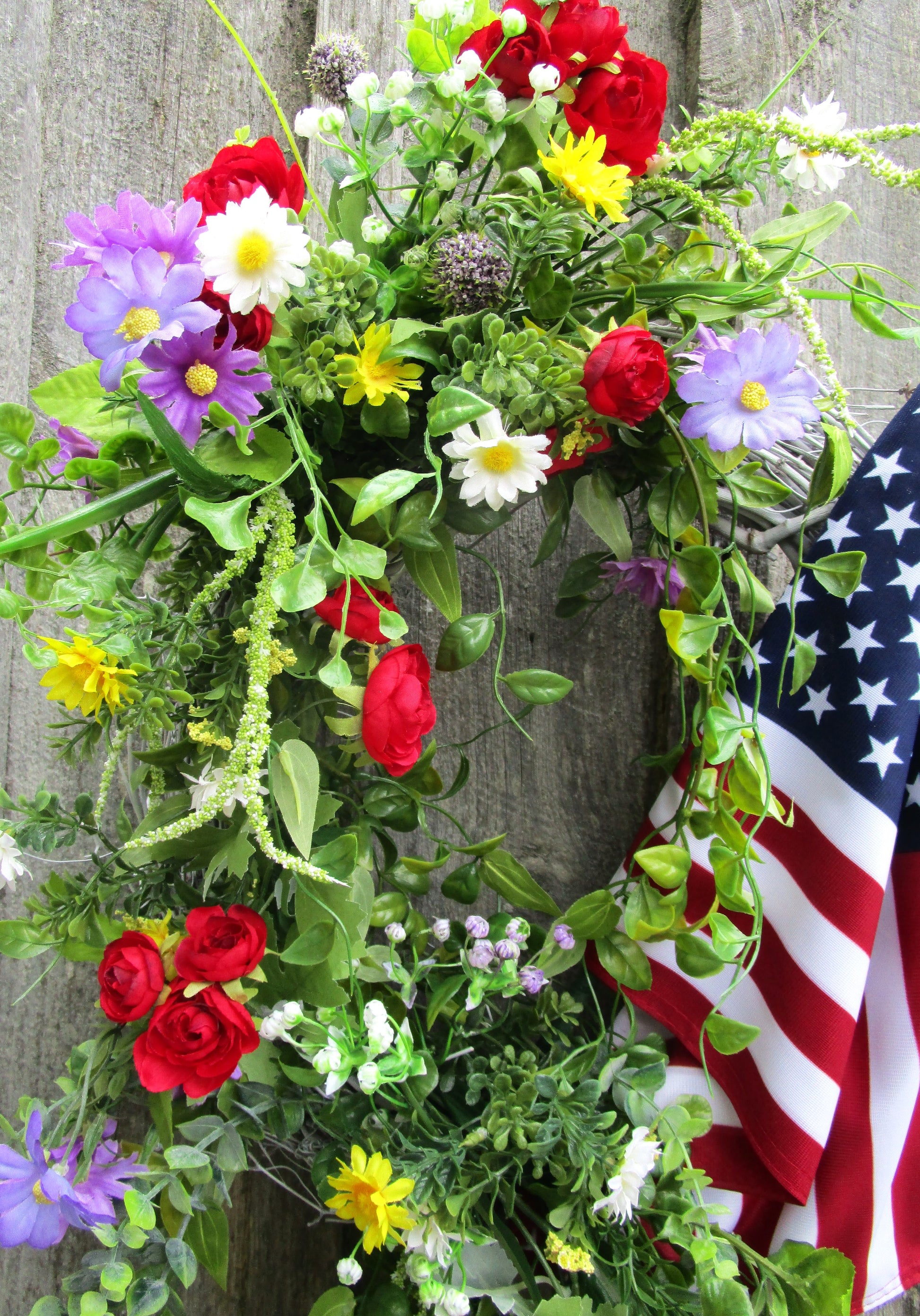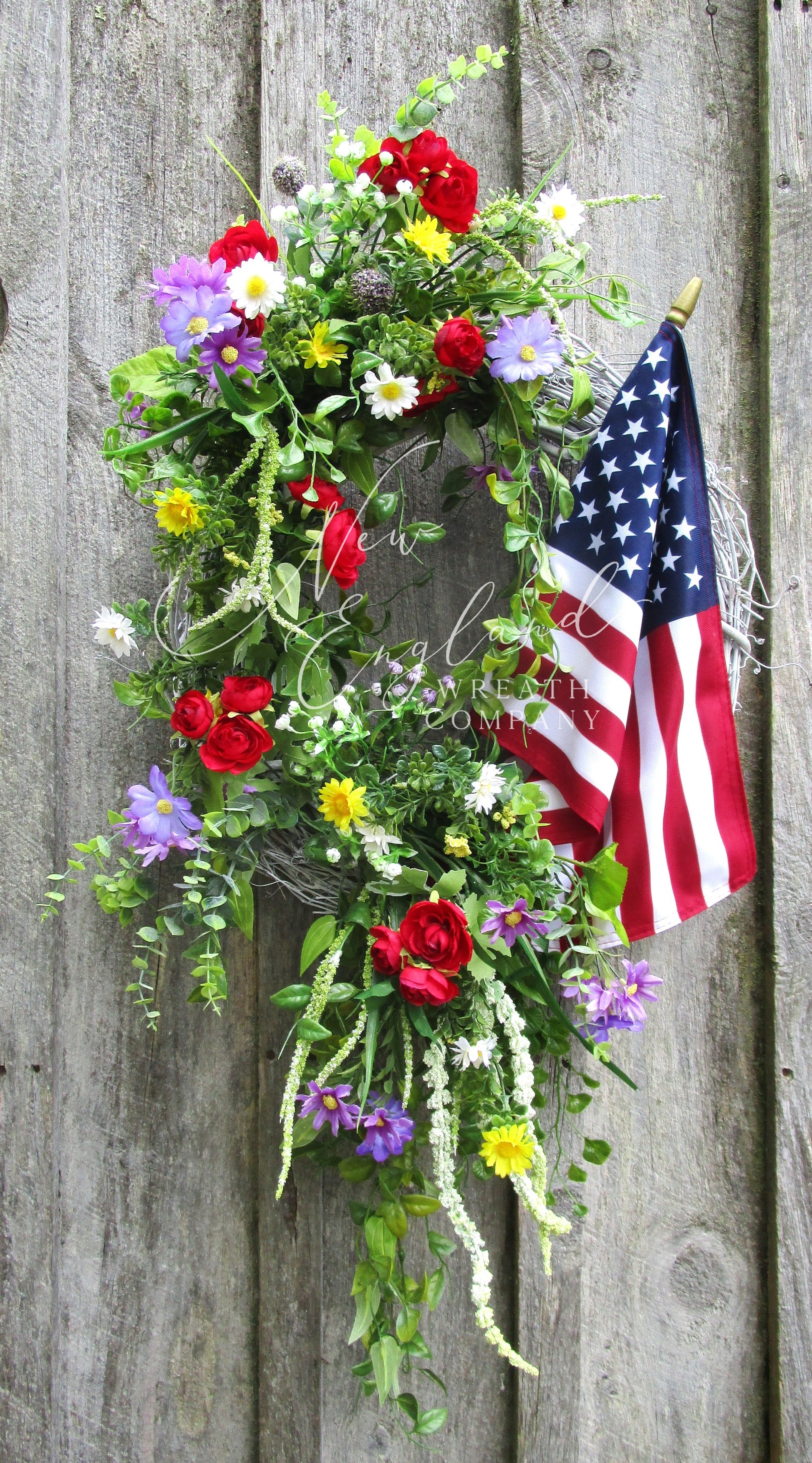 The Bridgton Front Porch Flag Wreath is a vibrant mix of red, white, blue, yellow, and lavender blooms, styled with flowing greenery and a premium American flag. Built on an 18" white-washed grapevine base, it brings festive color and classic Americana charm to your door — perfect for summer holidays or year-round patriotism.