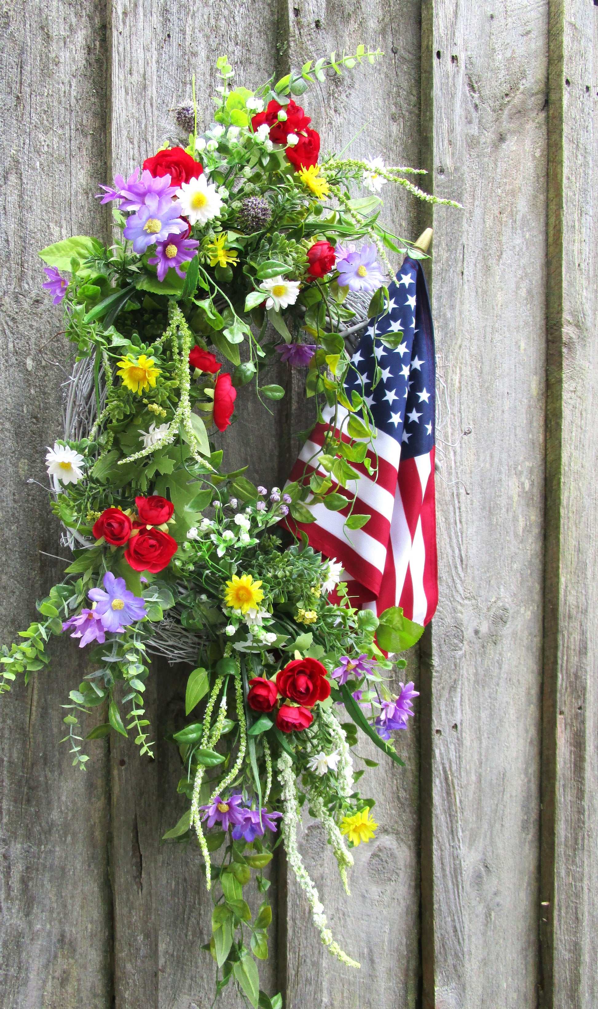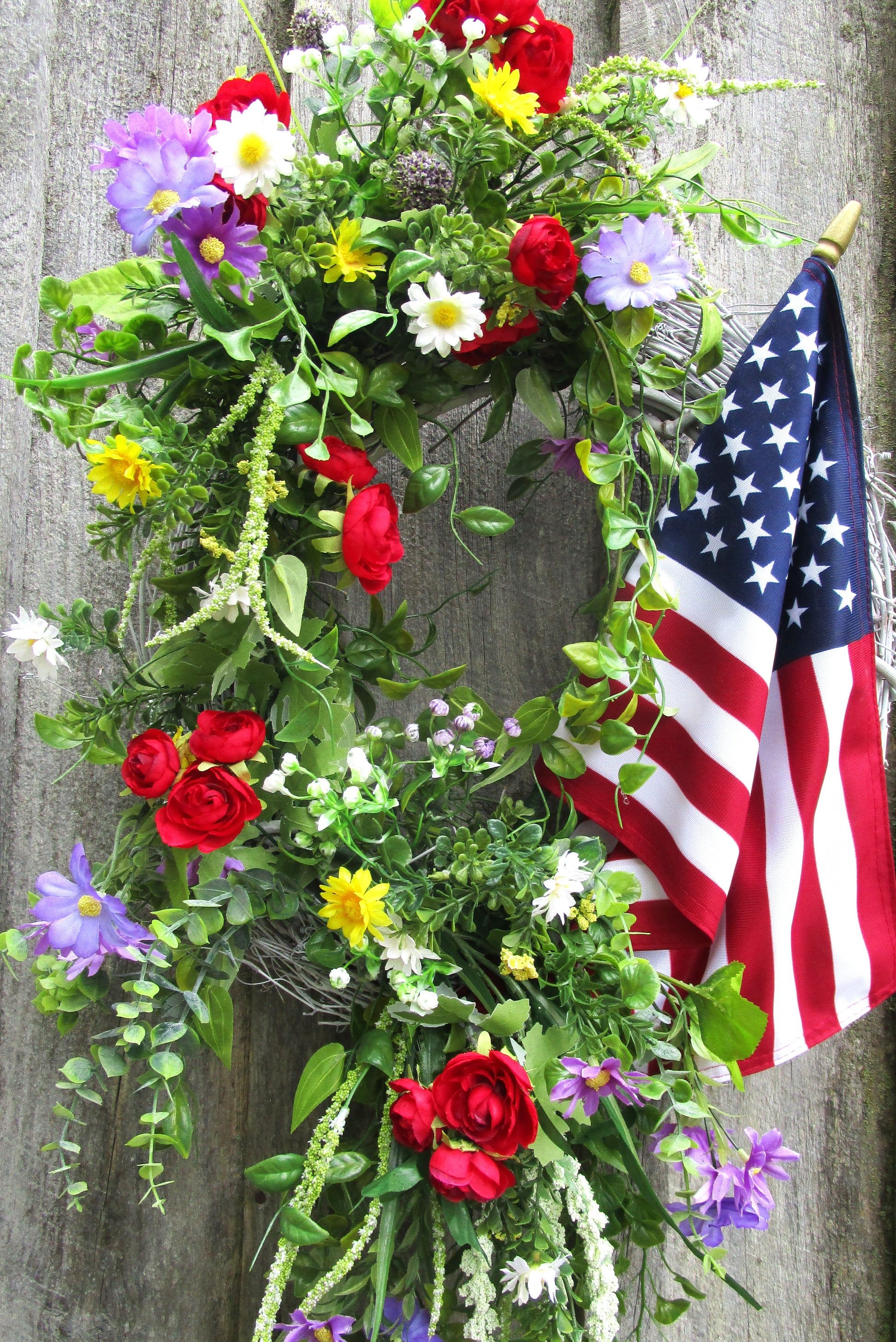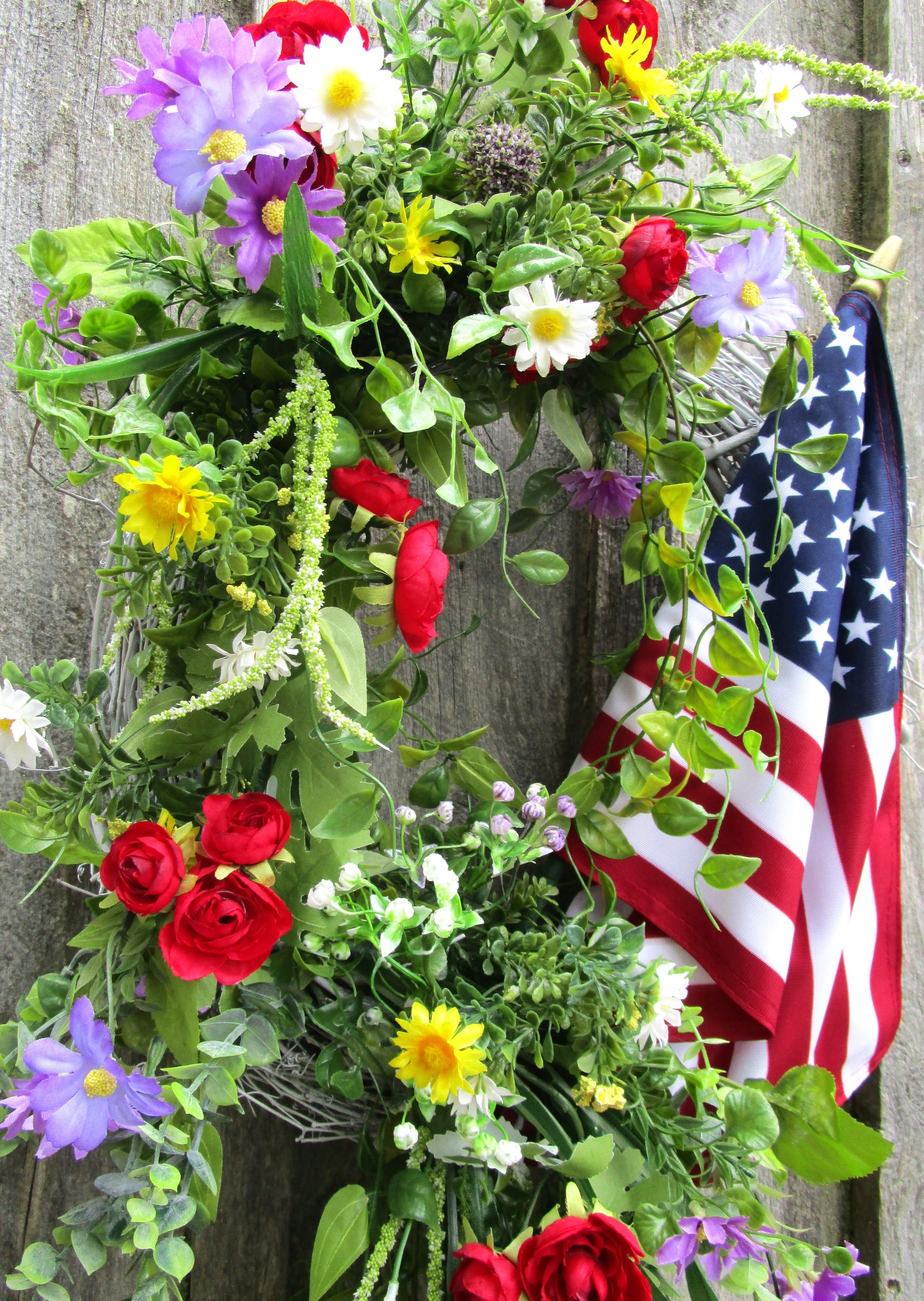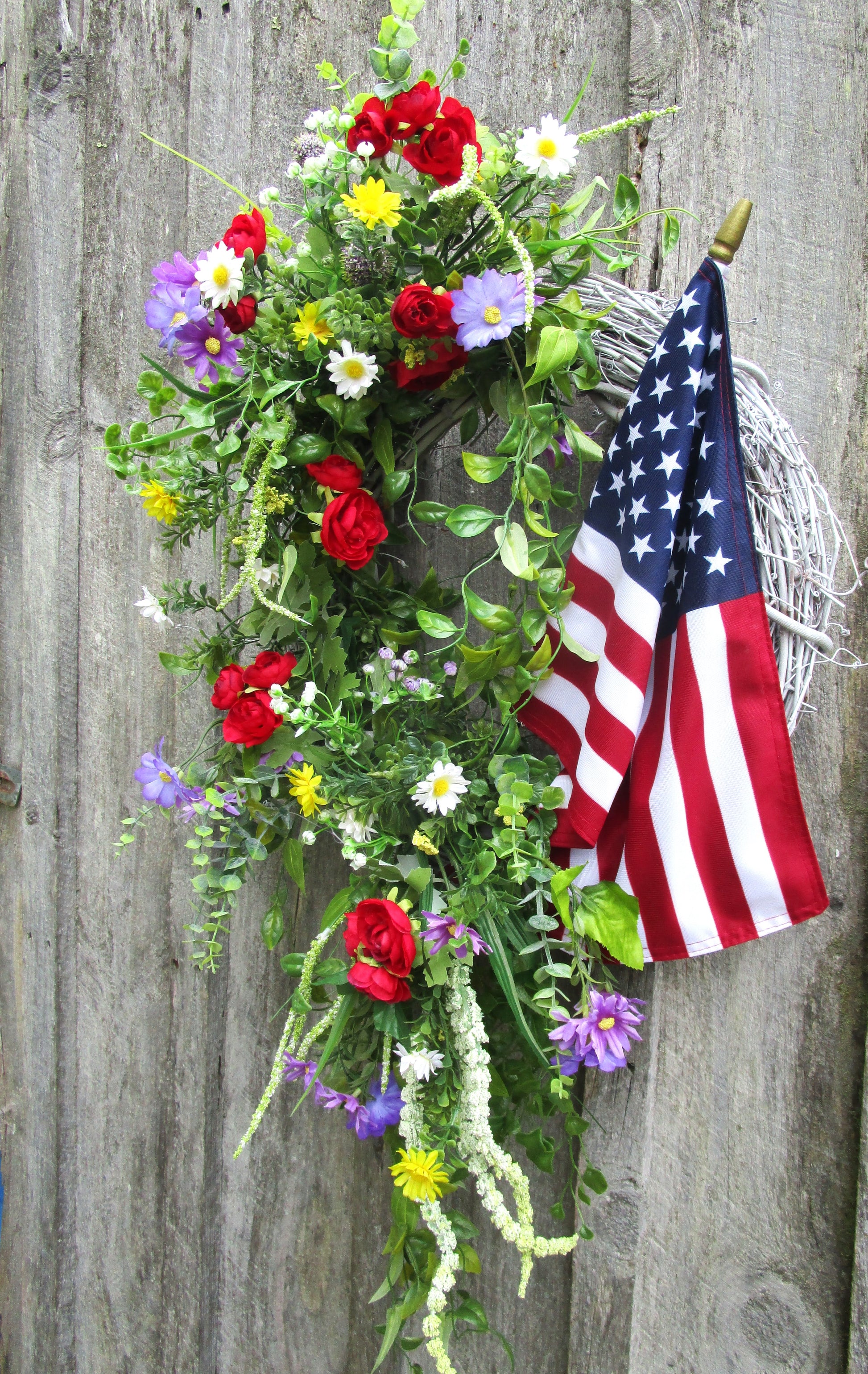 The Bridgton Front Porch Flag Wreath is a vibrant mix of red, white, blue, yellow, and lavender blooms, styled with flowing greenery and a premium American flag. Built on an 18" white-washed grapevine base, it brings festive color and classic Americana charm to your door — perfect for summer holidays or year-round patriotism.
