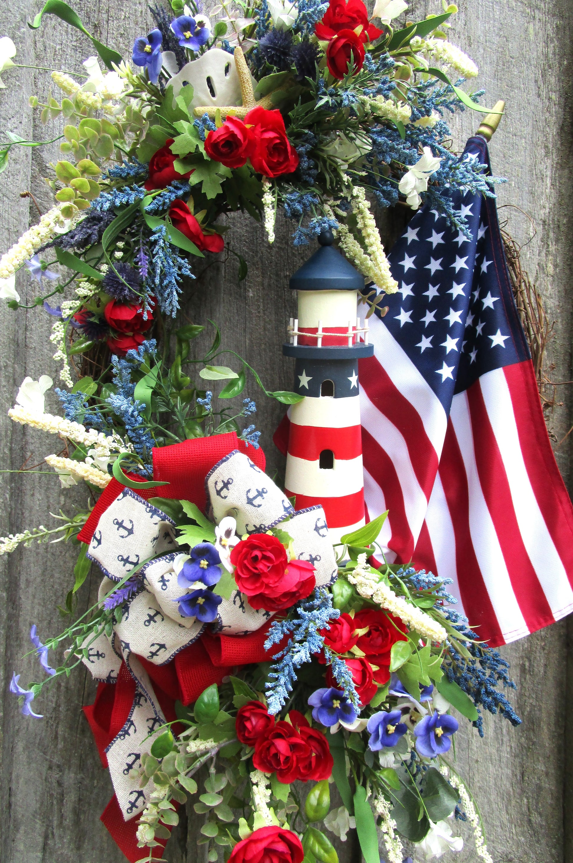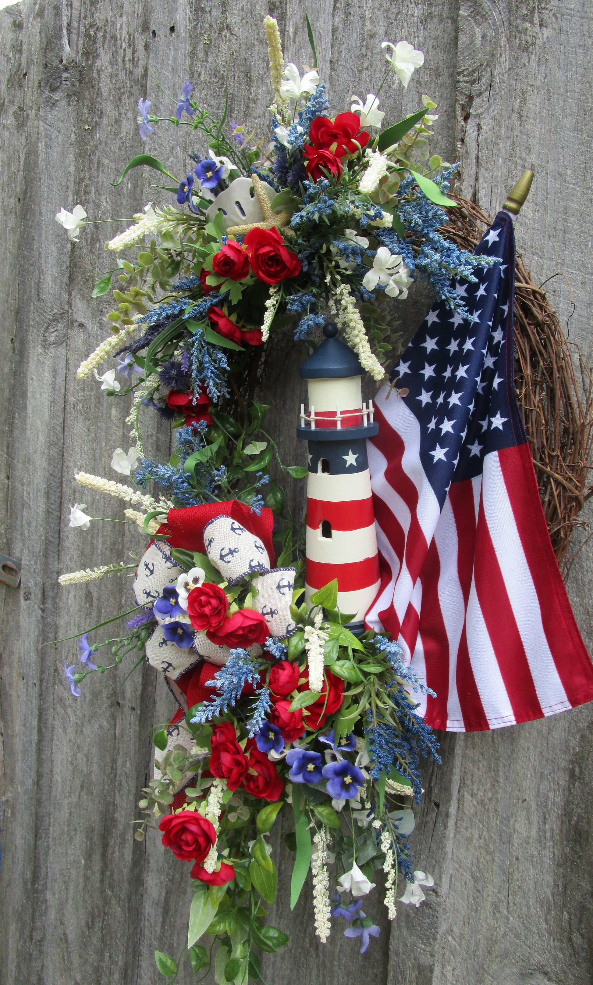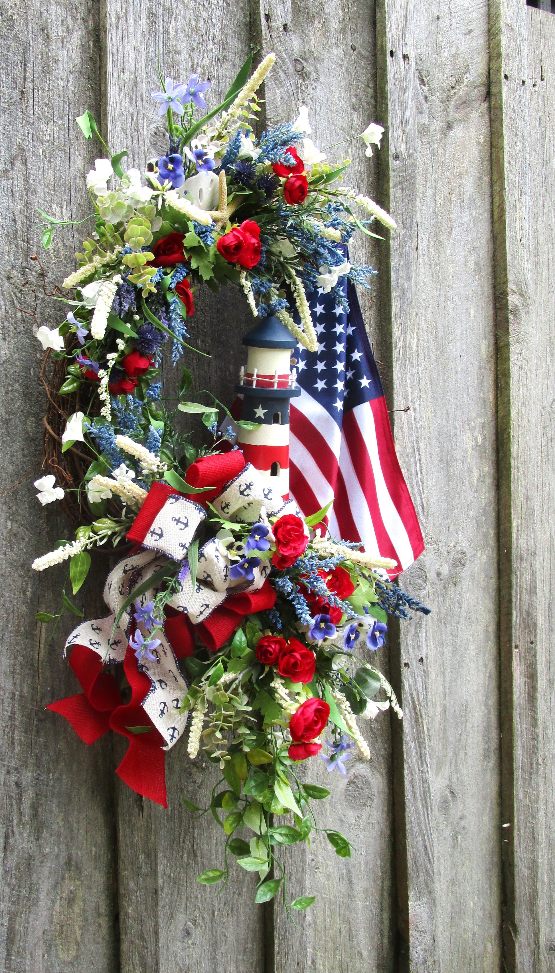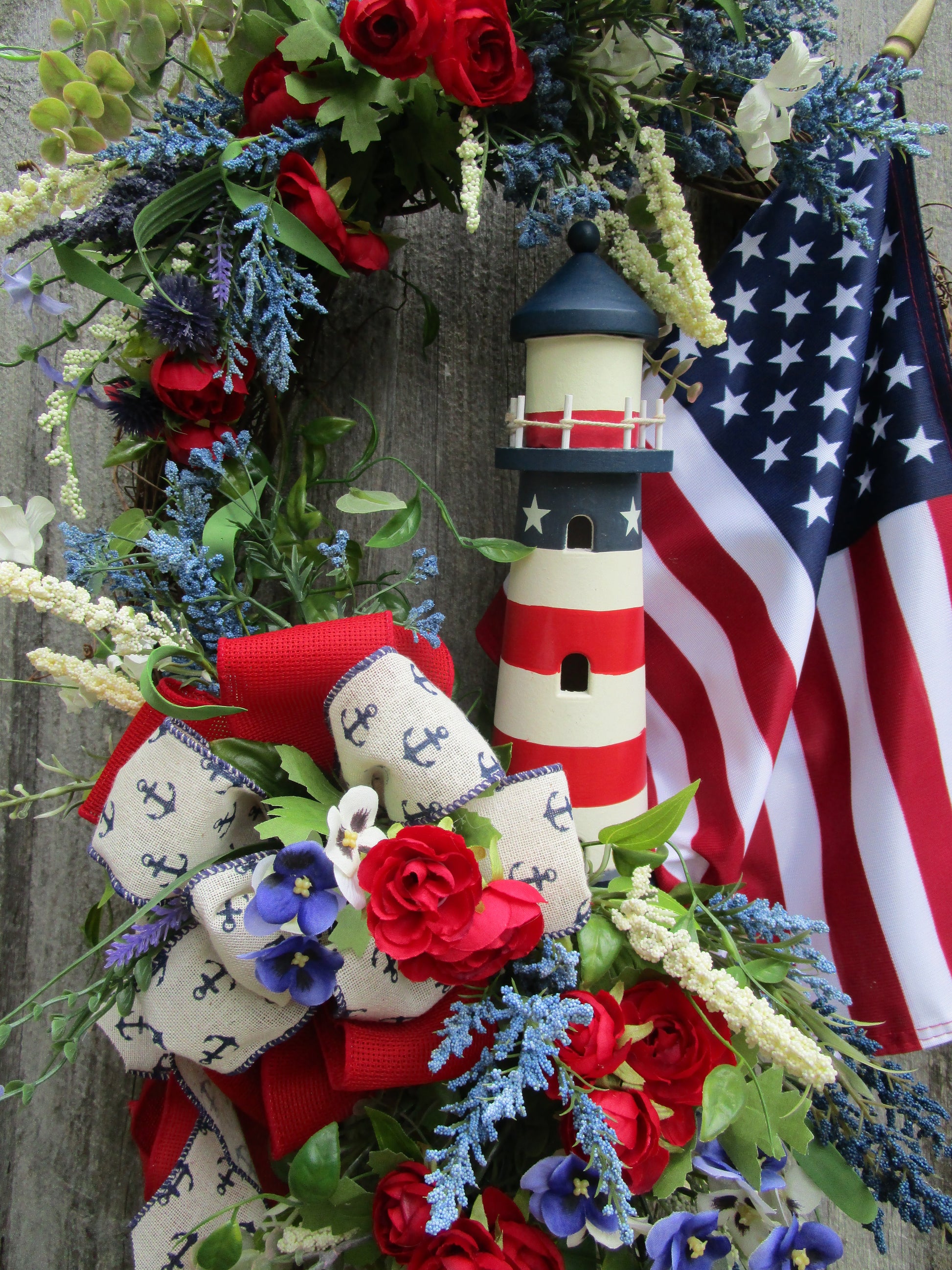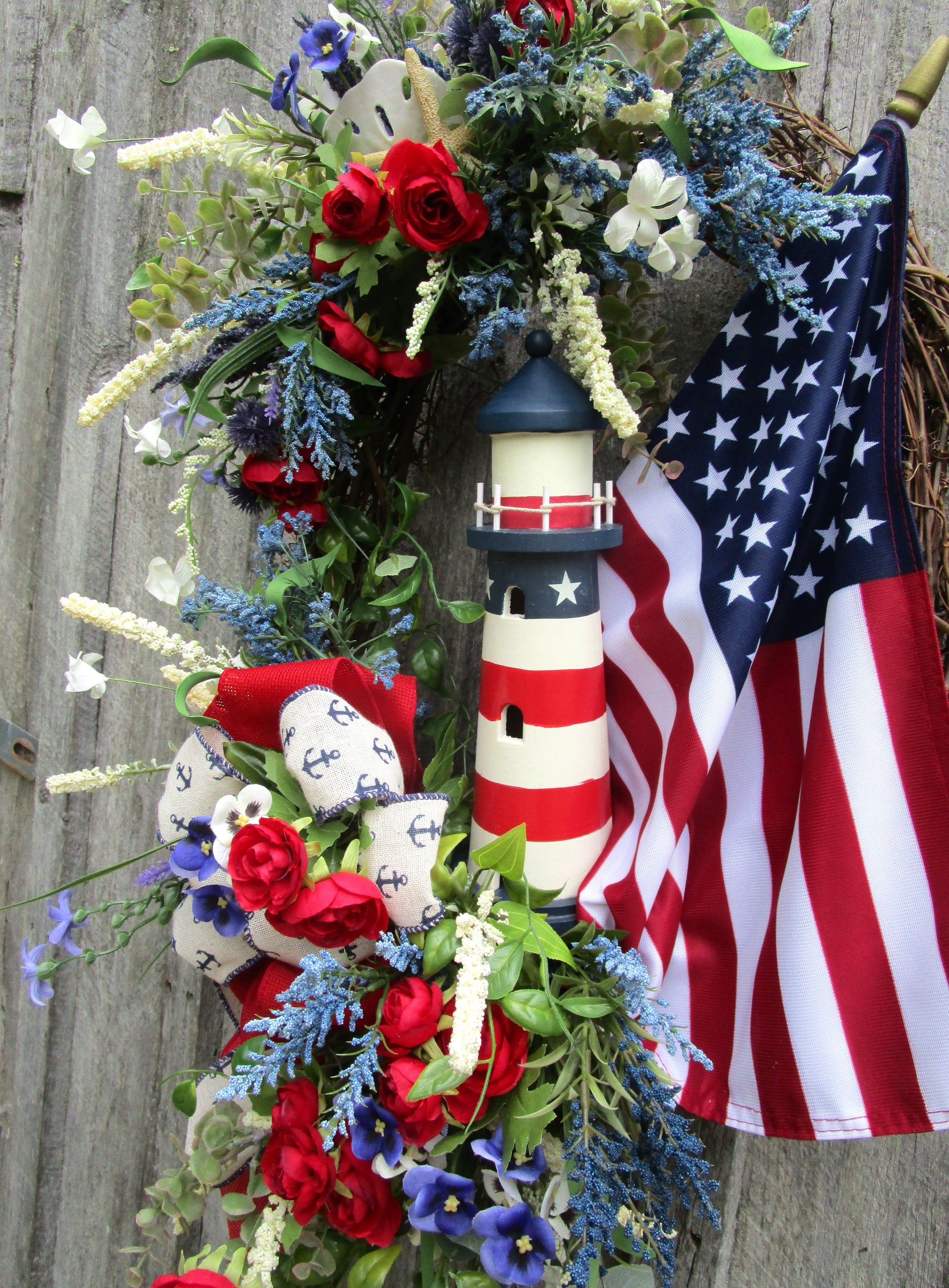 Celebrate summer and American heritage with this coastal wreath featuring a hand-painted lighthouse, vibrant patriotic florals, nautical ribbon, and a full-size American flag.