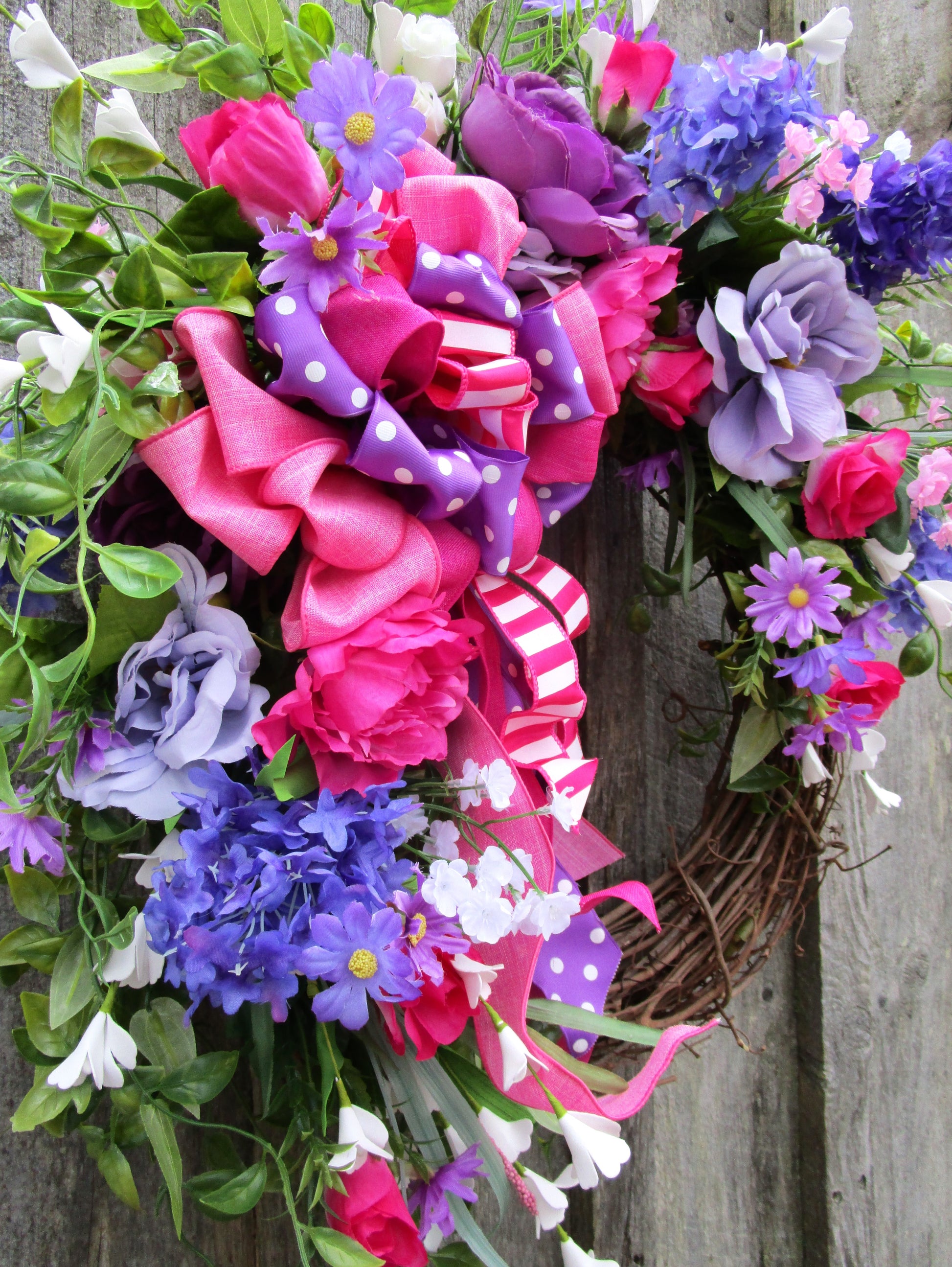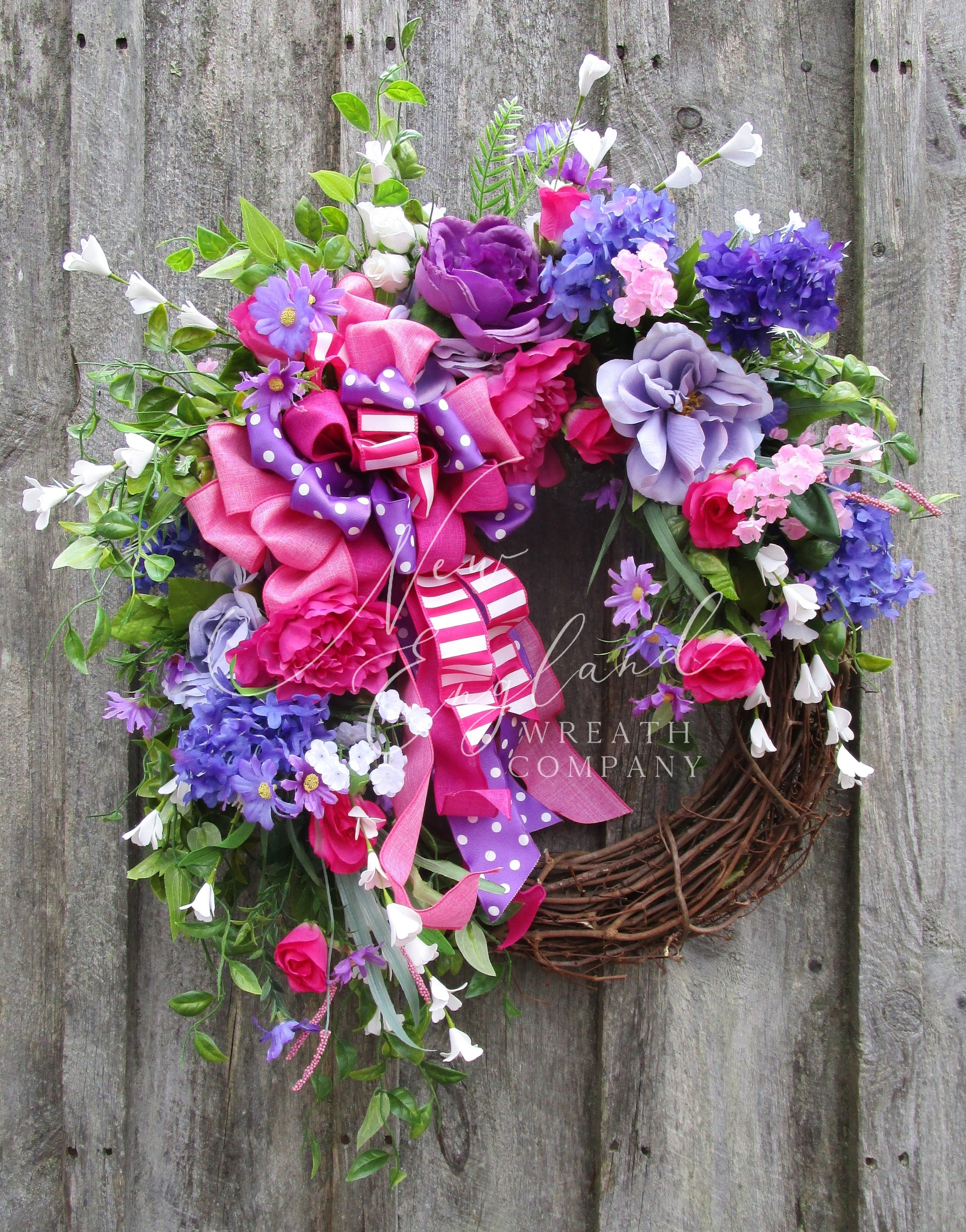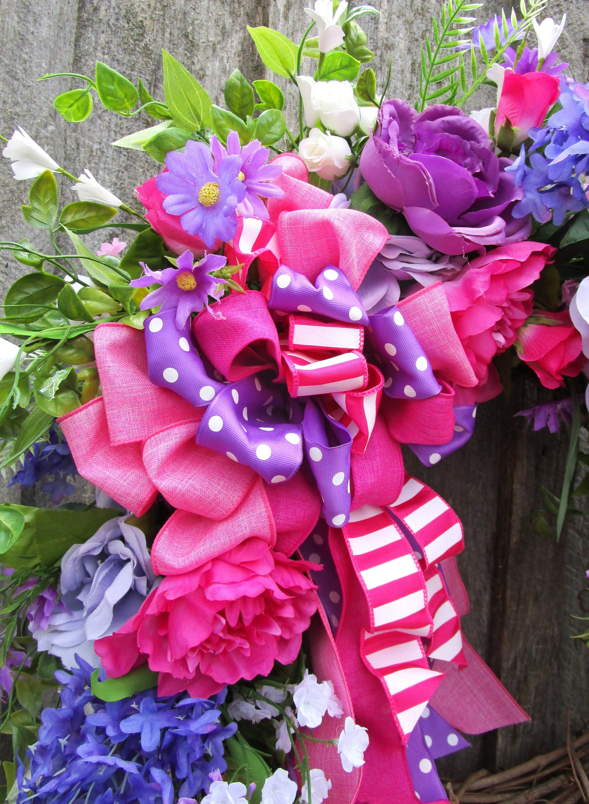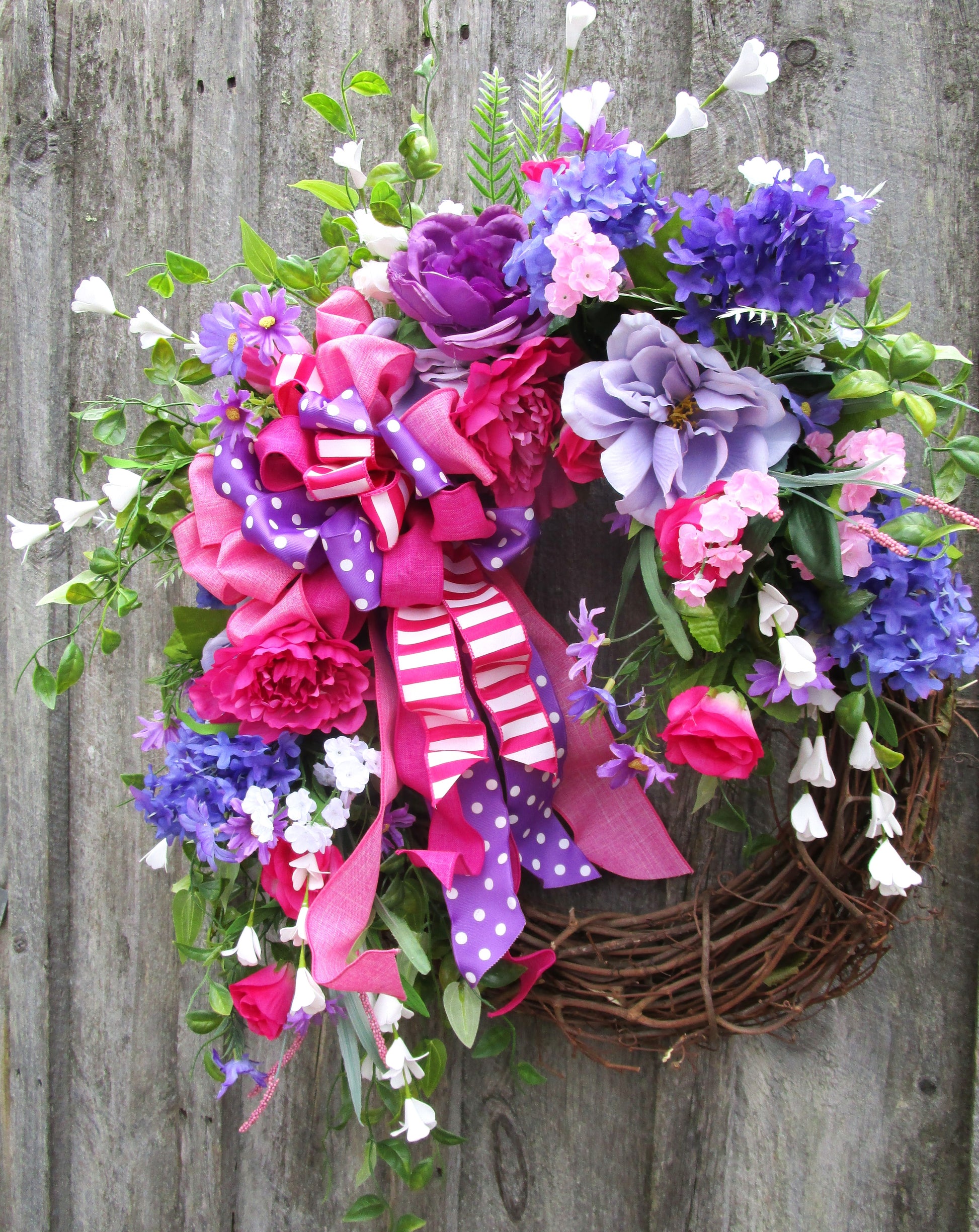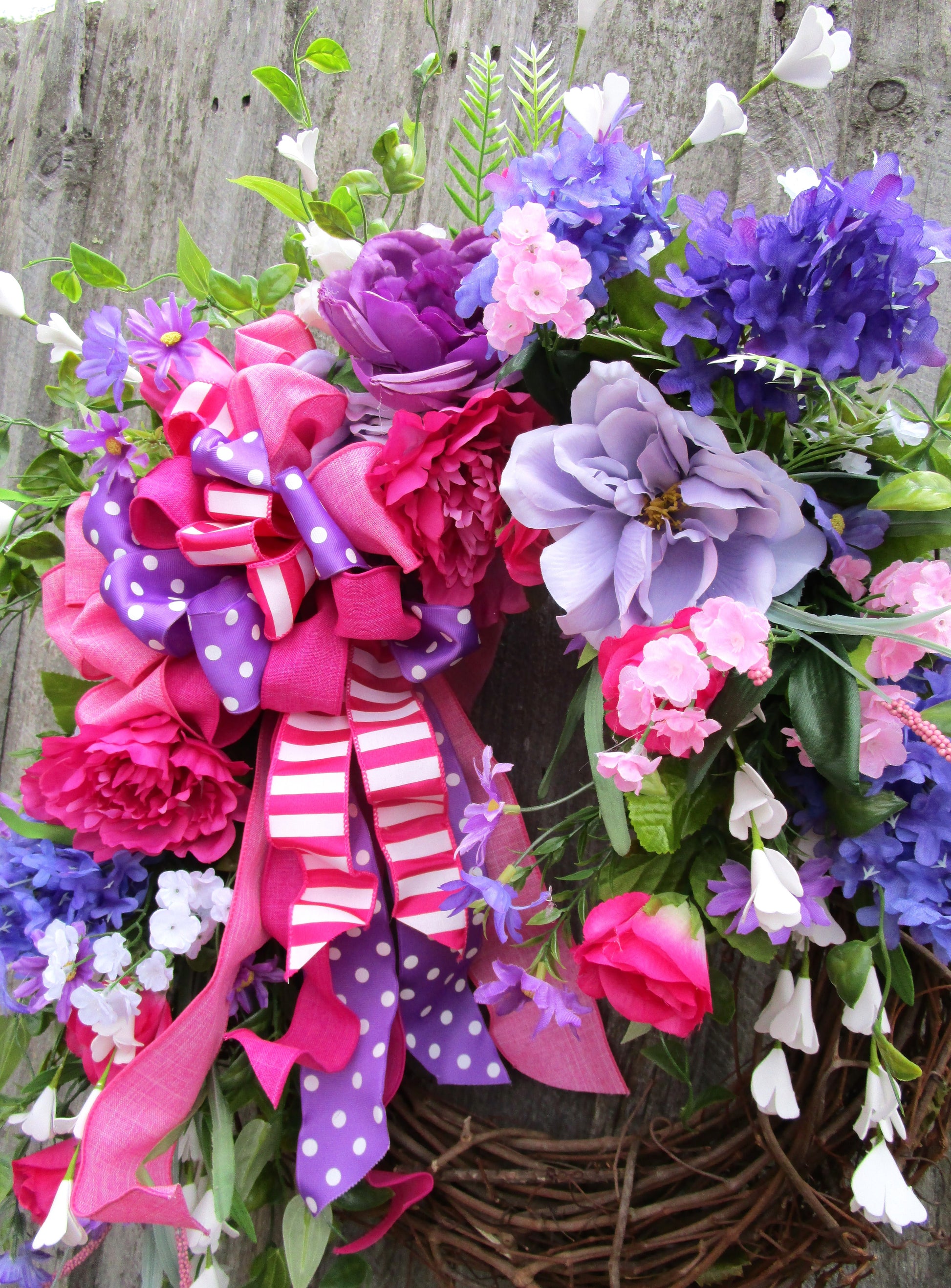 Bring playful charm and vibrant color to your home with this bright floral wreath featuring roses, lilacs, peonies, wildflowers, and a whimsical layered ribbon bow.