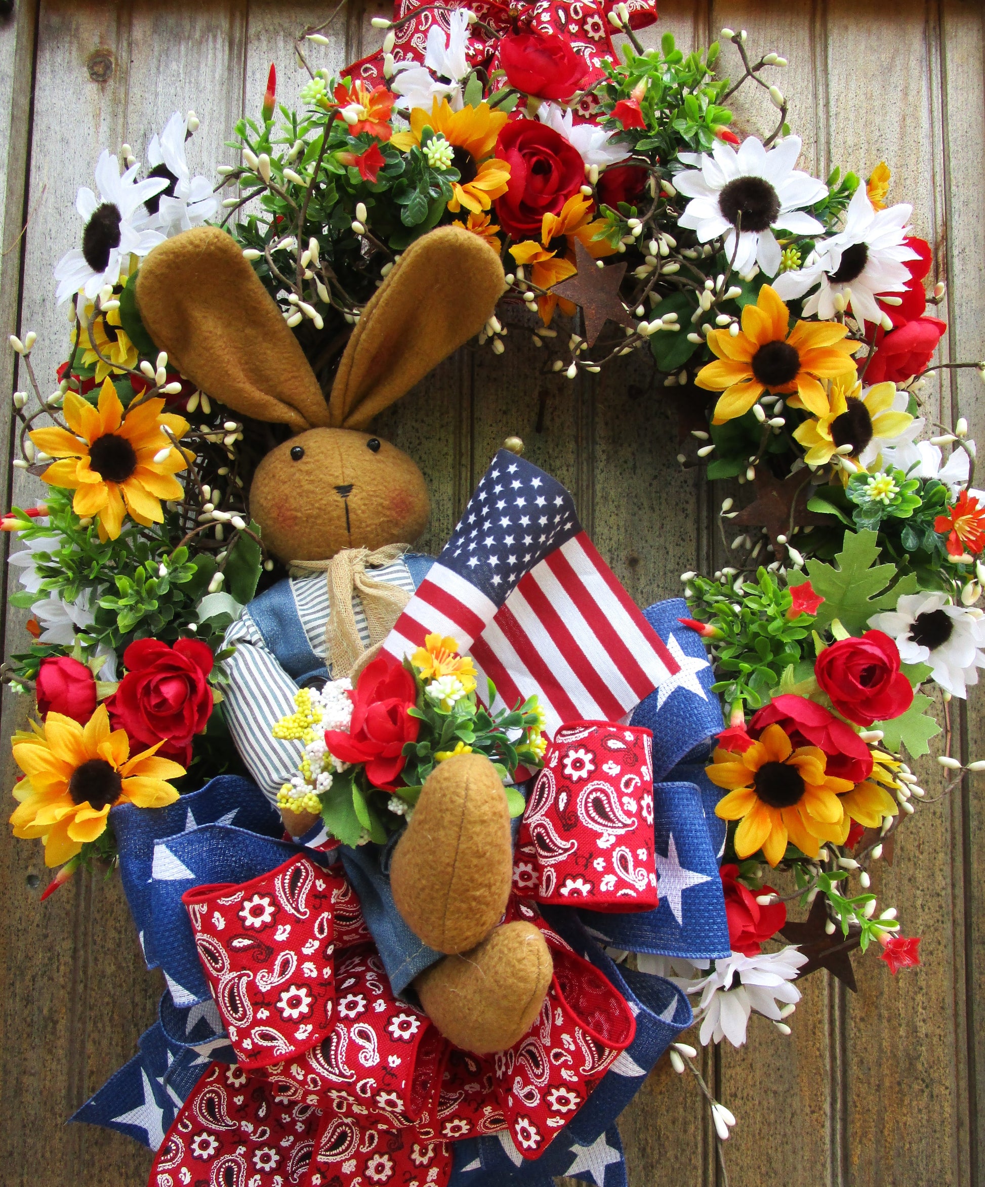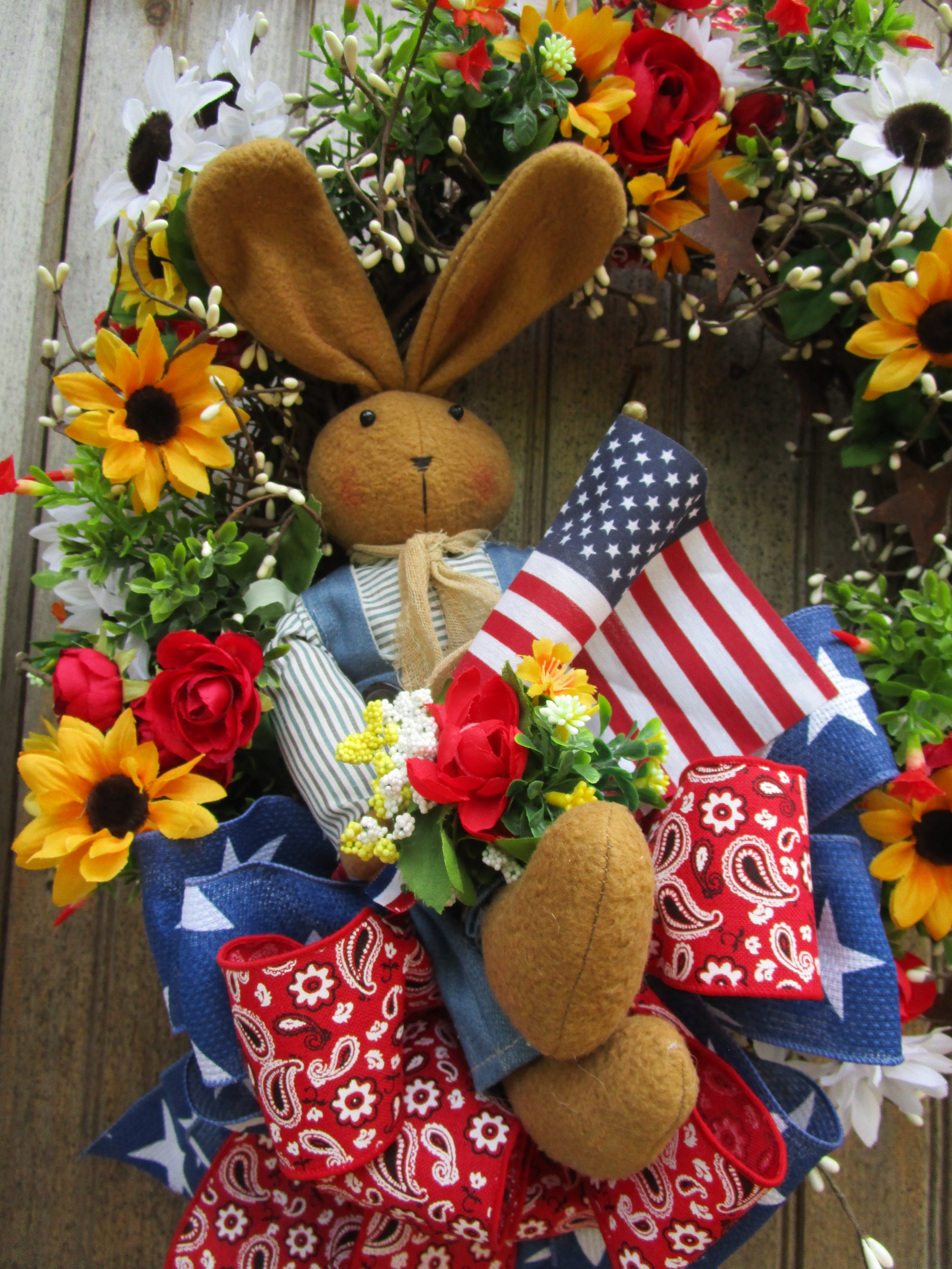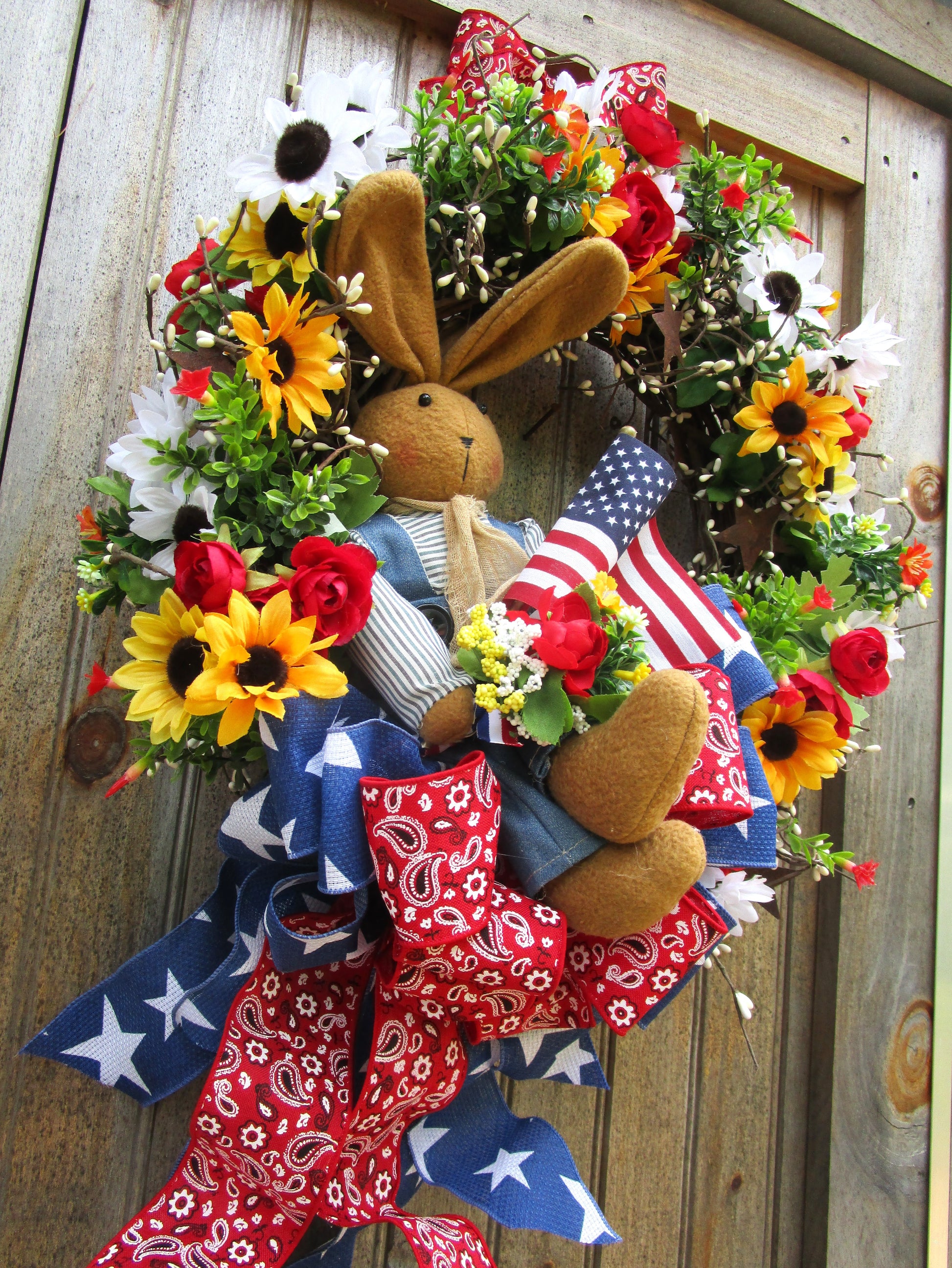 Cheerful bunny wreath featuring daisies, roses, pip berries, patriotic ribbons & American flag. Perfect for summer farmhouse or 4th of July décor.