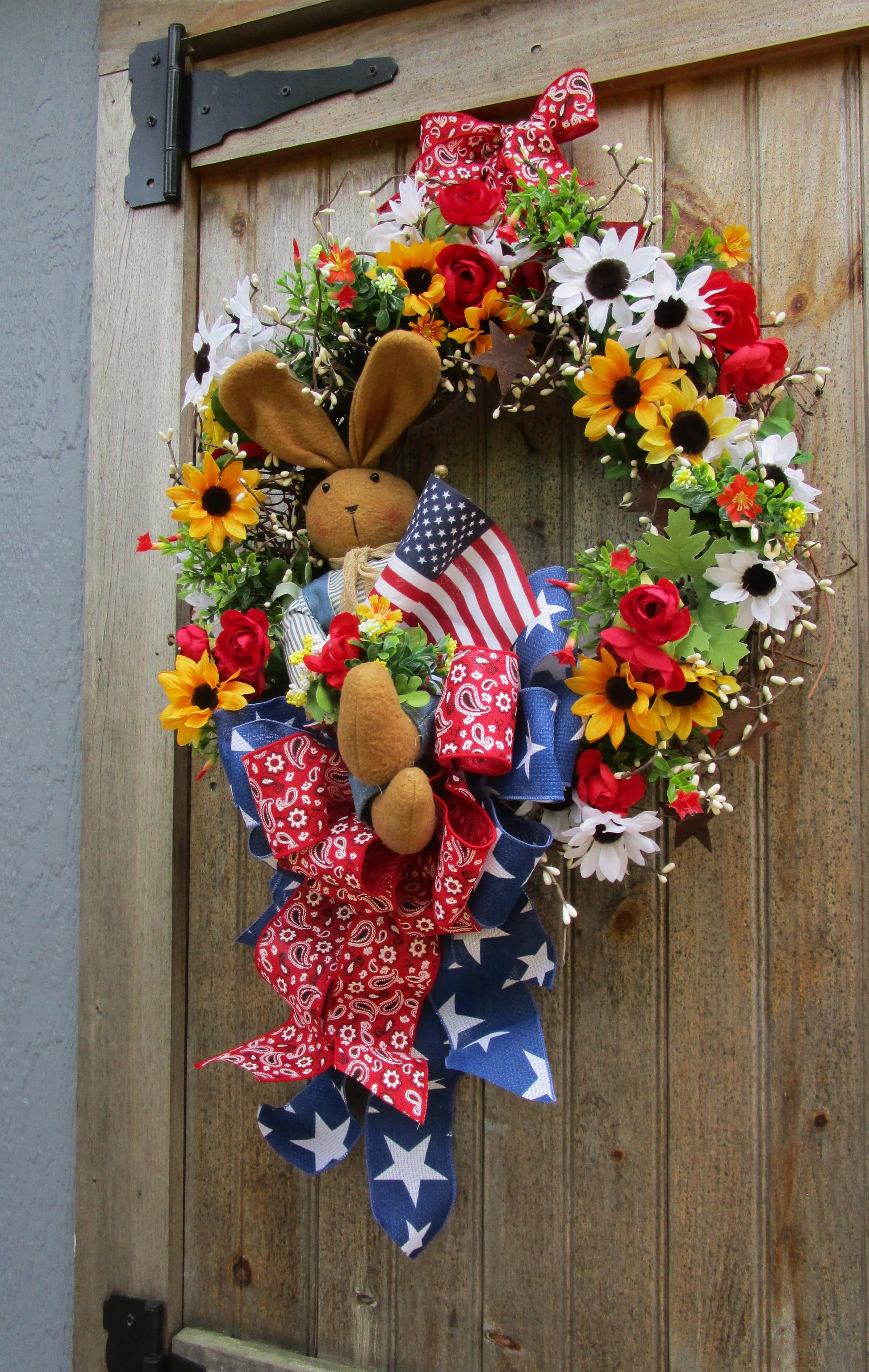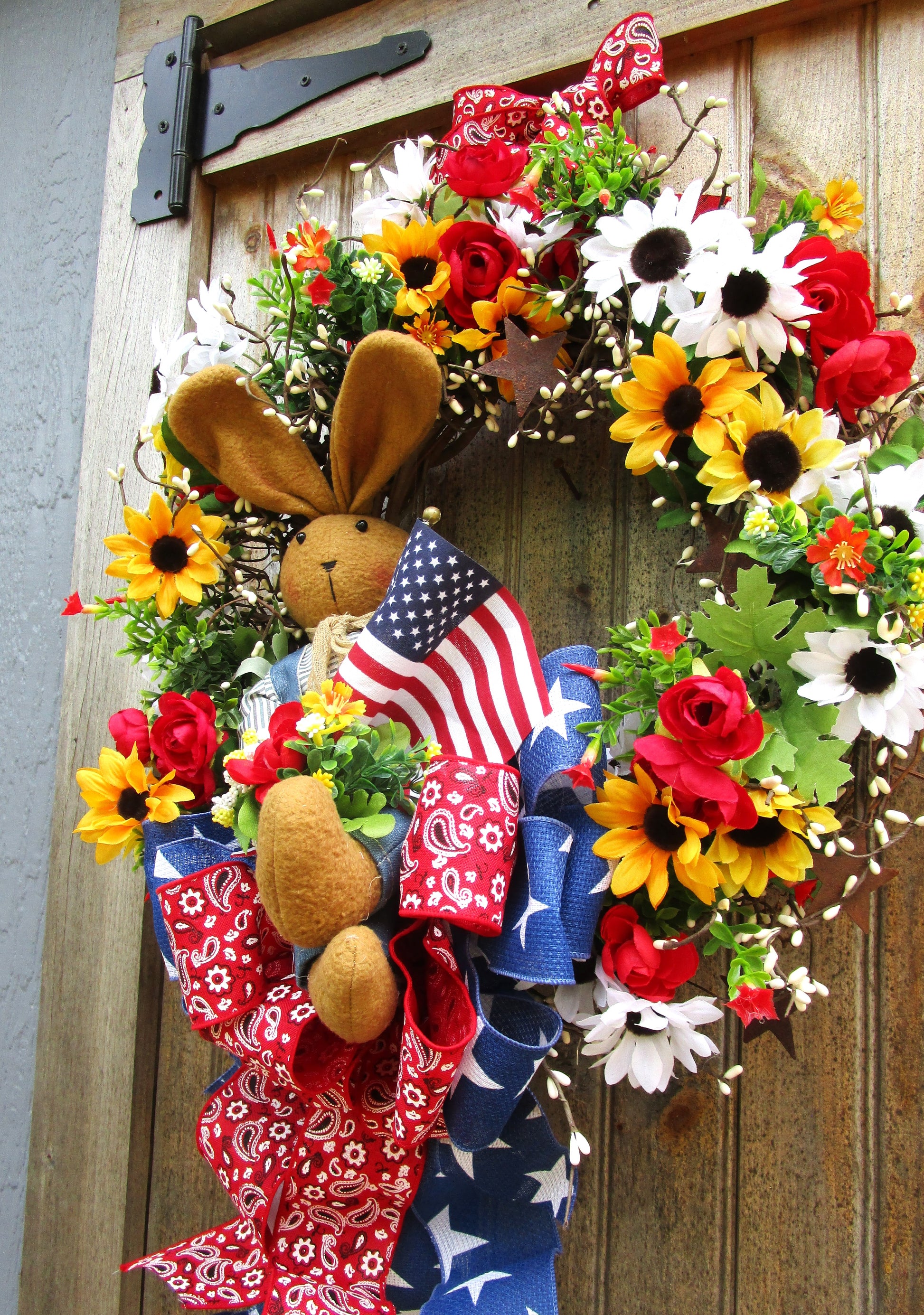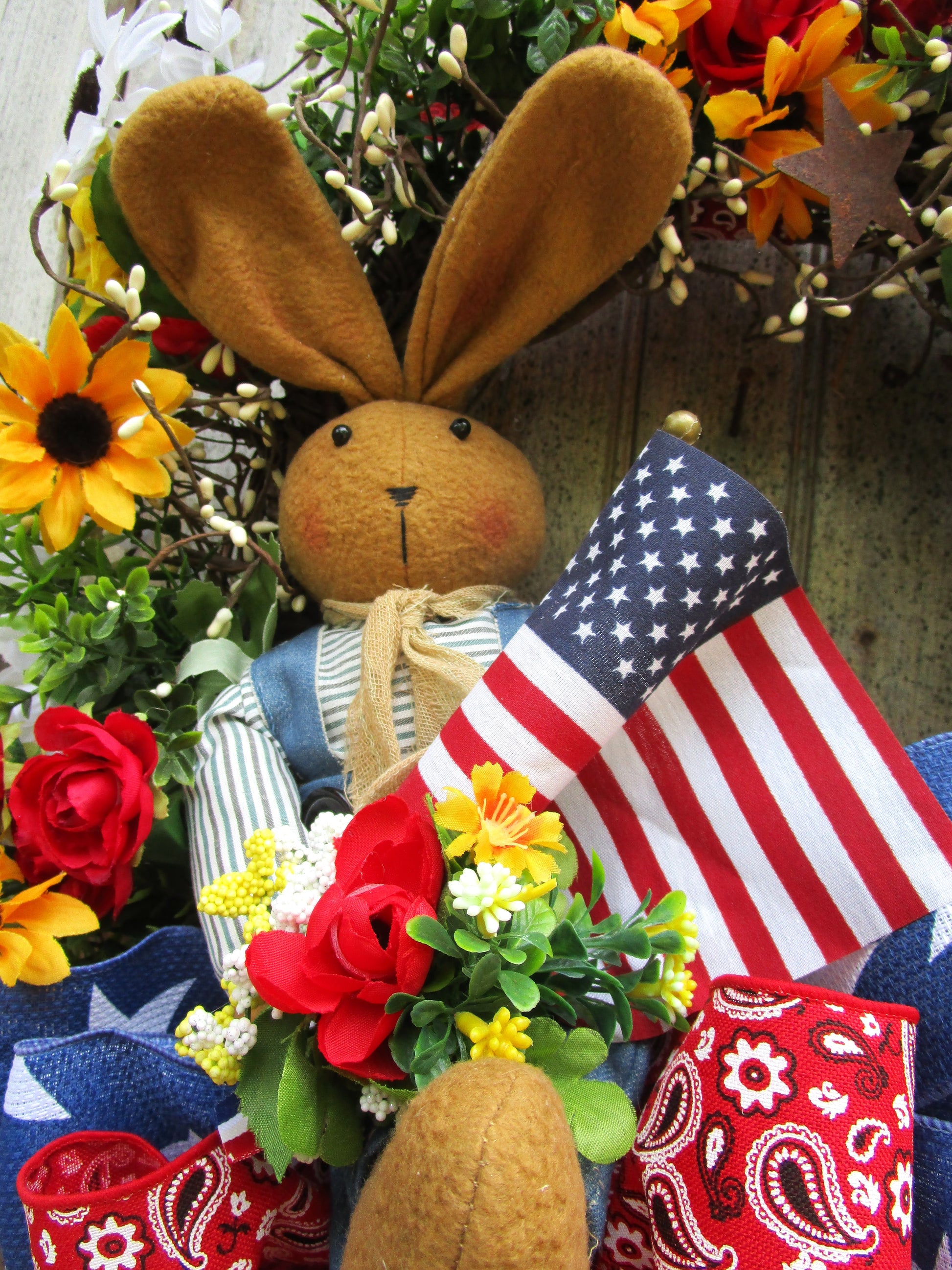 Cheerful bunny wreath featuring daisies, roses, pip berries, patriotic ribbons & American flag. Perfect for summer farmhouse or 4th of July décor.