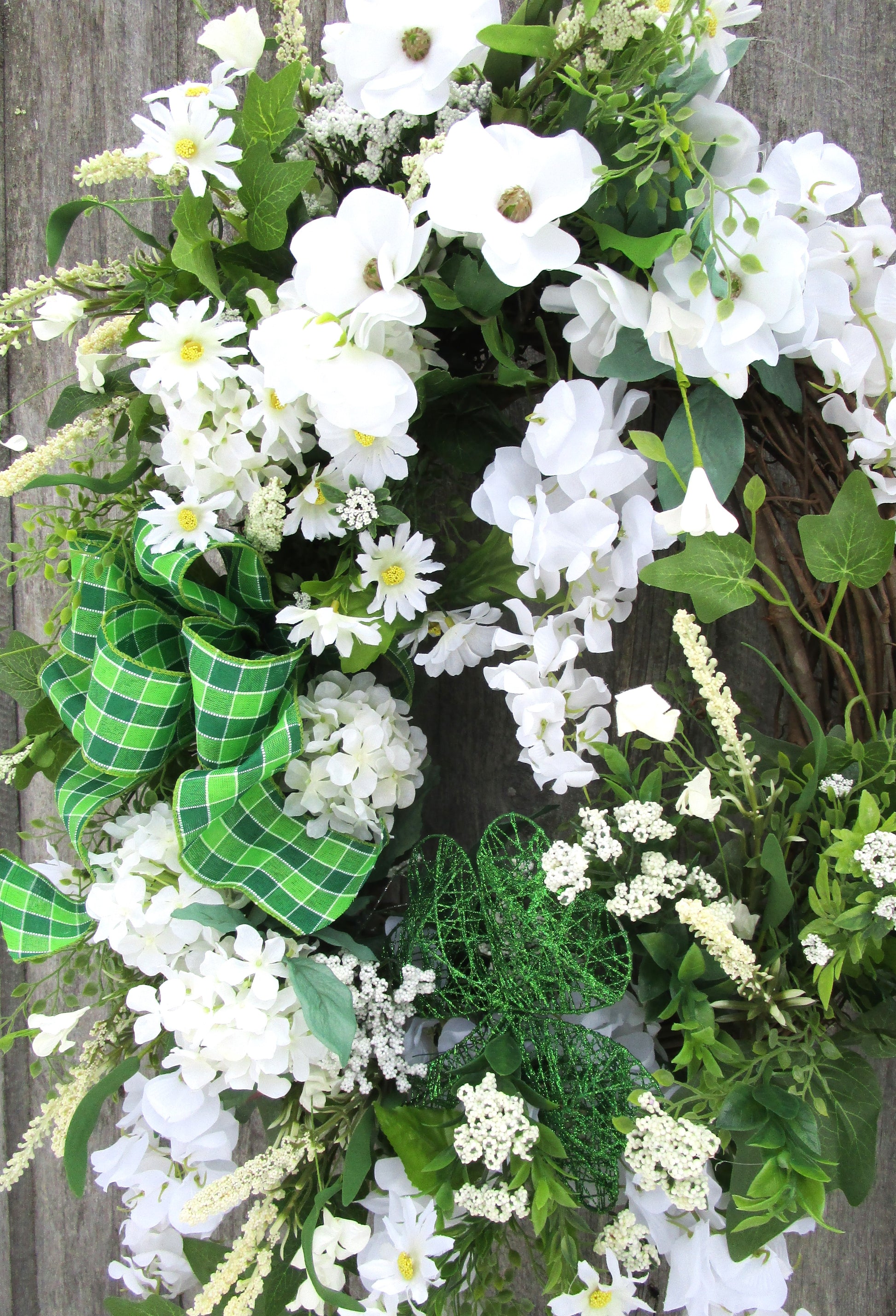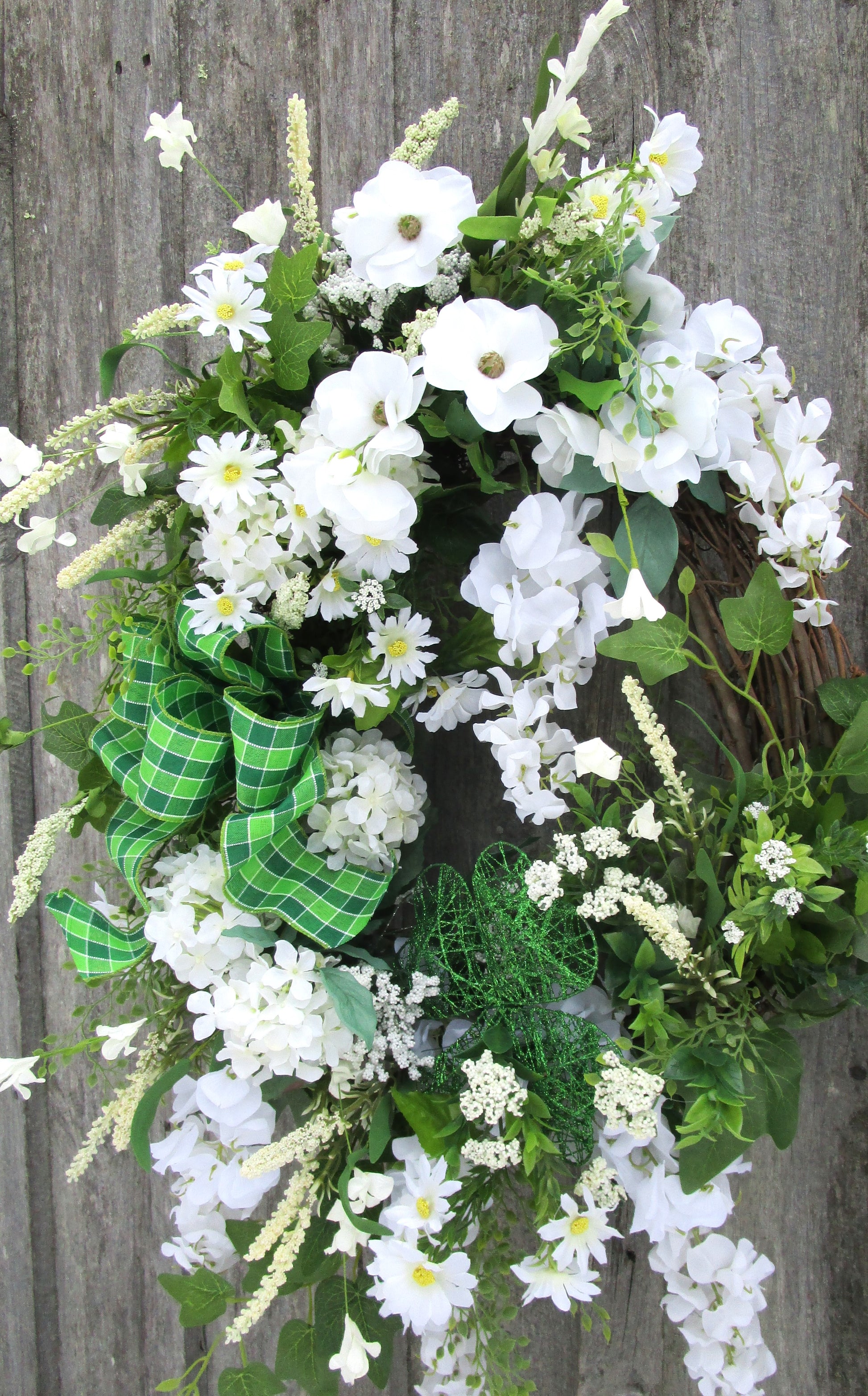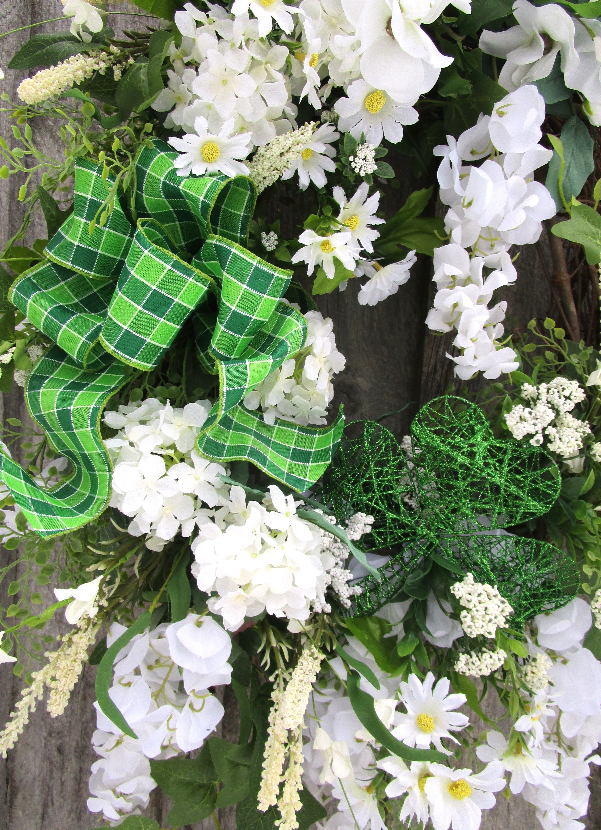 Celebrate the season with this romantic St. Patrick’s Day wreath in soft cottage colors. Faux hydrangeas, daisies, meadow grass, and lush greenery flow from a natural grapevine base, accented by a checkered green bow and a sparkling shamrock.