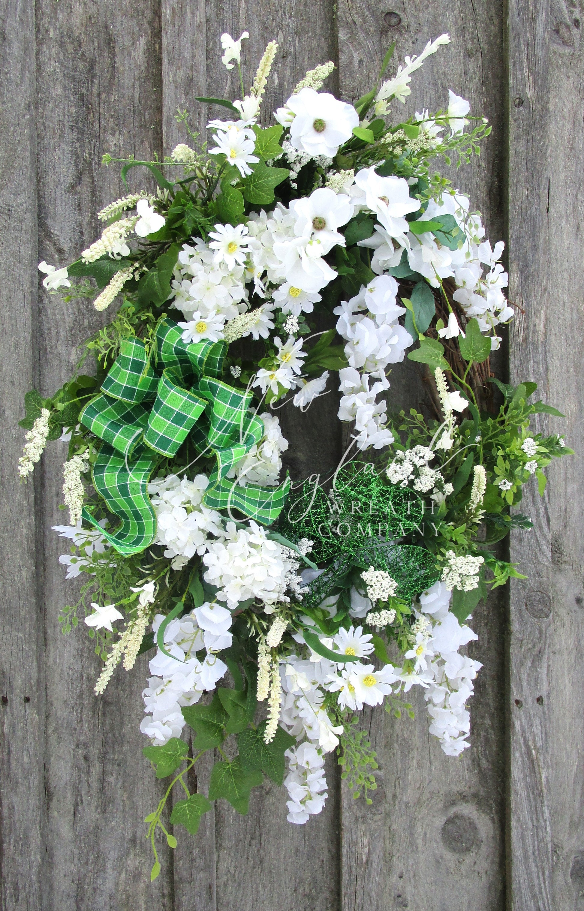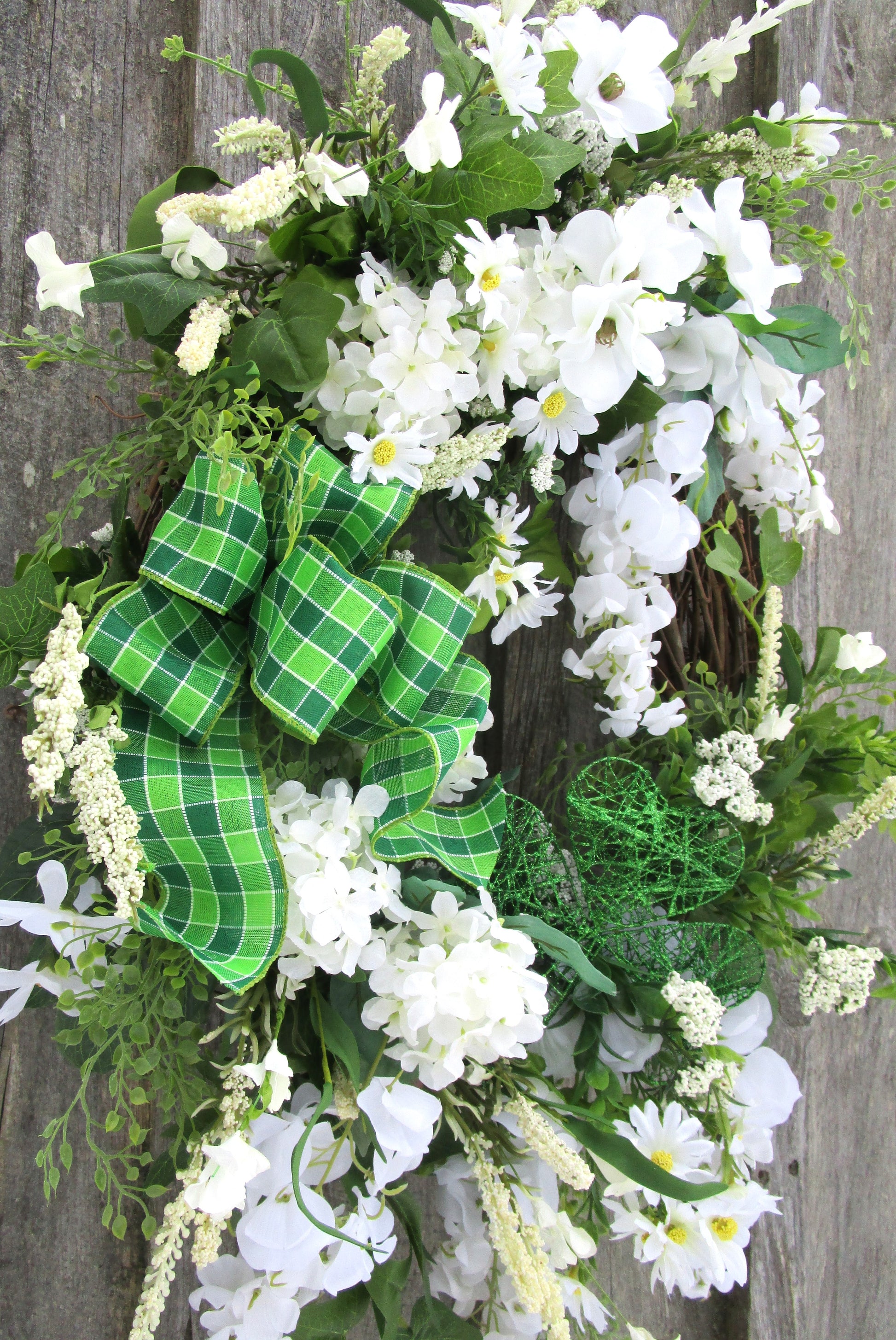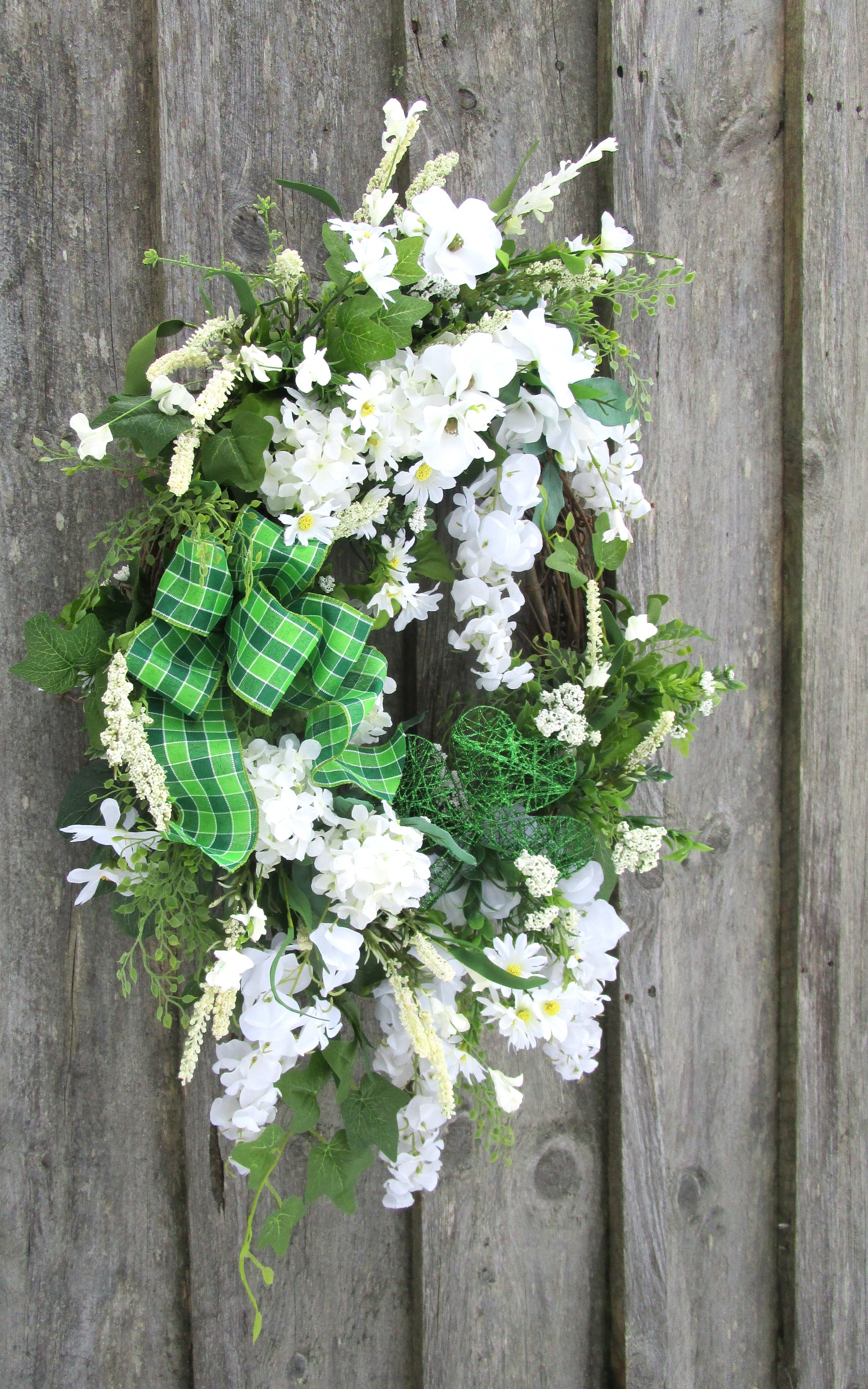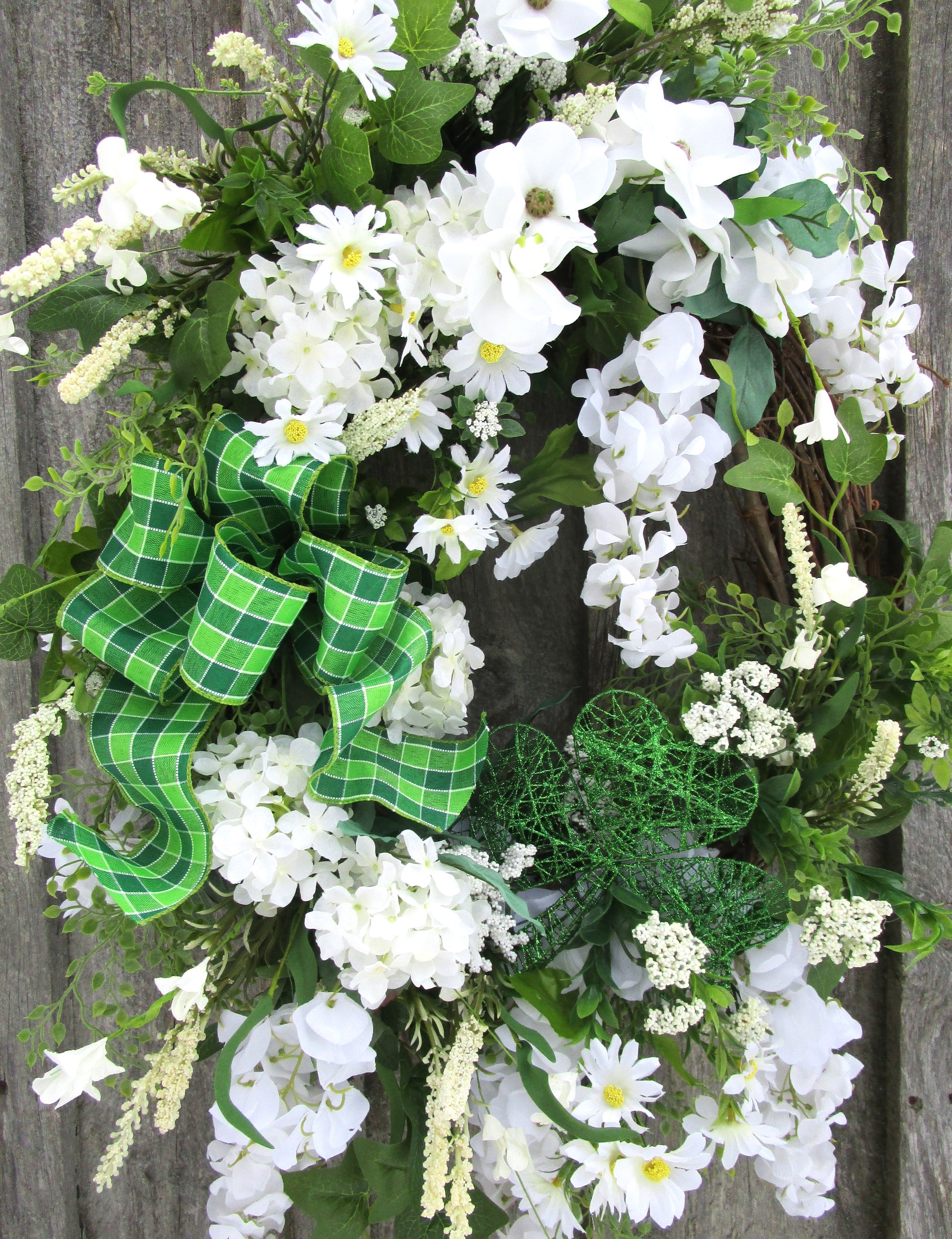 Celebrate the season with this romantic St. Patrick’s Day wreath in soft cottage colors. Faux hydrangeas, daisies, meadow grass, and lush greenery flow from a natural grapevine base, accented by a checkered green bow and a sparkling shamrock.