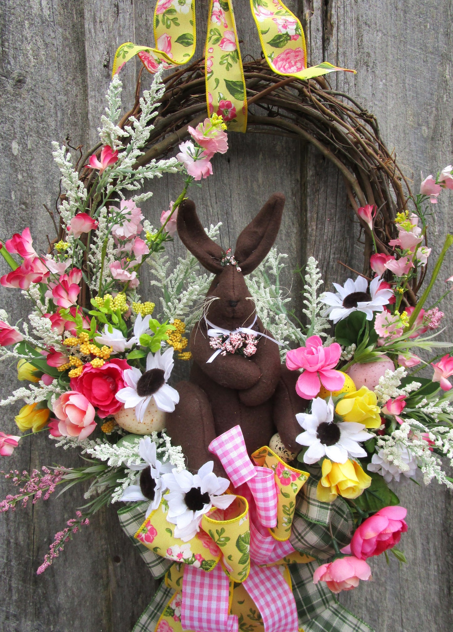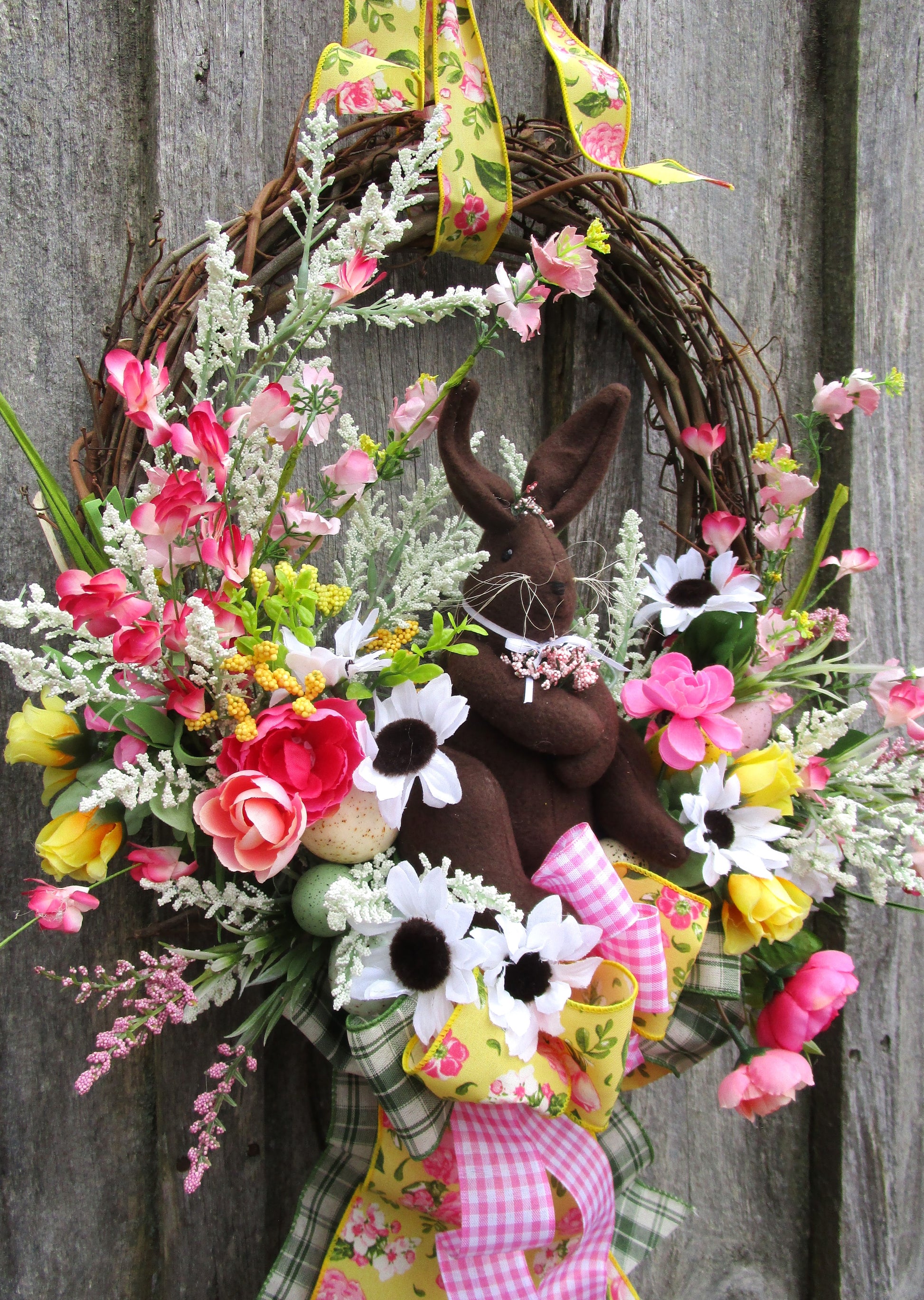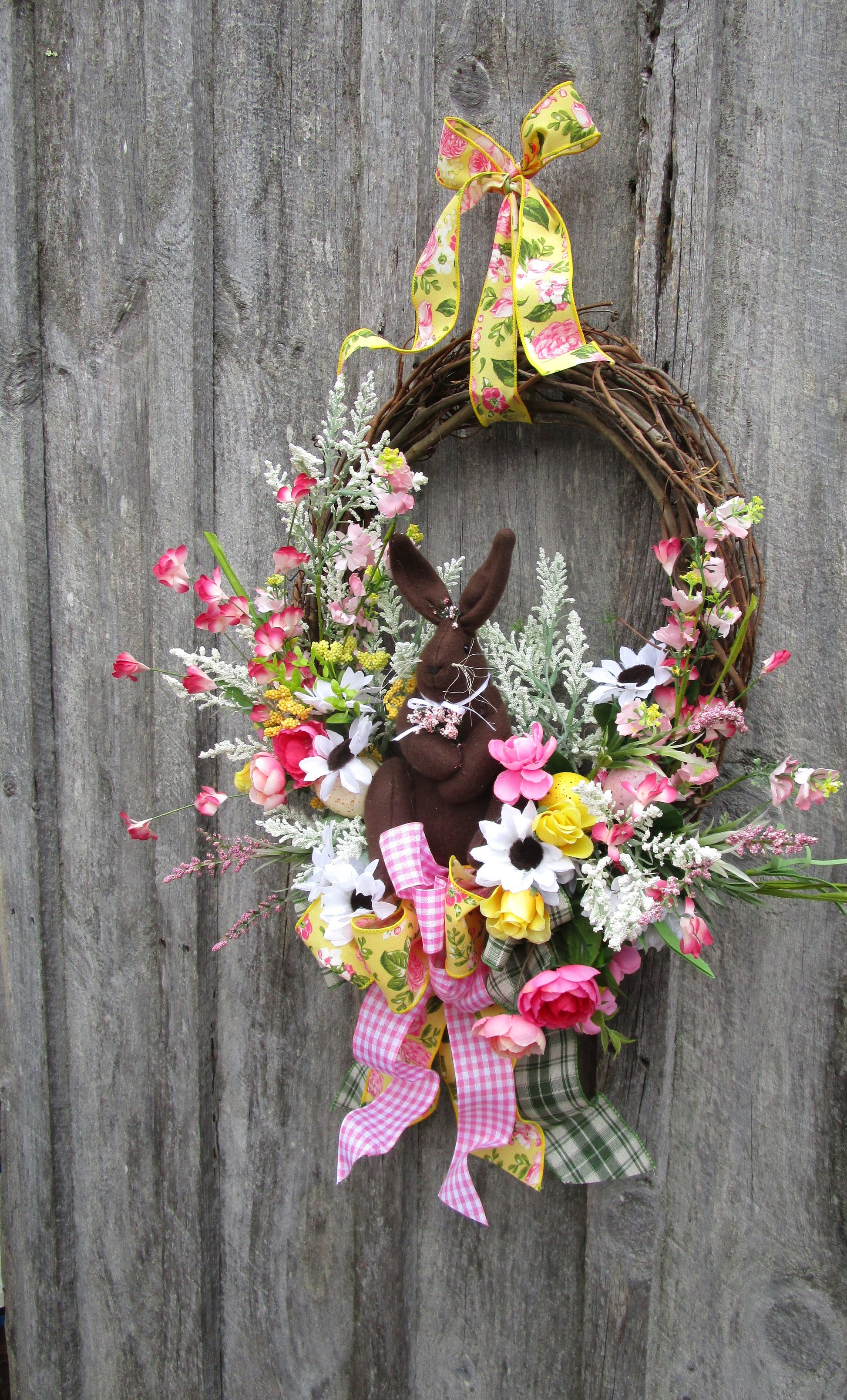 Celebrate spring with this whimsical Easter wreath featuring a chocolate brown bunny, lush pastel florals, a yellow floral hanger bow, and a layered gingham and floral print bow.