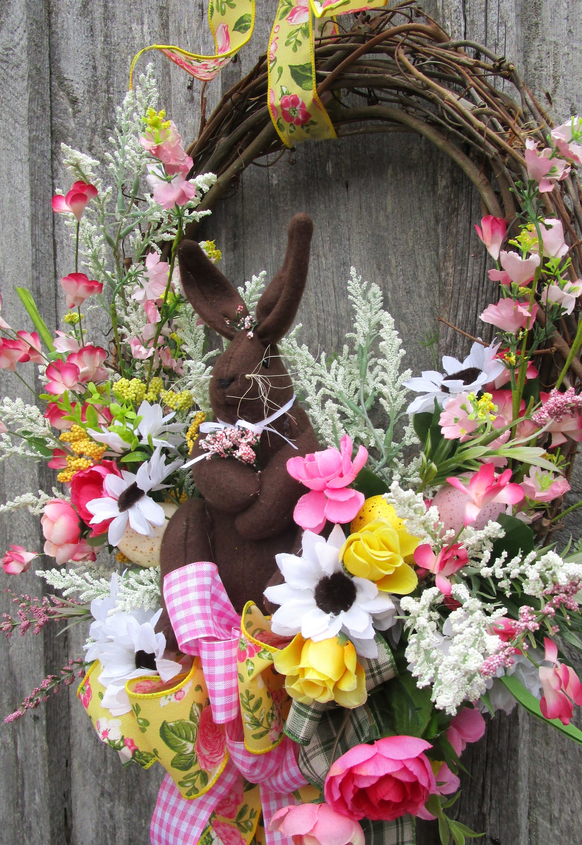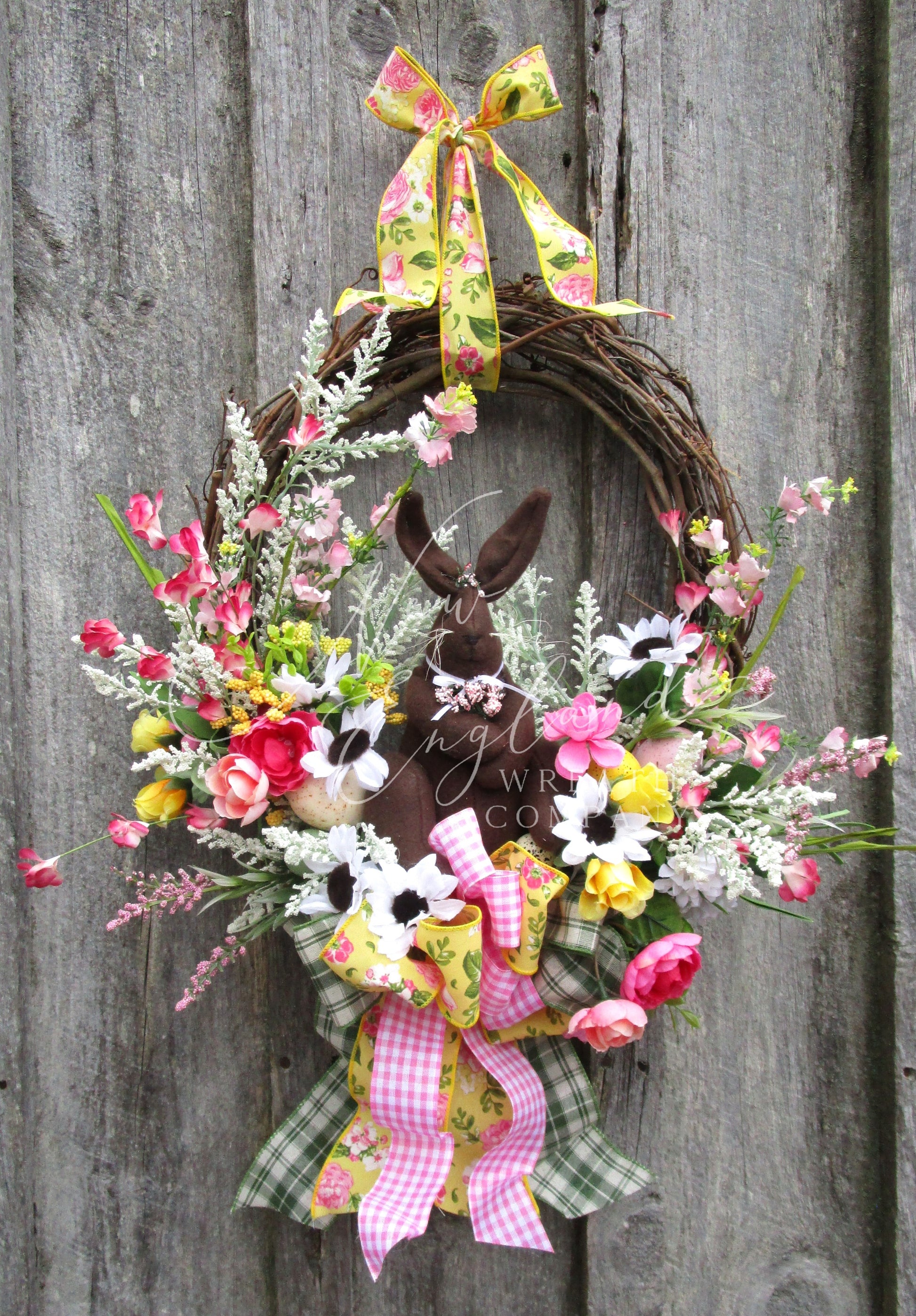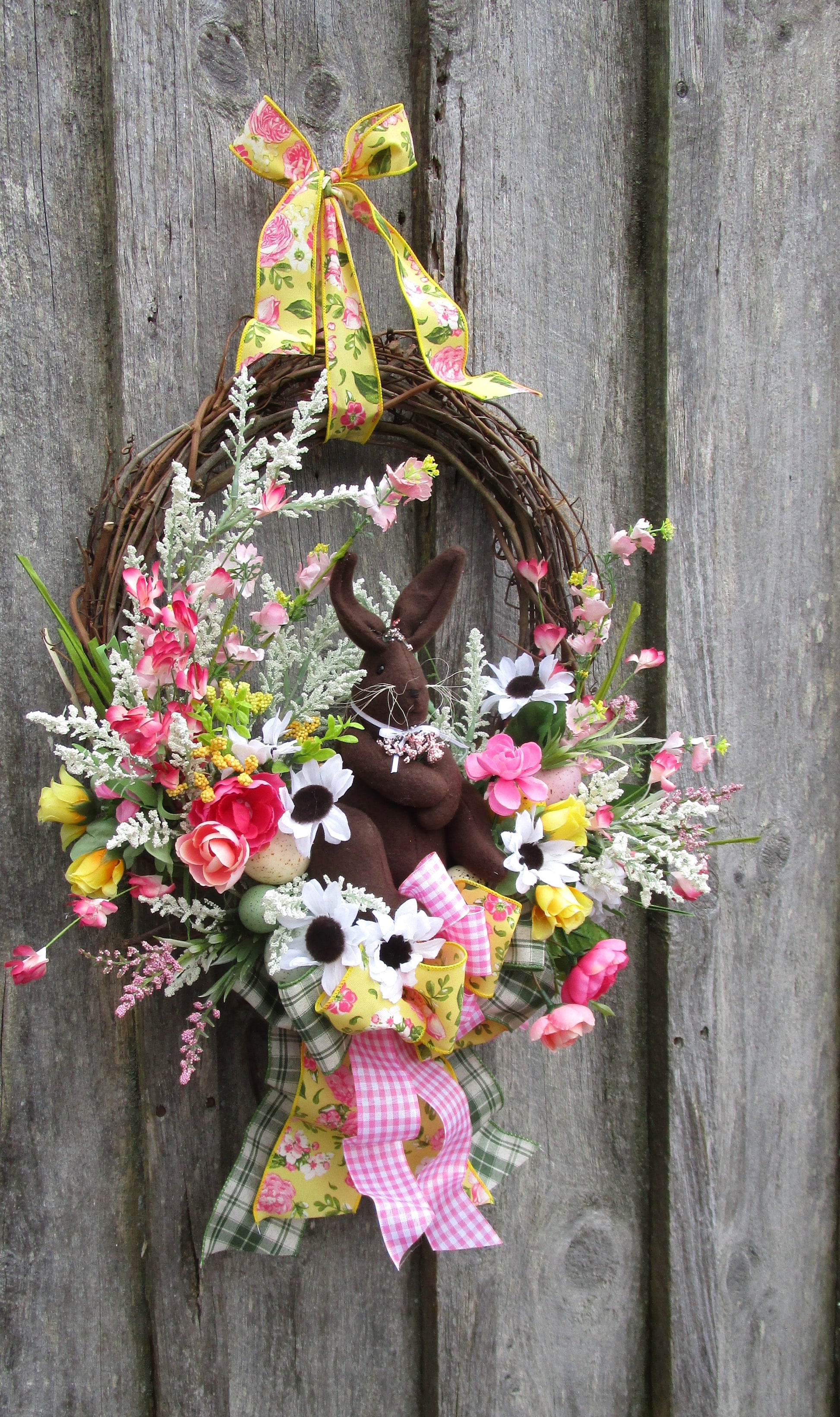 Celebrate spring with this whimsical Easter wreath featuring a chocolate brown bunny, lush pastel florals, a yellow floral hanger bow, and a layered gingham and floral print bow.