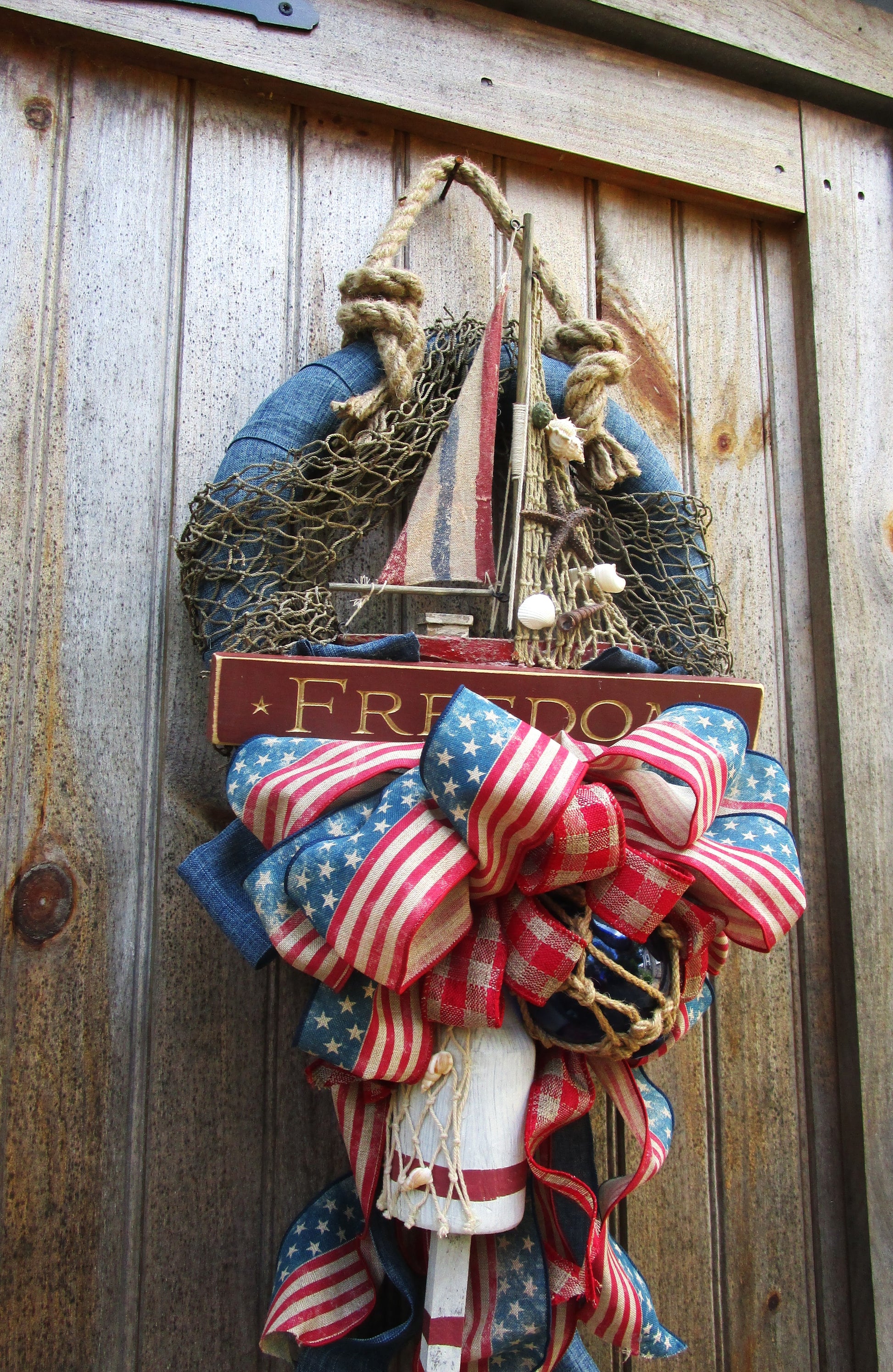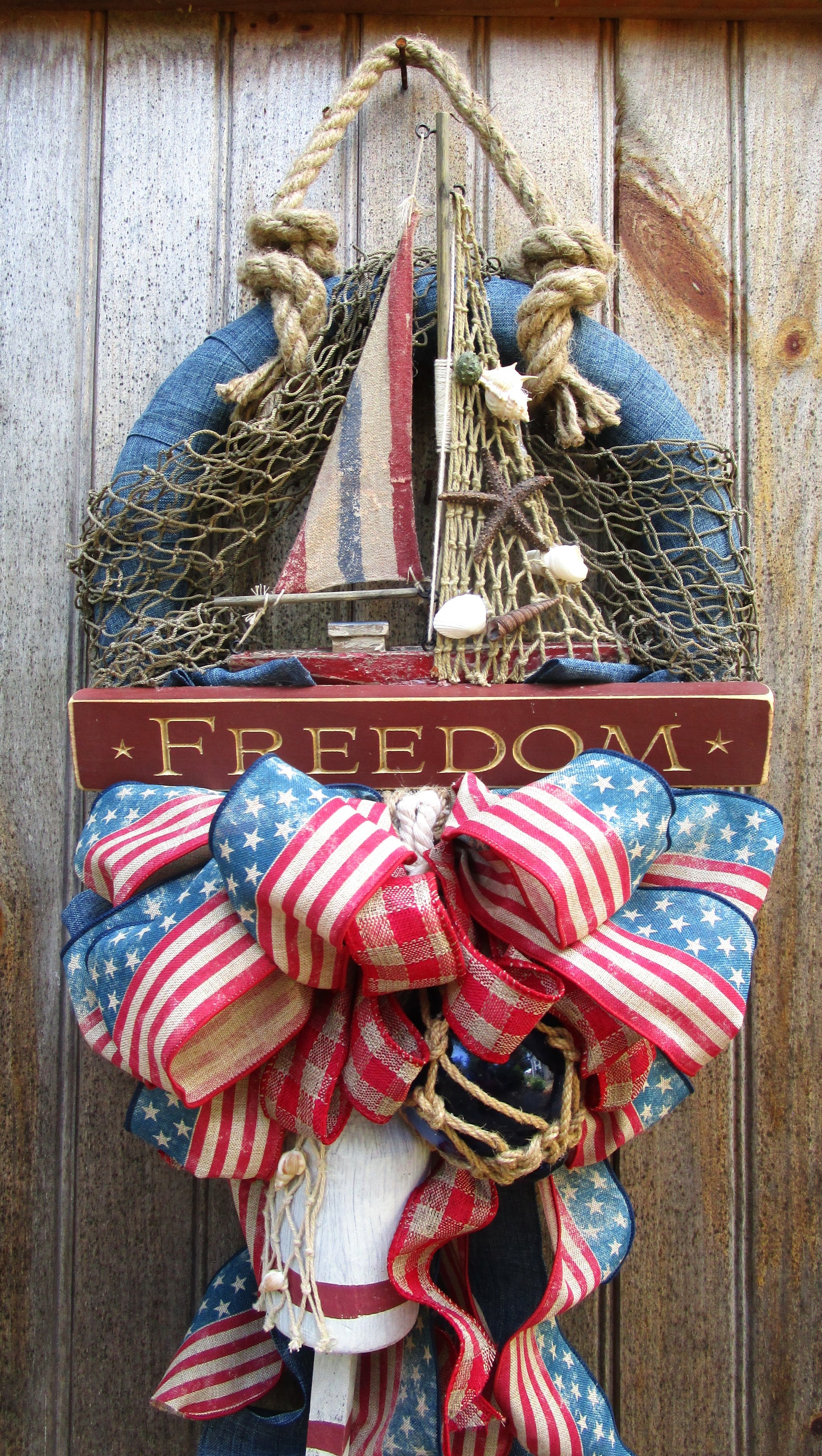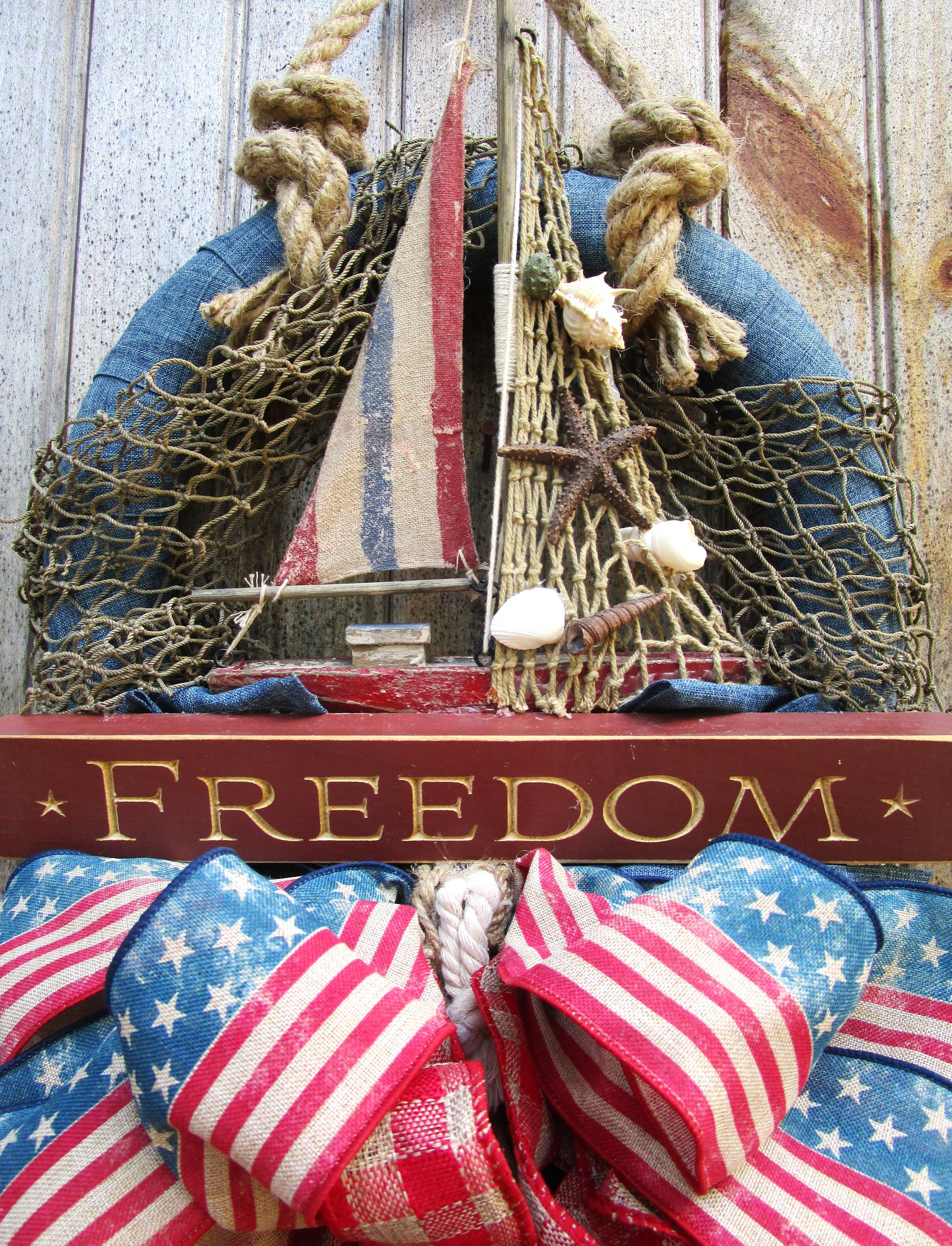 Nautical Americana wreath with rustic sailboat, fishing net, FREEDOM sign, patriotic ribbon bow, buoy & glass float. Perfect for coastal summer décor.