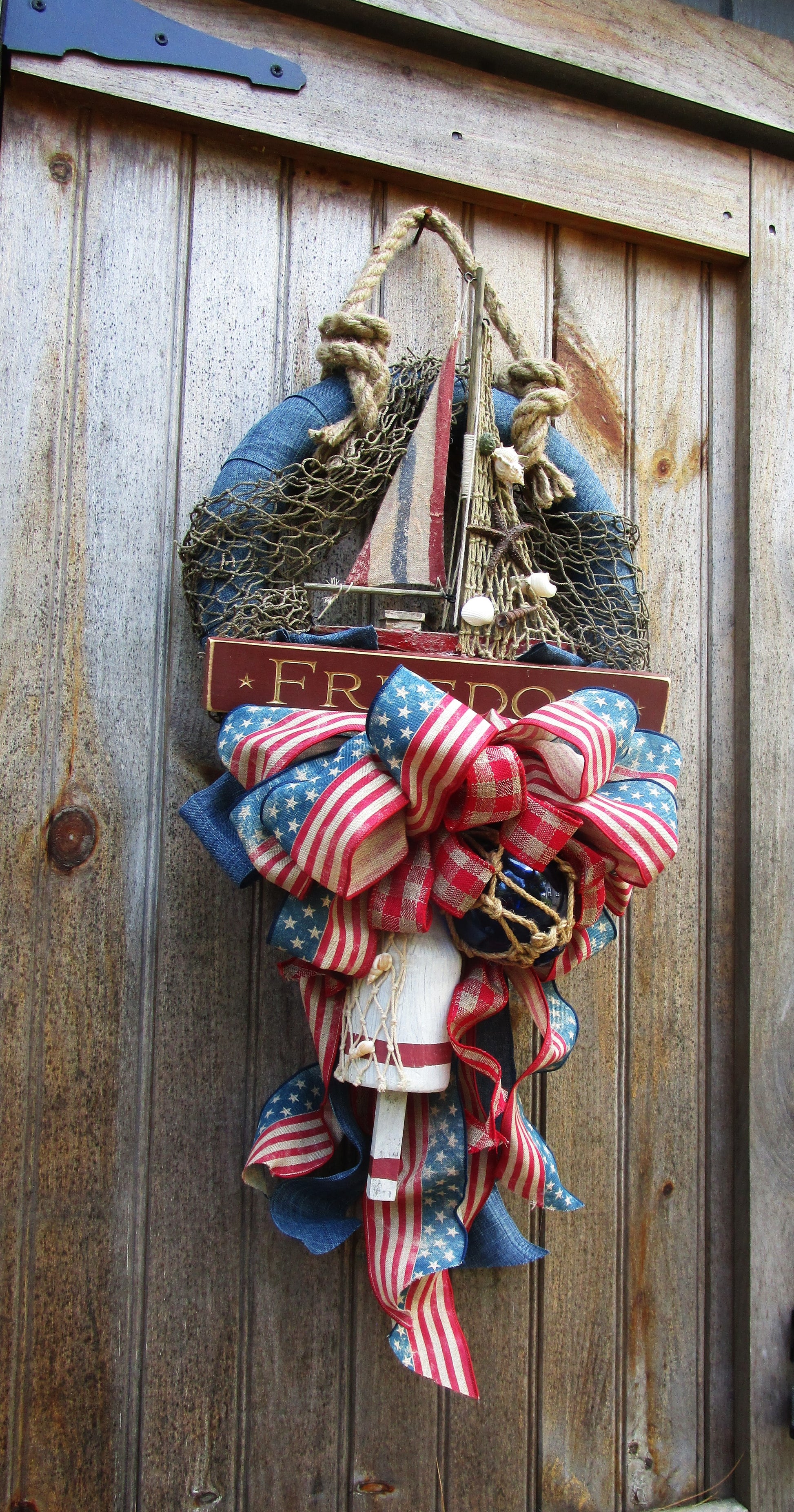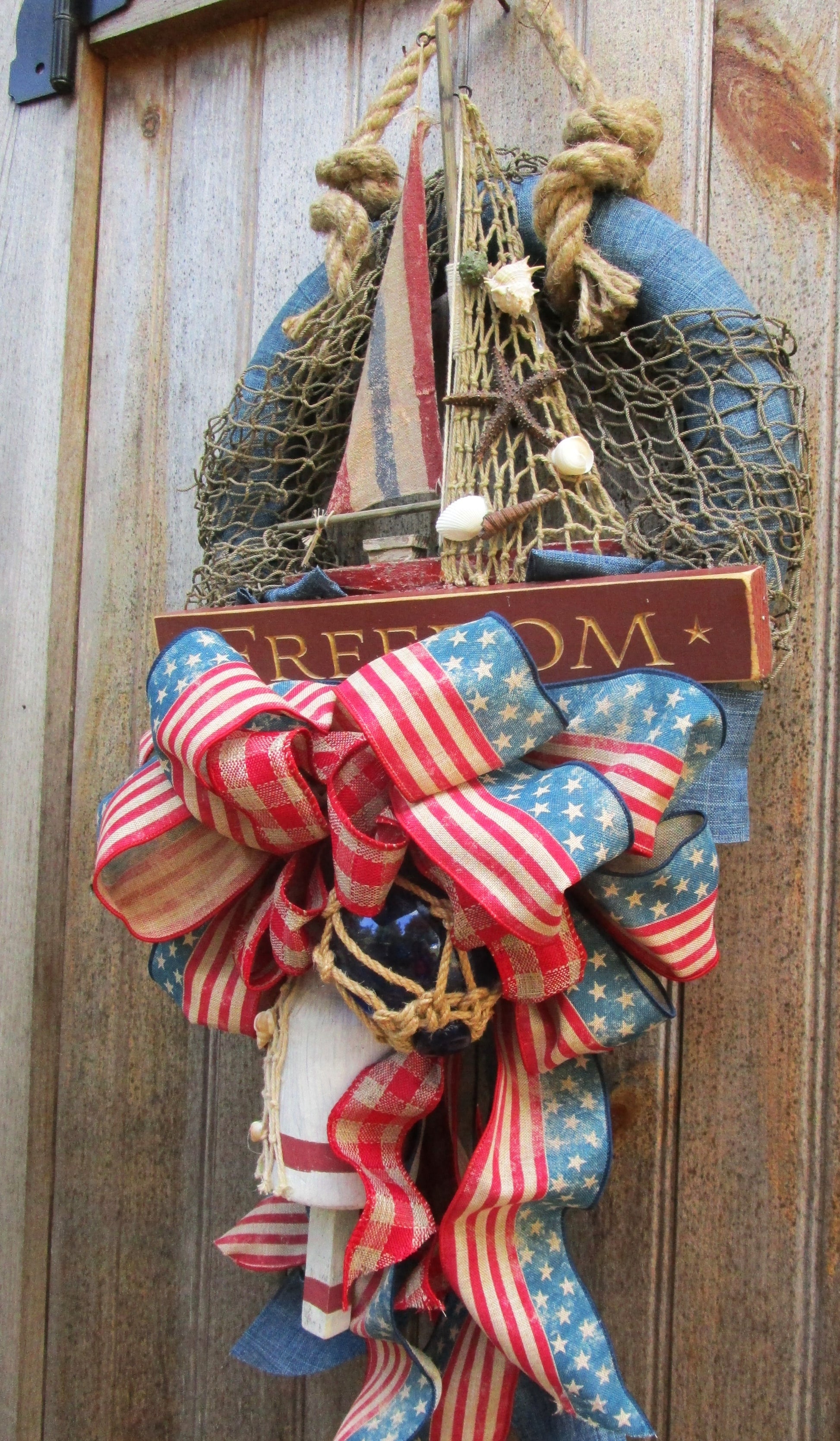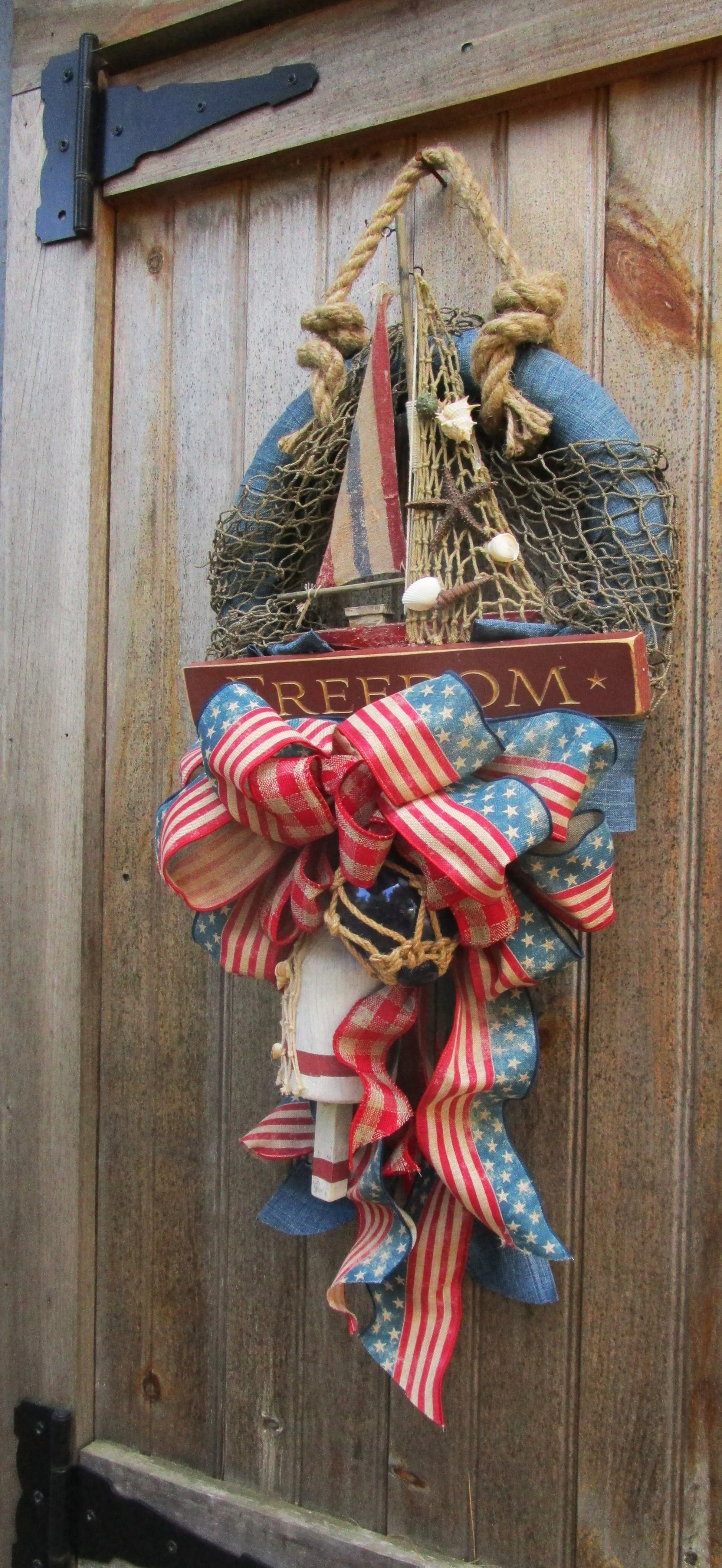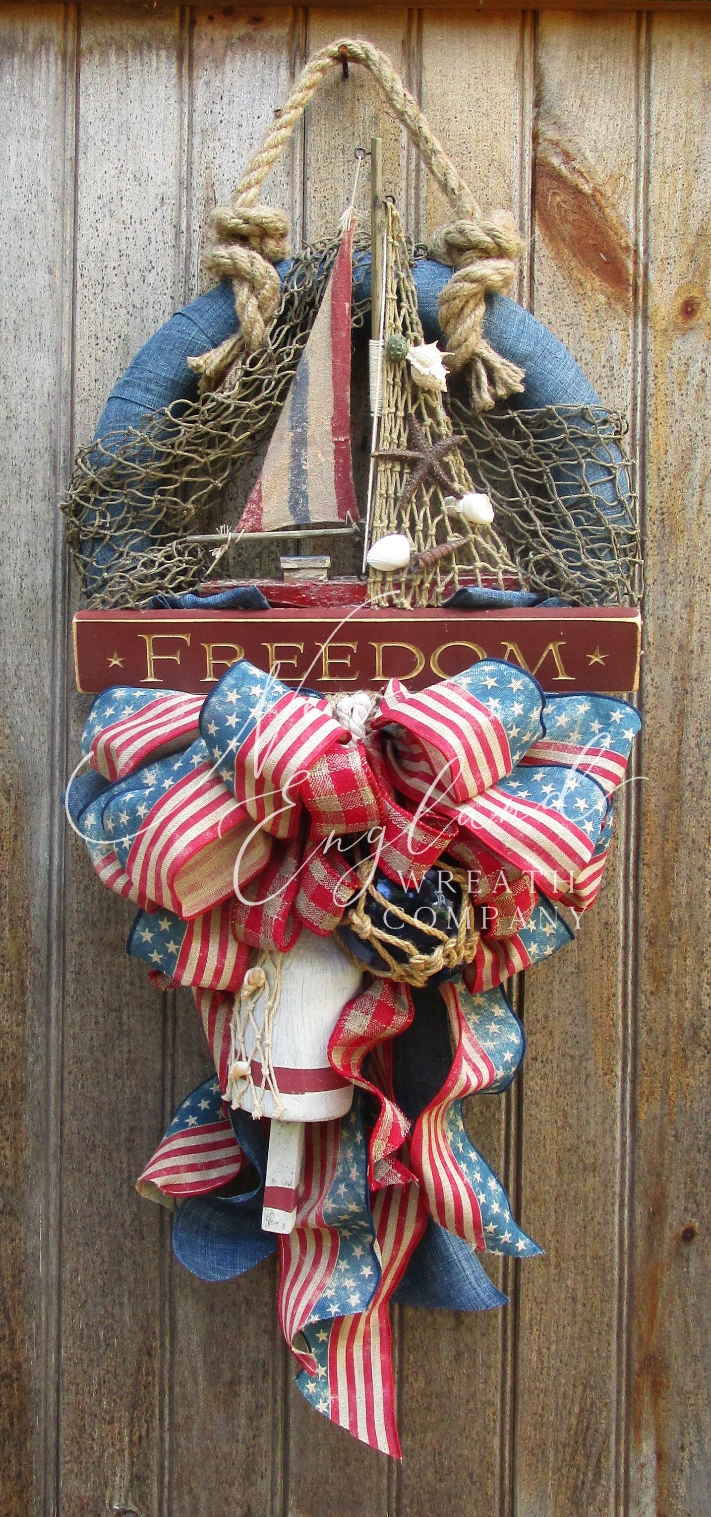 Nautical Americana wreath with rustic sailboat, fishing net, FREEDOM sign, patriotic ribbon bow, buoy & glass float. Perfect for coastal summer décor.