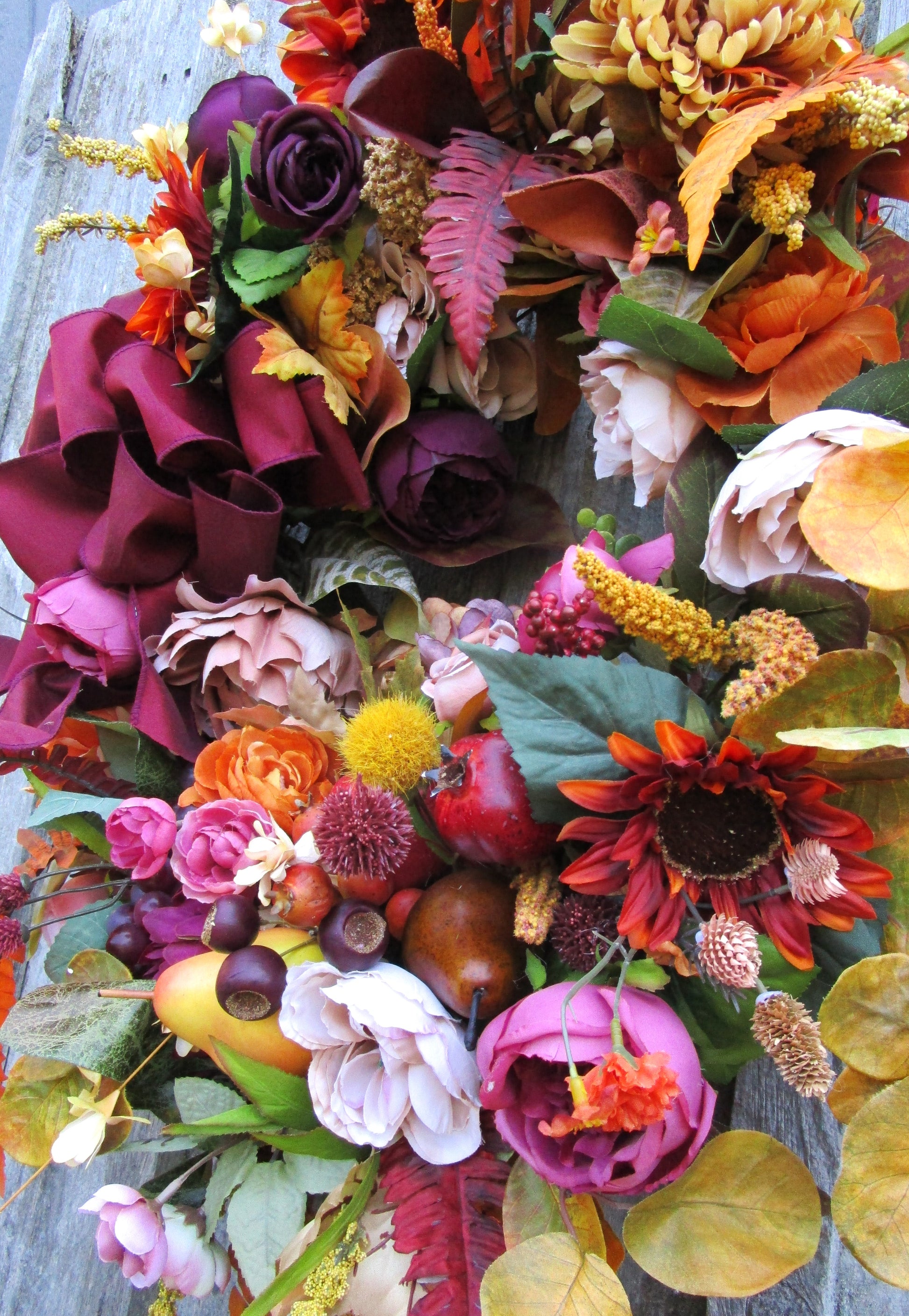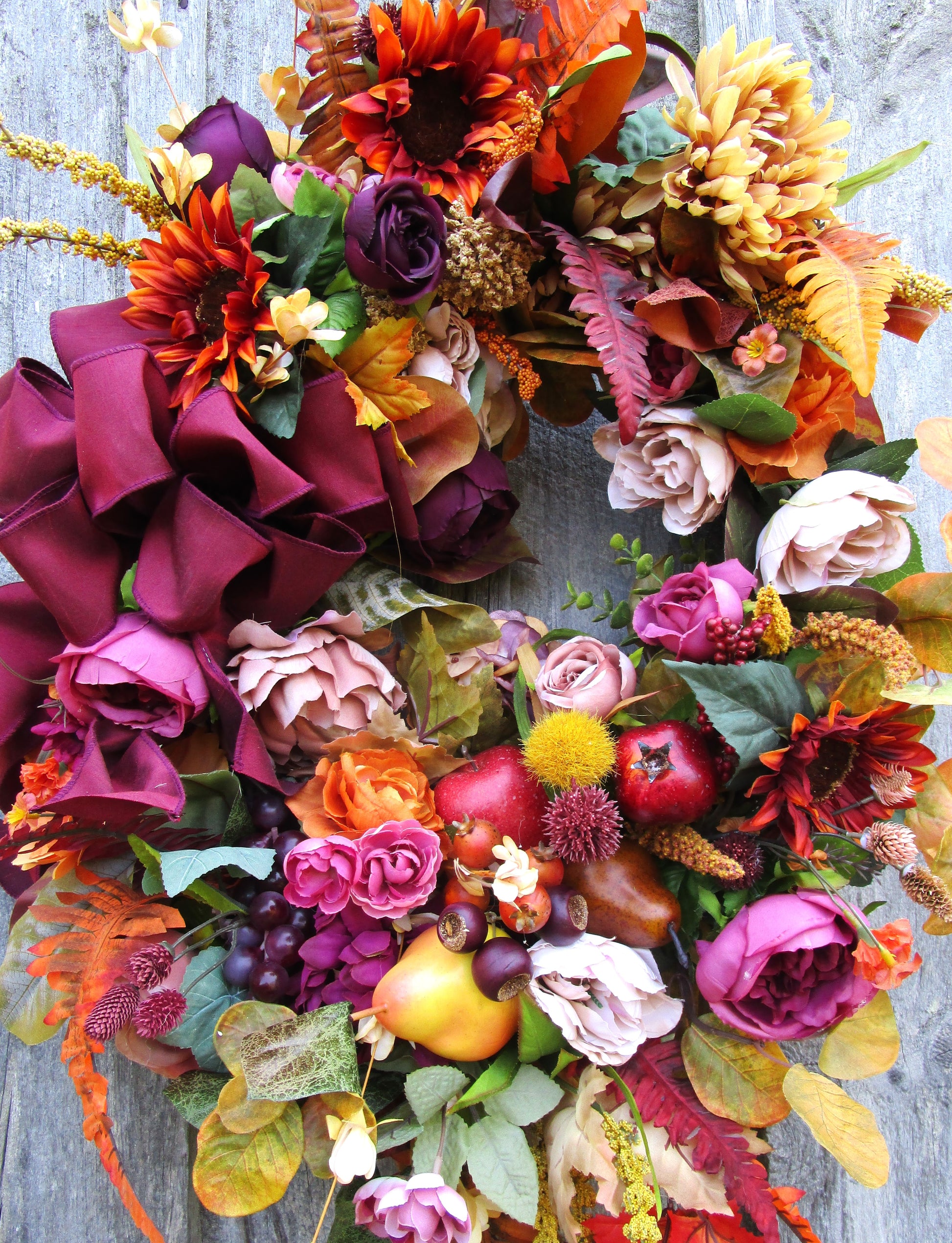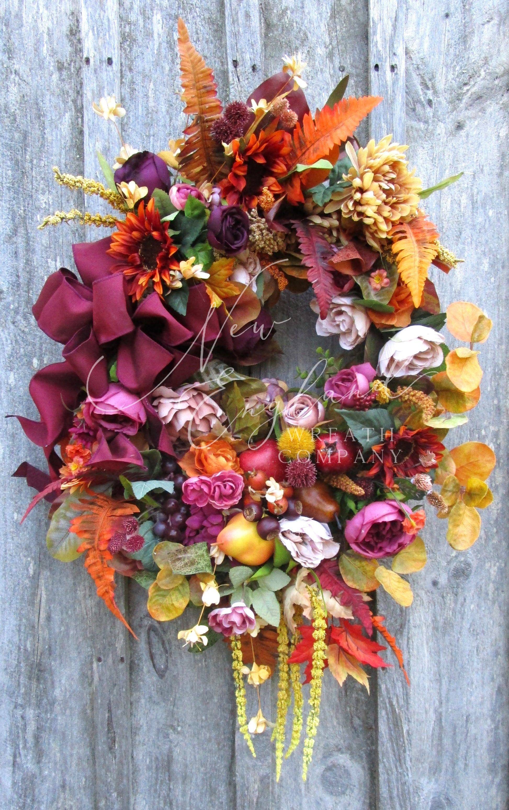 A richly layered fall wreath featuring deep wine florals, fruits, and foliage in a vibrant harvest palette. A grand and elegant seasonal statement piece.