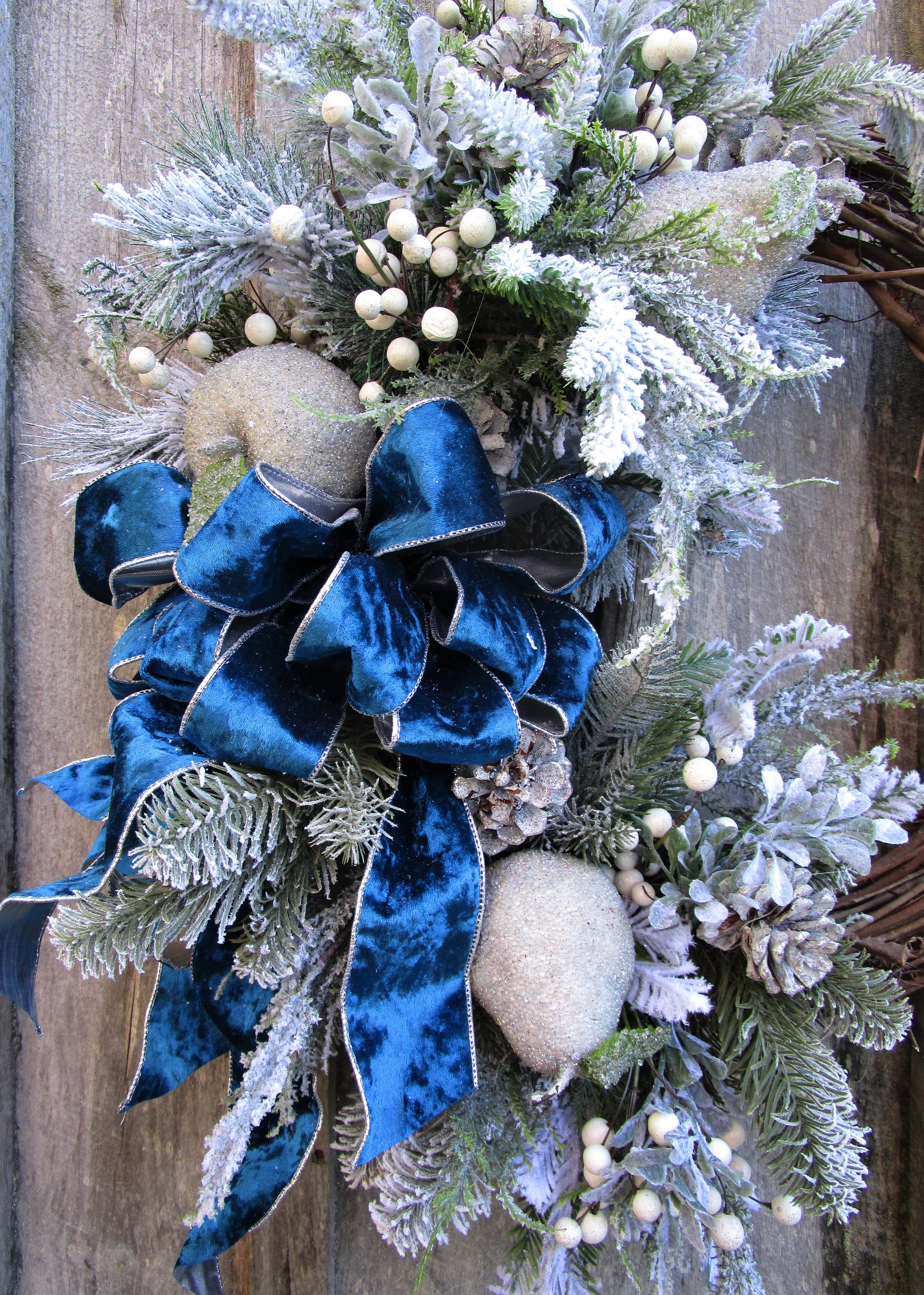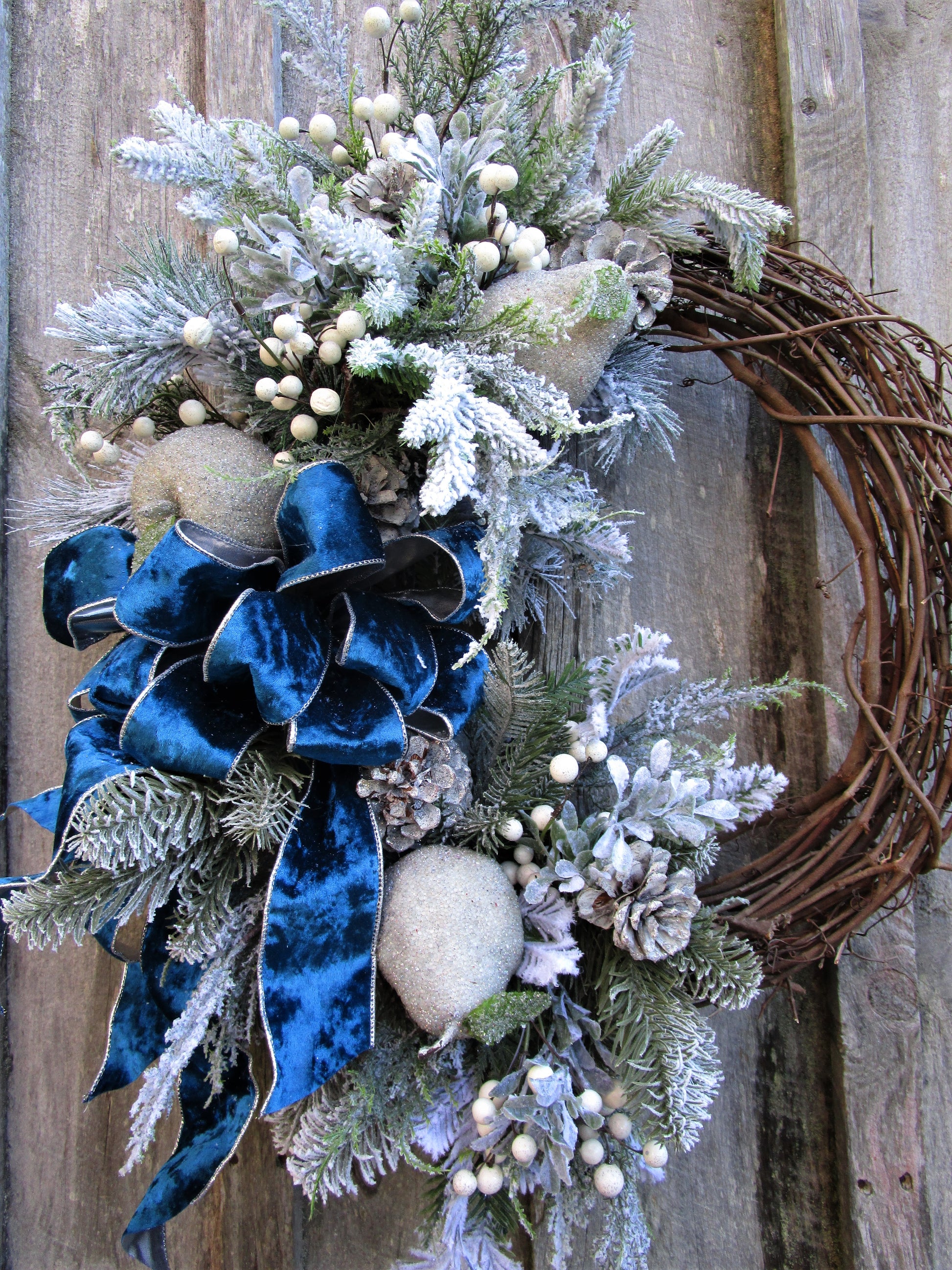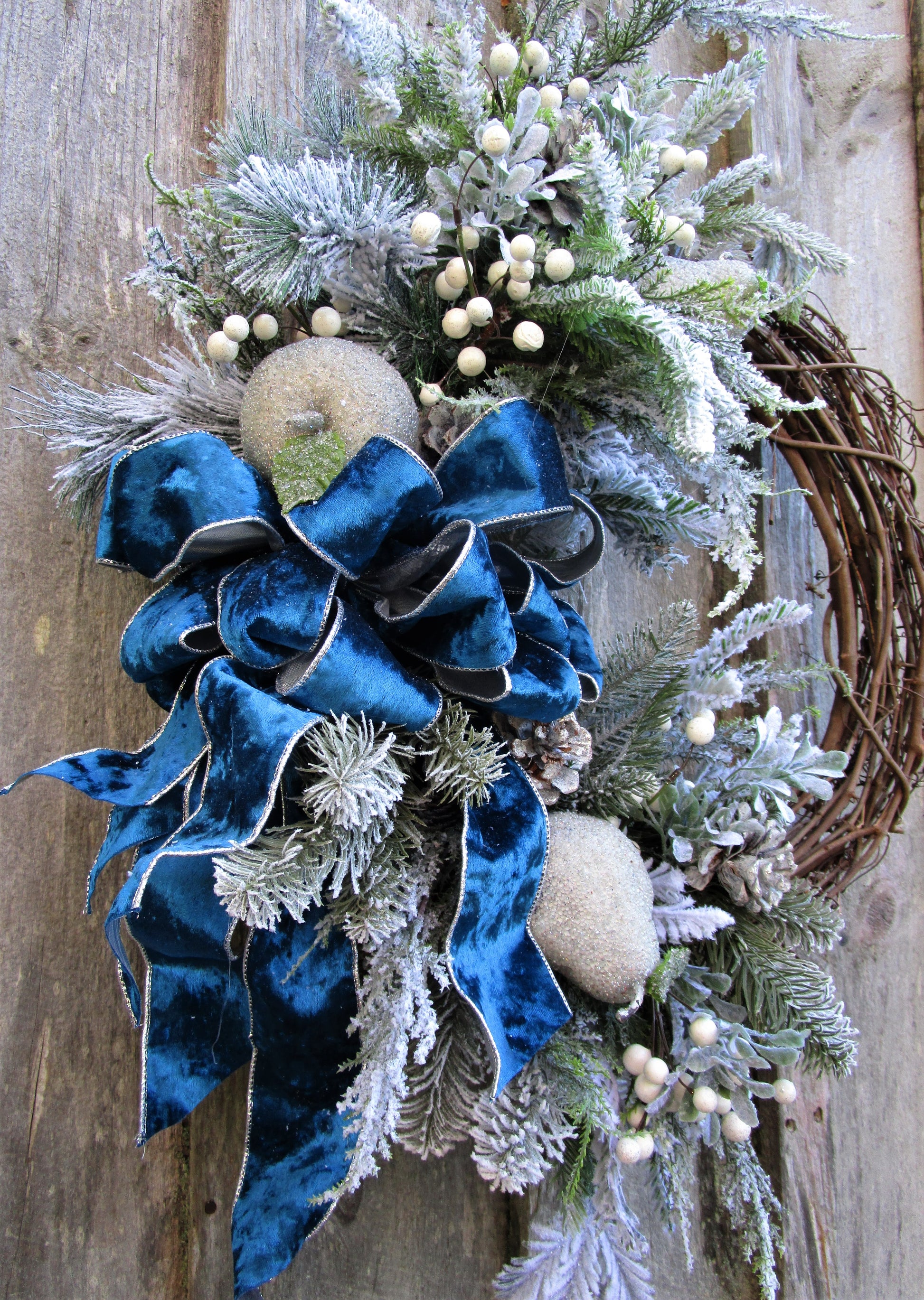 Elegant winter wreath with frosted pine, jeweled fruit, velvet bow, and sparkling white accents. Perfect for upscale seasonal décor.