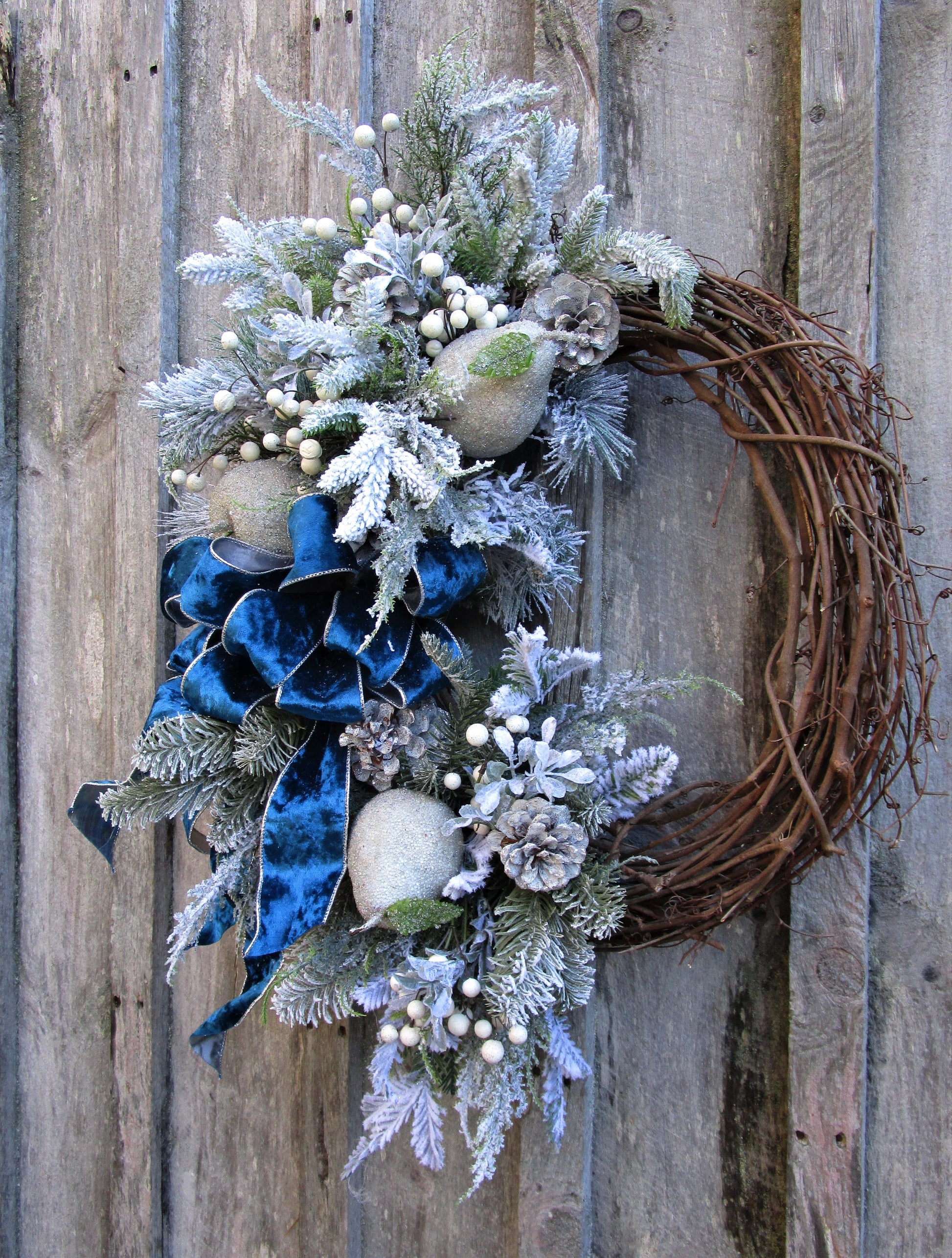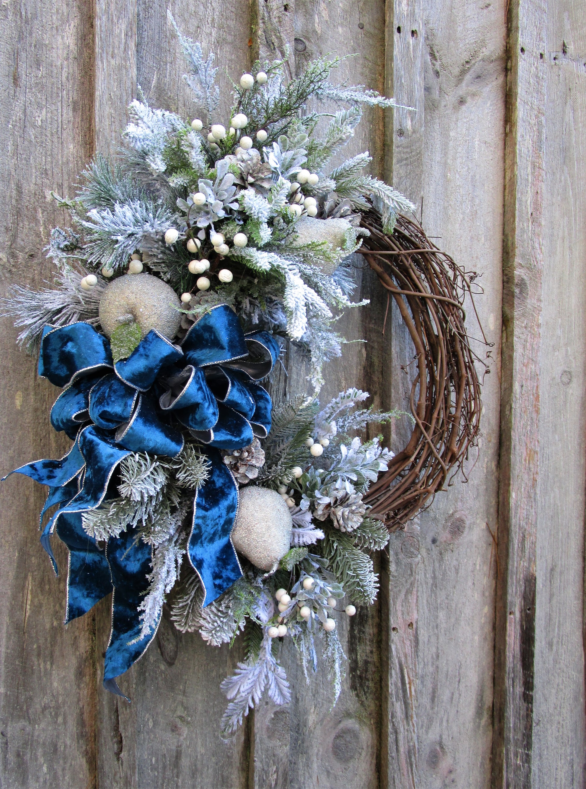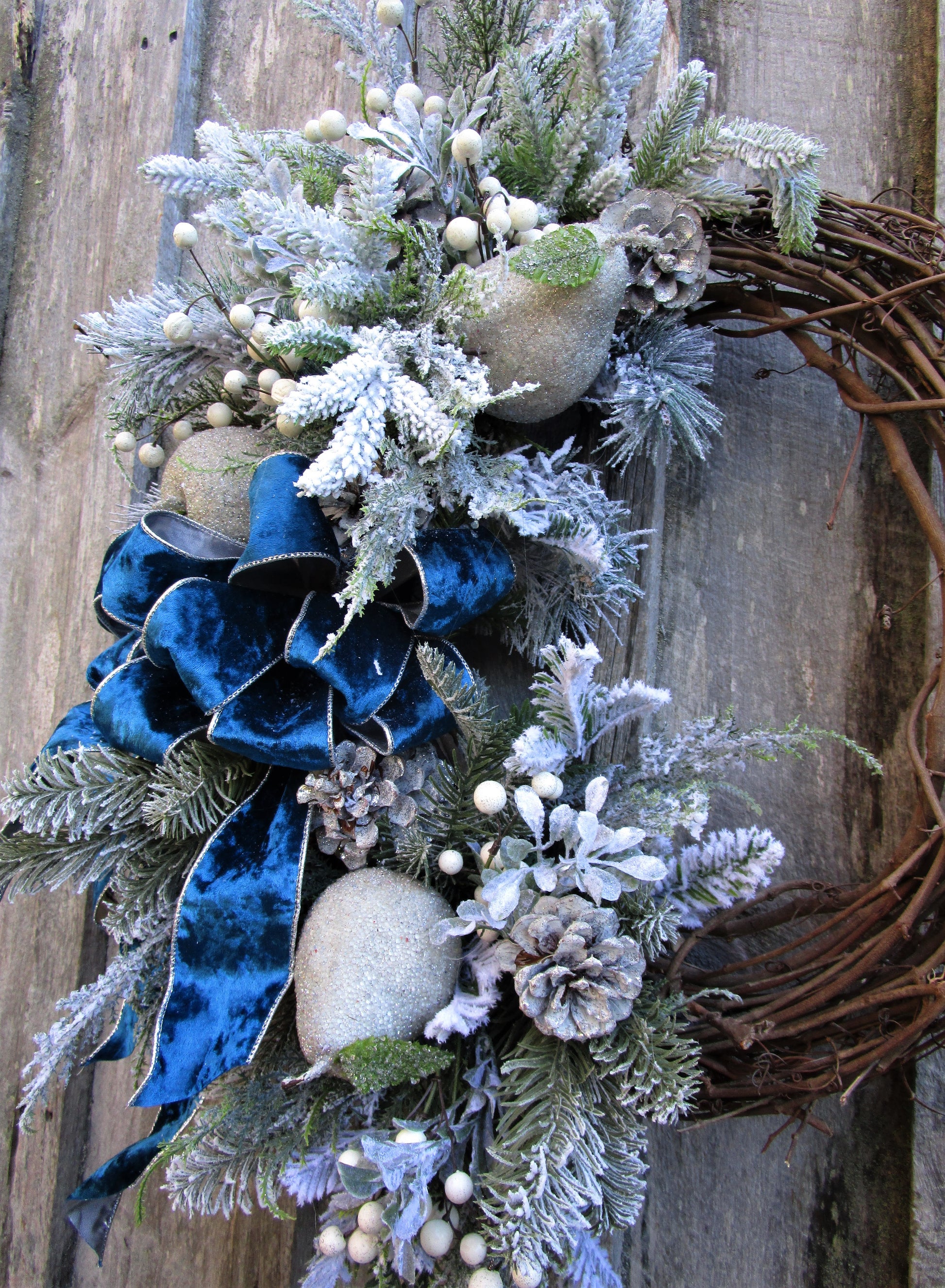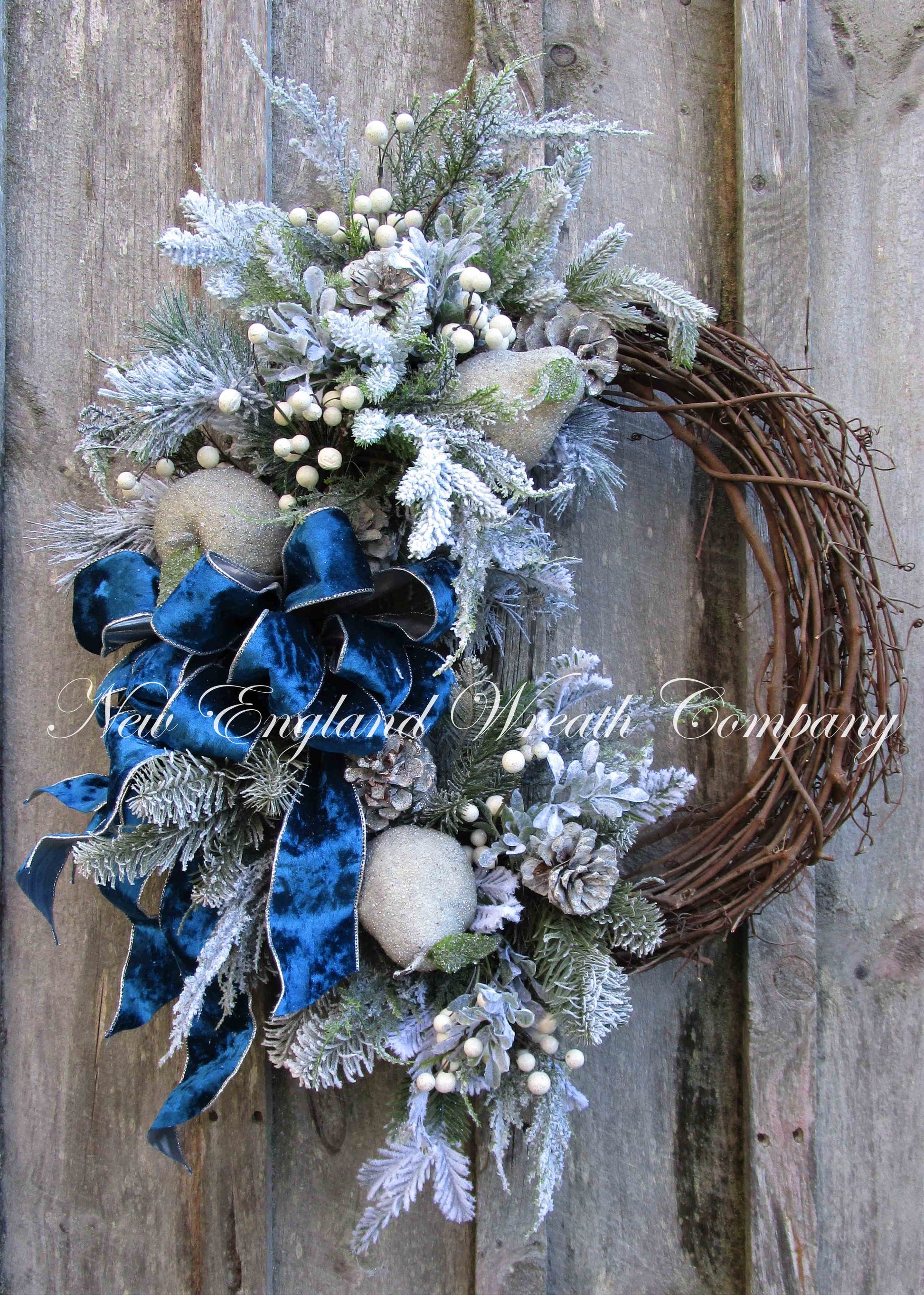 Elegant winter wreath with frosted pine, jeweled fruit, velvet bow, and sparkling white accents. Perfect for upscale seasonal décor.
