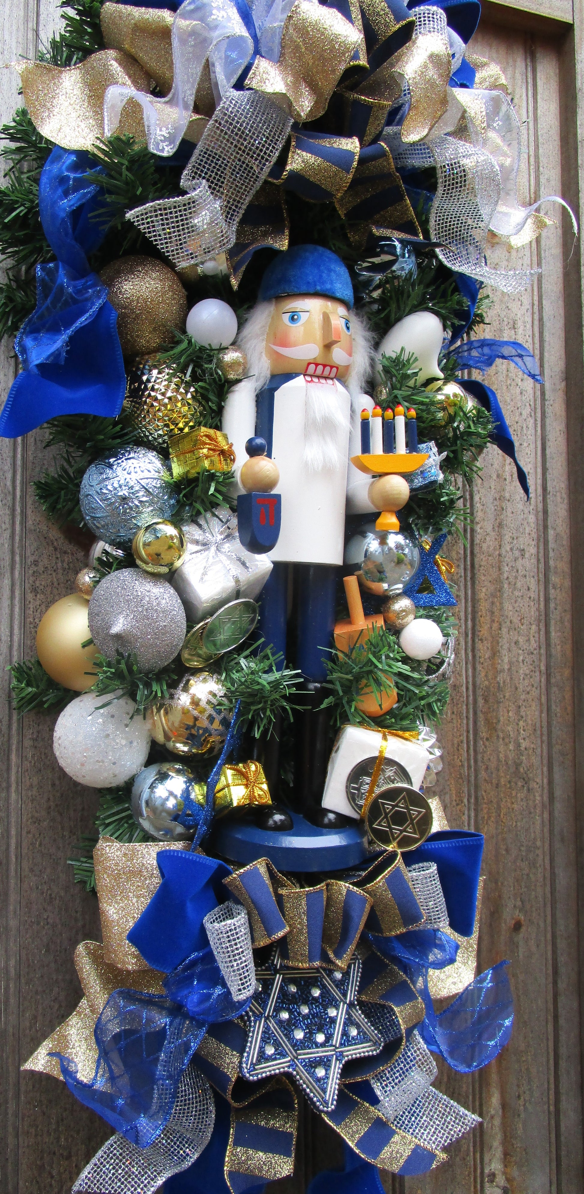 Celebrate the Festival of Lights with elegance and charm. This lush evergreen swag features a hand-painted 14” nutcracker with menorah and dreidel, surrounded by shimmering silver, gold, and blue ornaments, Hanukkah coins, gifts, and sparkling details. Layered bows in royal blue velvet, striped navy, gold, and silver mesh add festive luxury. Finished with a glittered Star of David. A show-stopping piece perfect for doorways, mantels, or gifting.