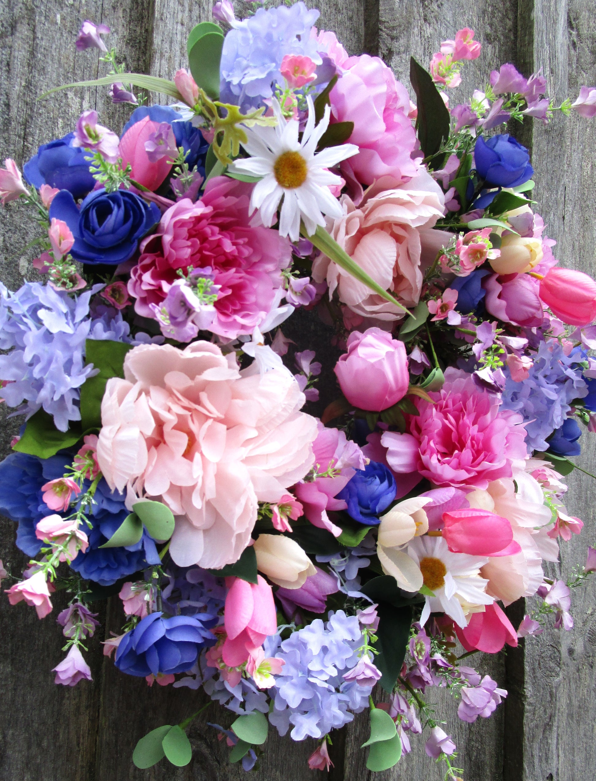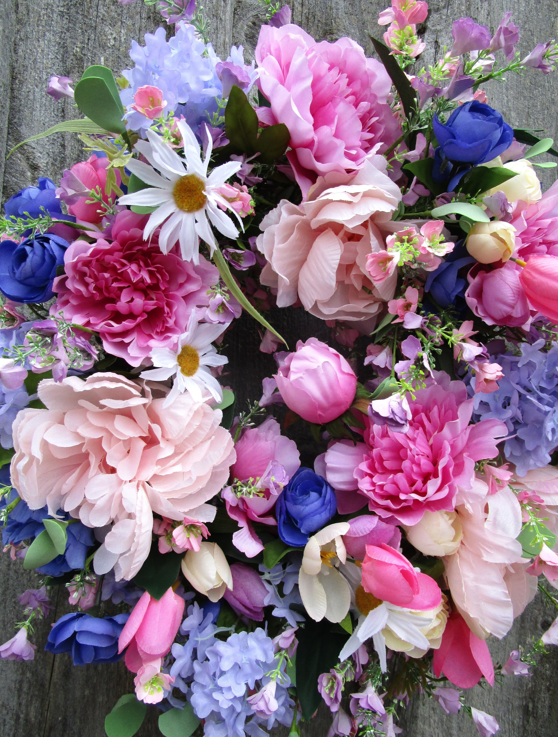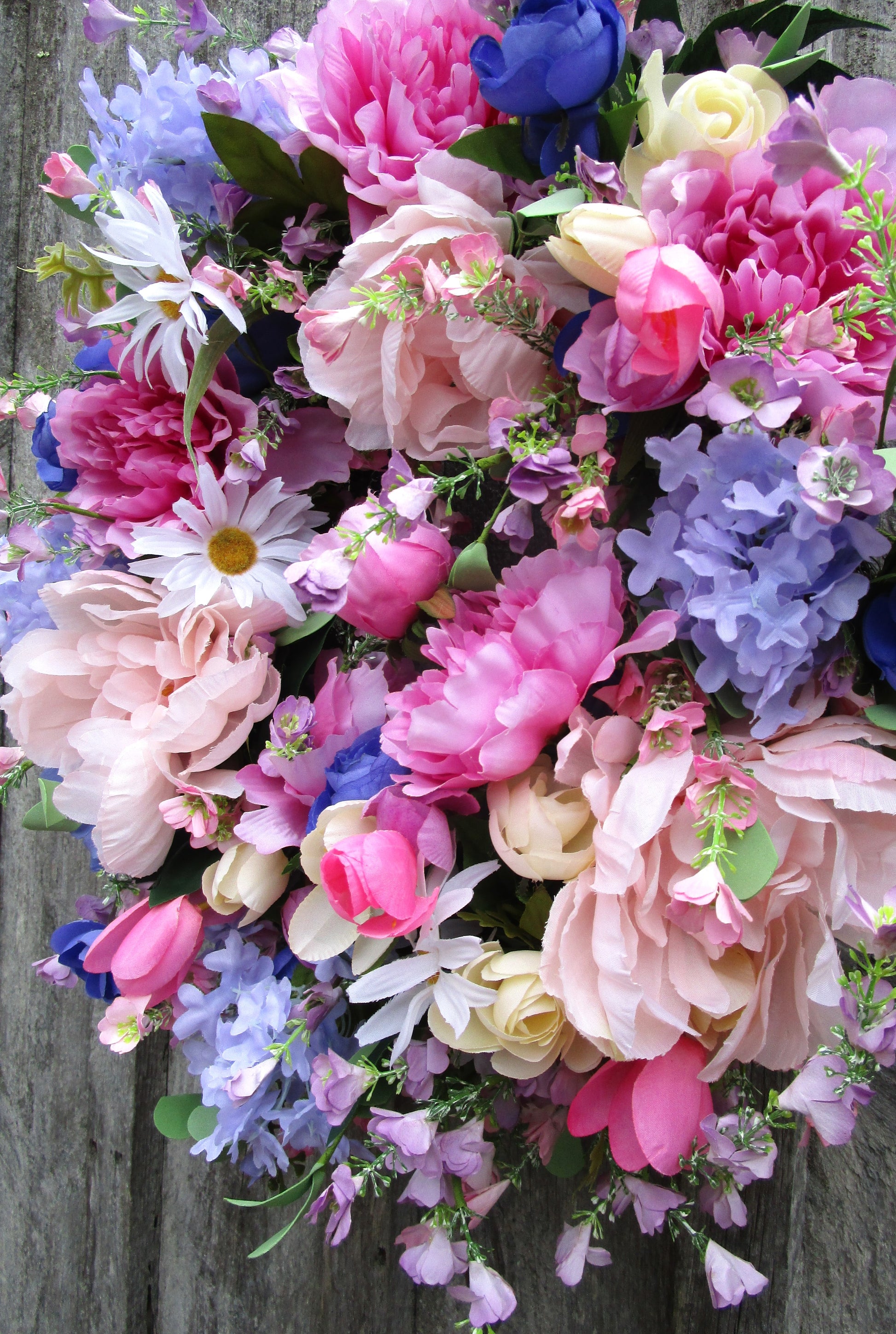 Overflowing with soft garden elegance, this handcrafted twig wreath features lifelike peonies, lilacs, daisies, roses, and wildflowers in a soft spring palette. Perfect for welcoming spring and summer with timeless charm.