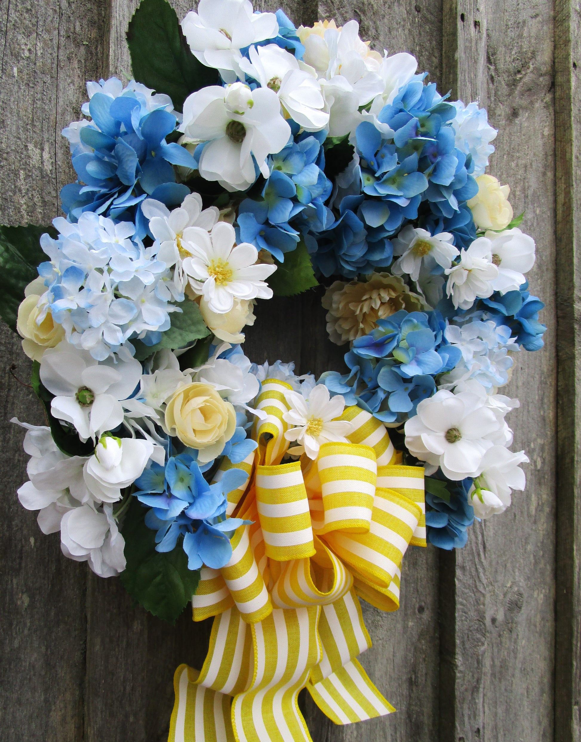 Welcome summer with this cheerful wreath featuring lush faux hydrangeas, daisies, roses, and a sunny yellow and white striped ribbon bow.