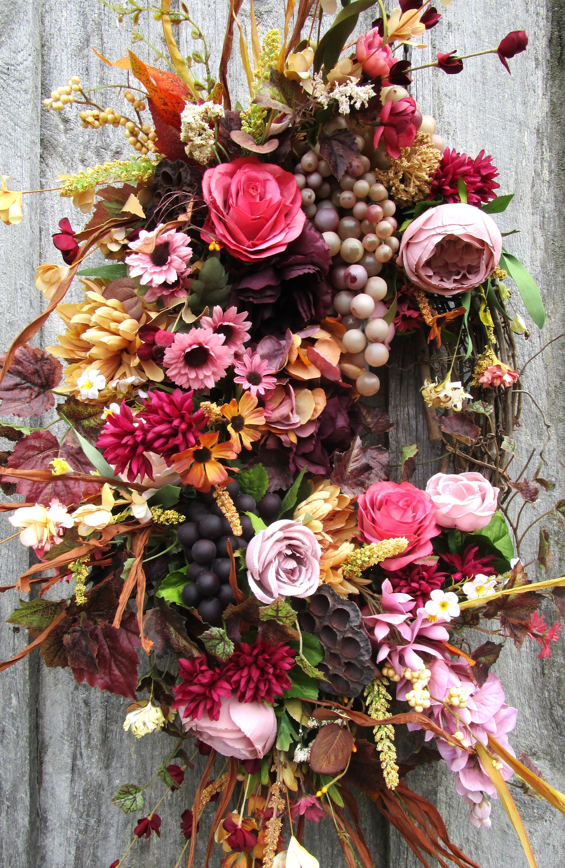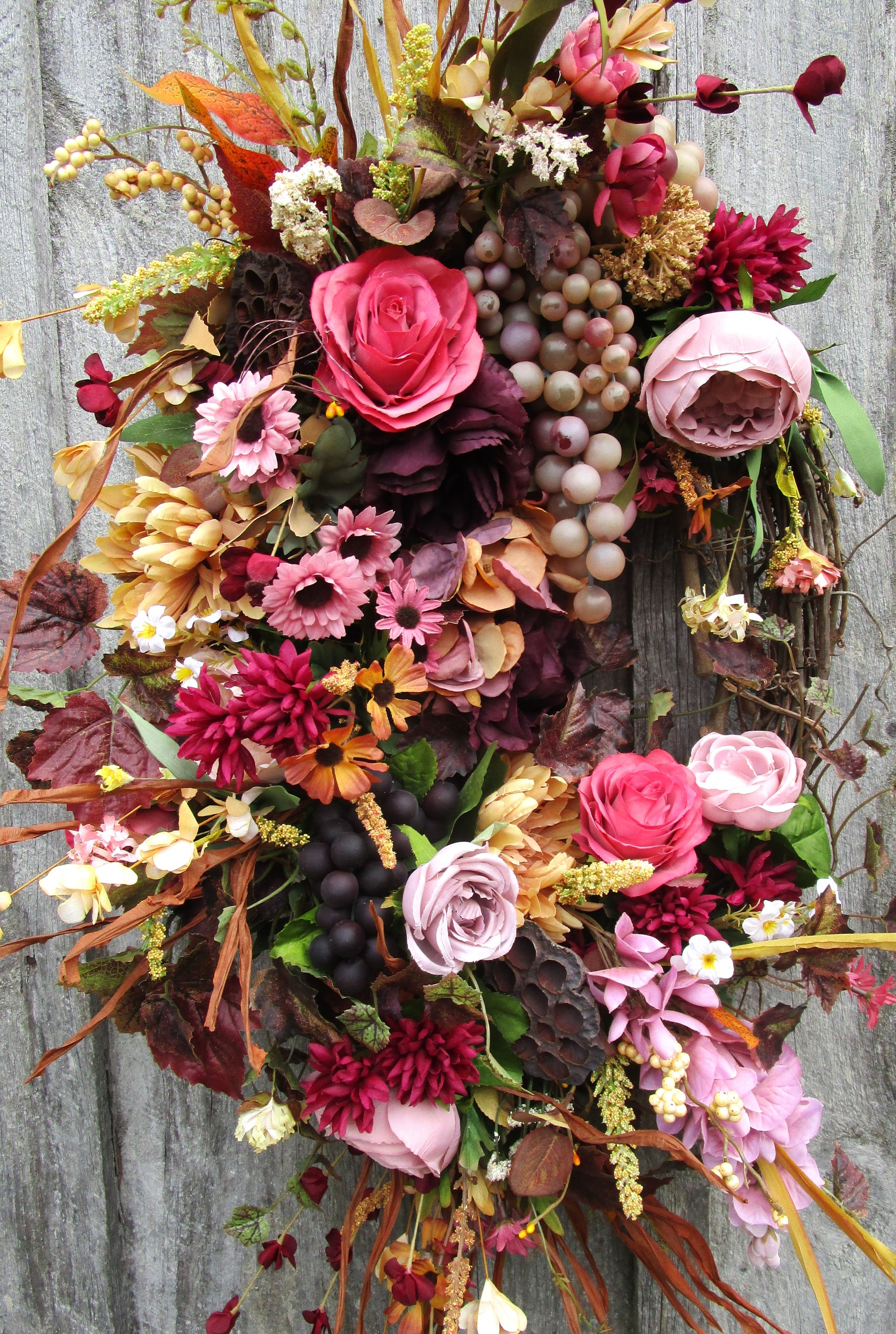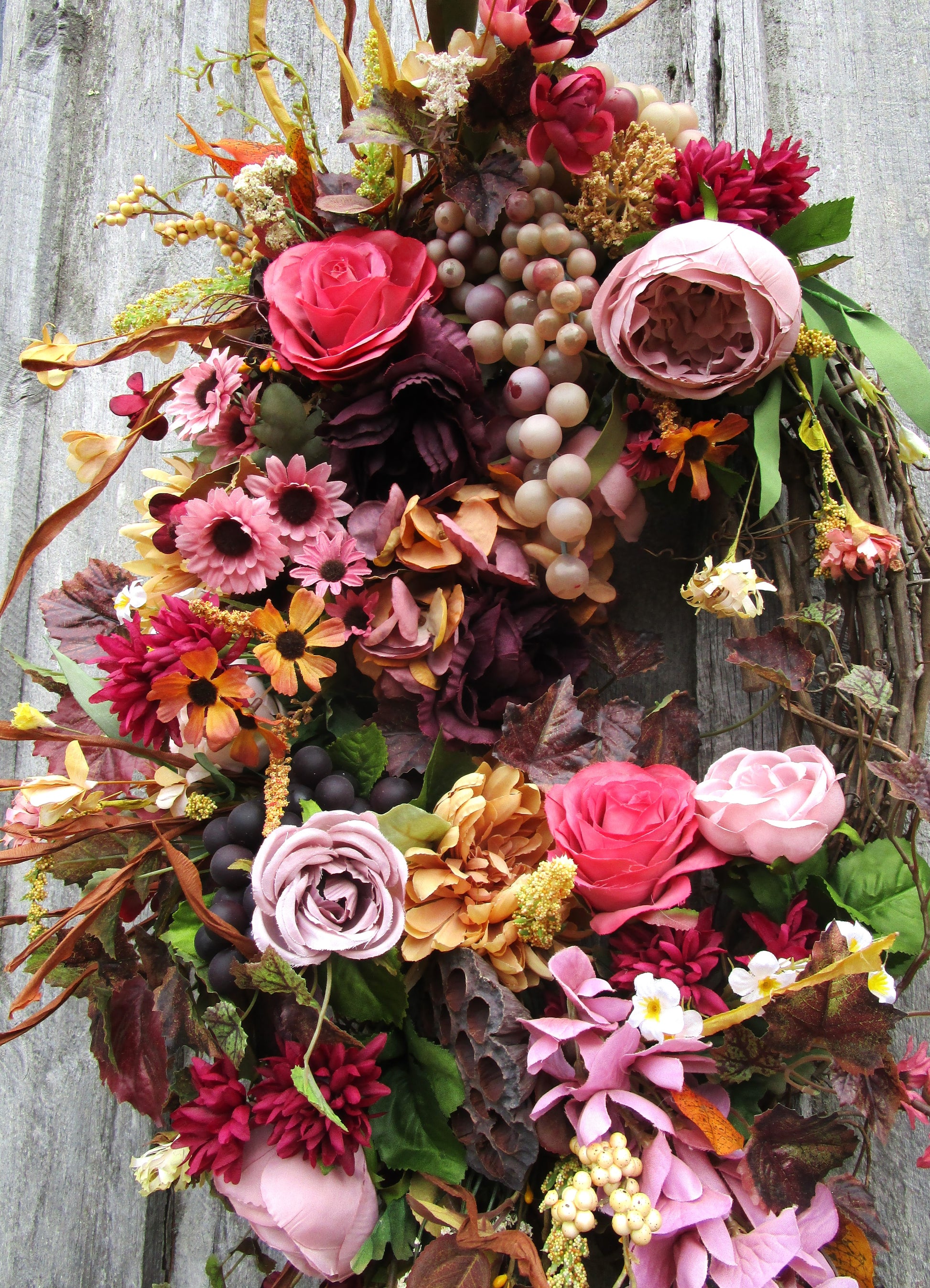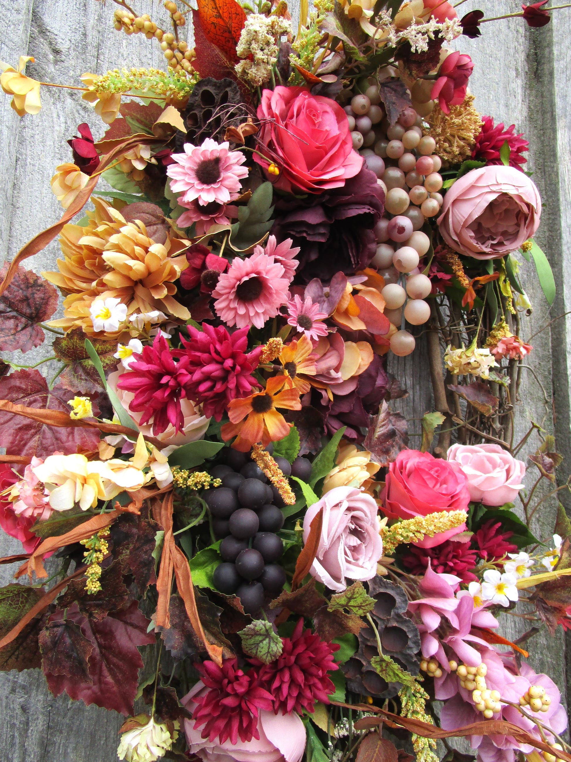 This designer piece features a romantic blend of peonies, roses, mums, hydrangeas, and more—accented by grape clusters, lotus pods, and seasonal foliage in rich harvest hues.
