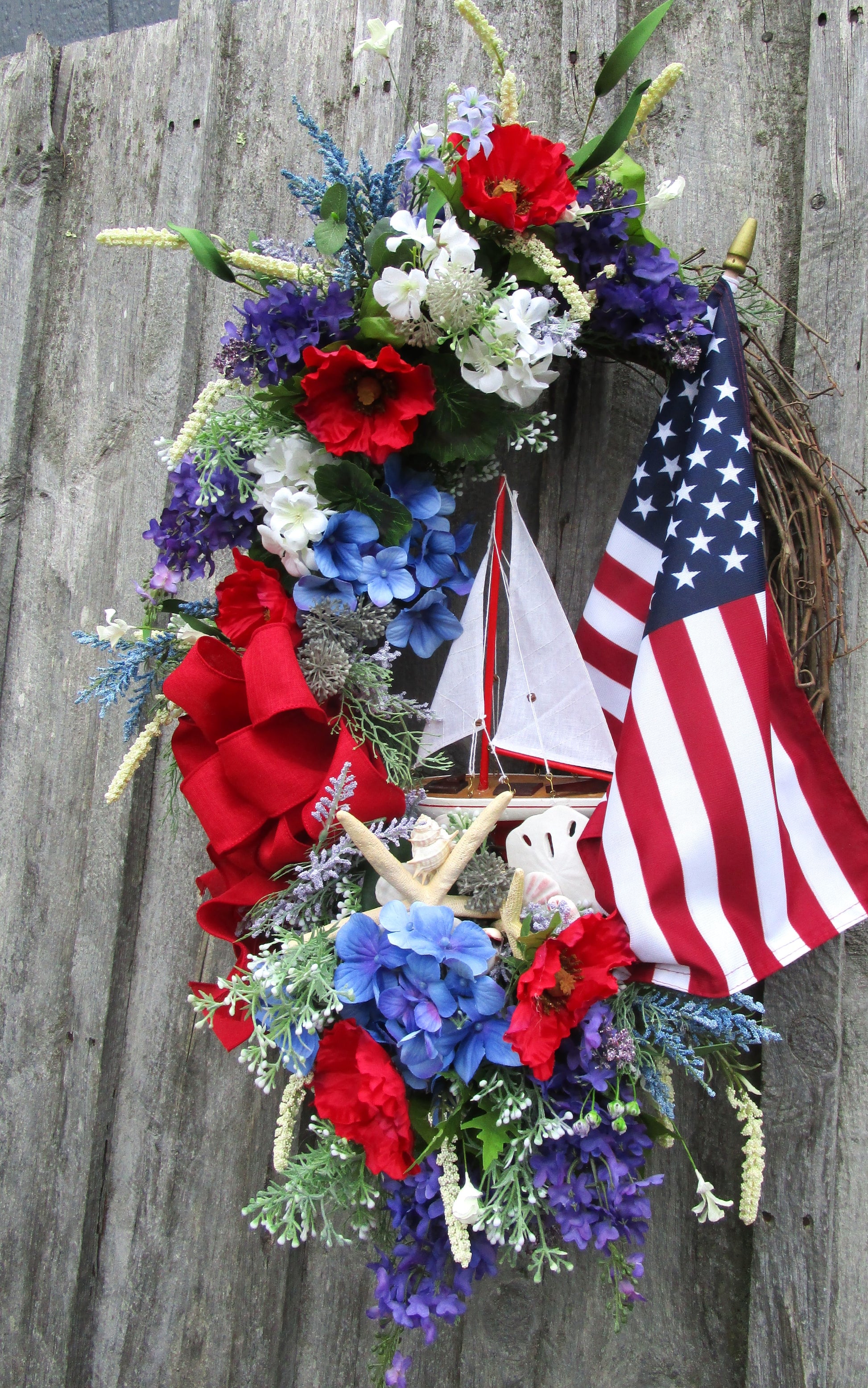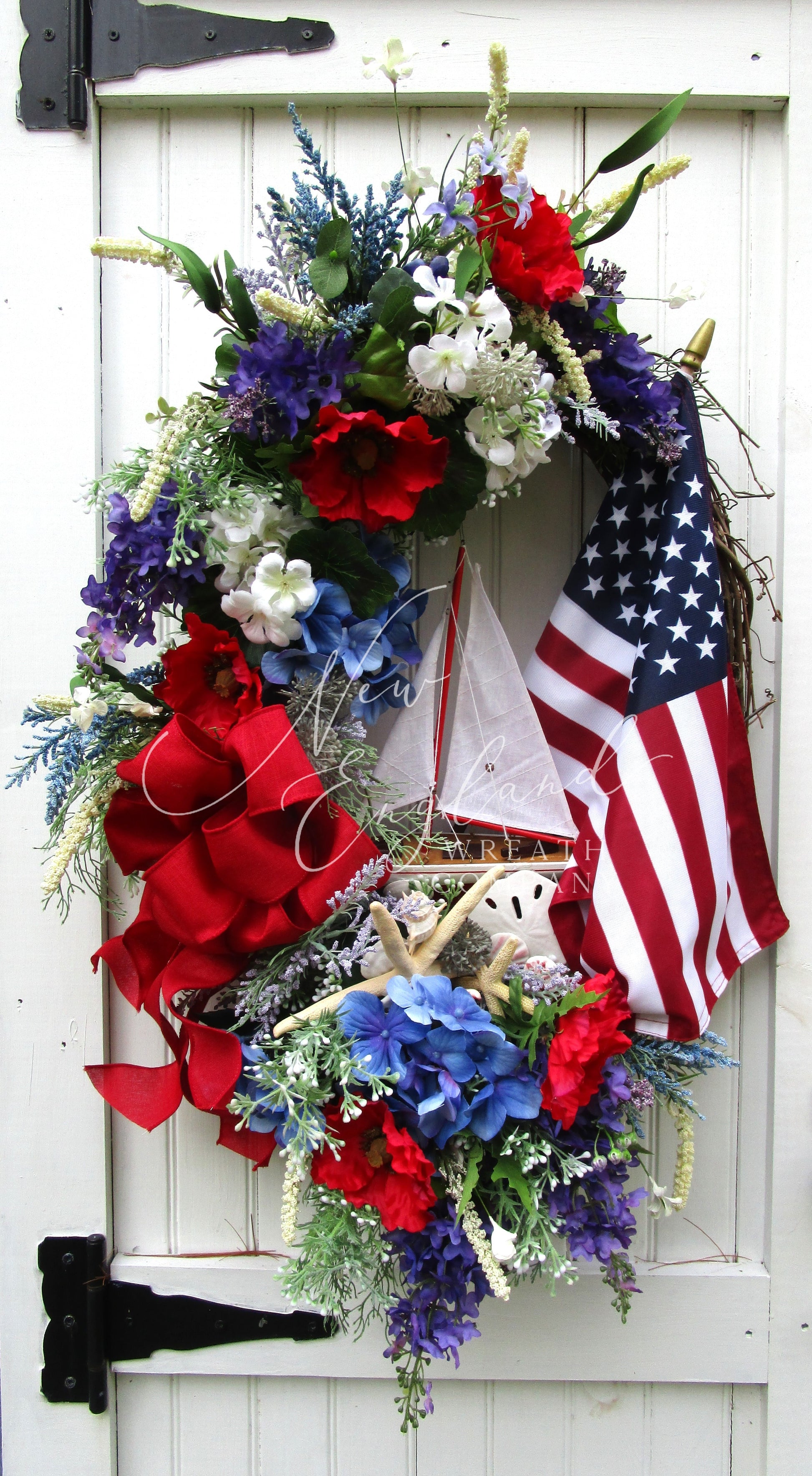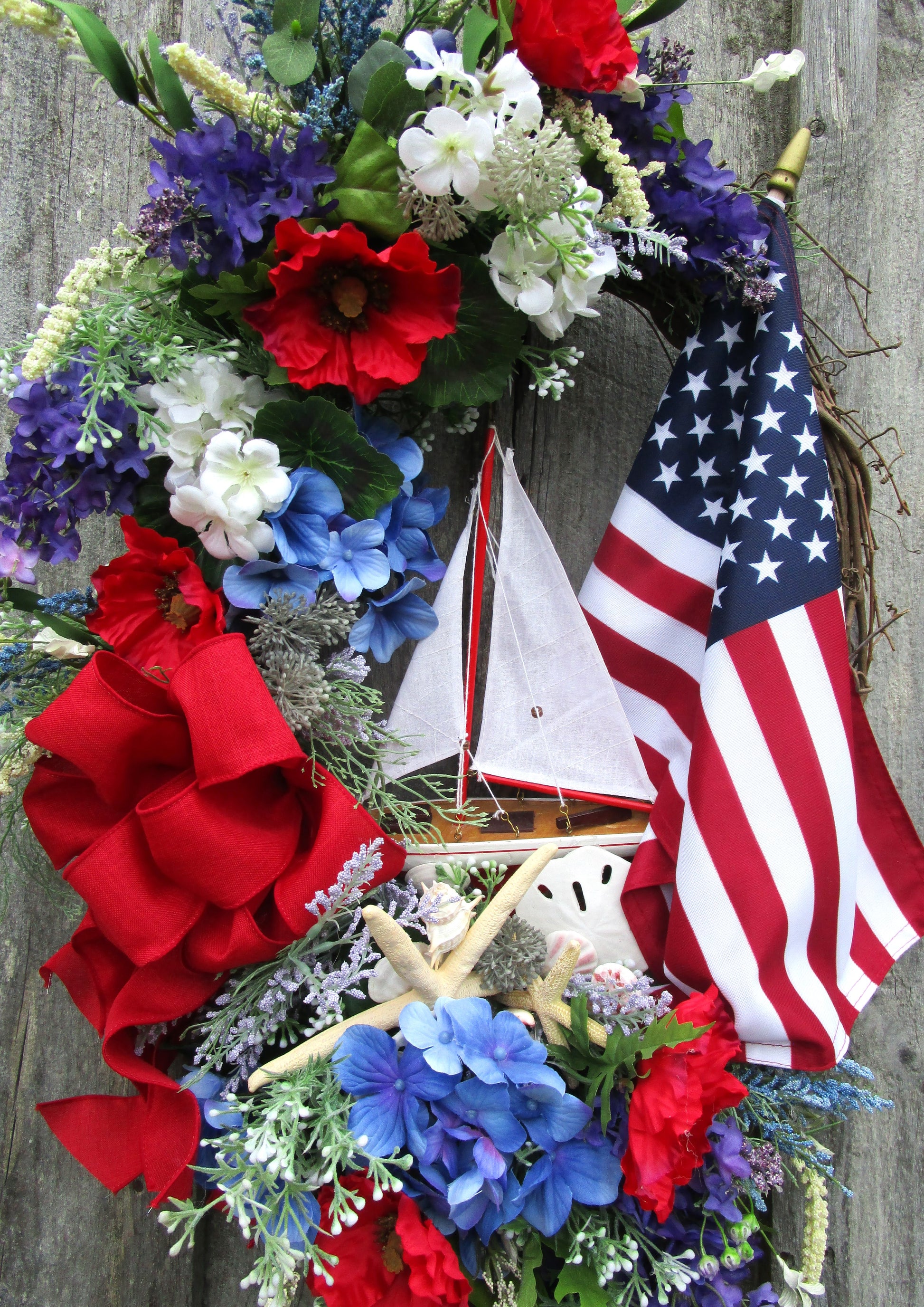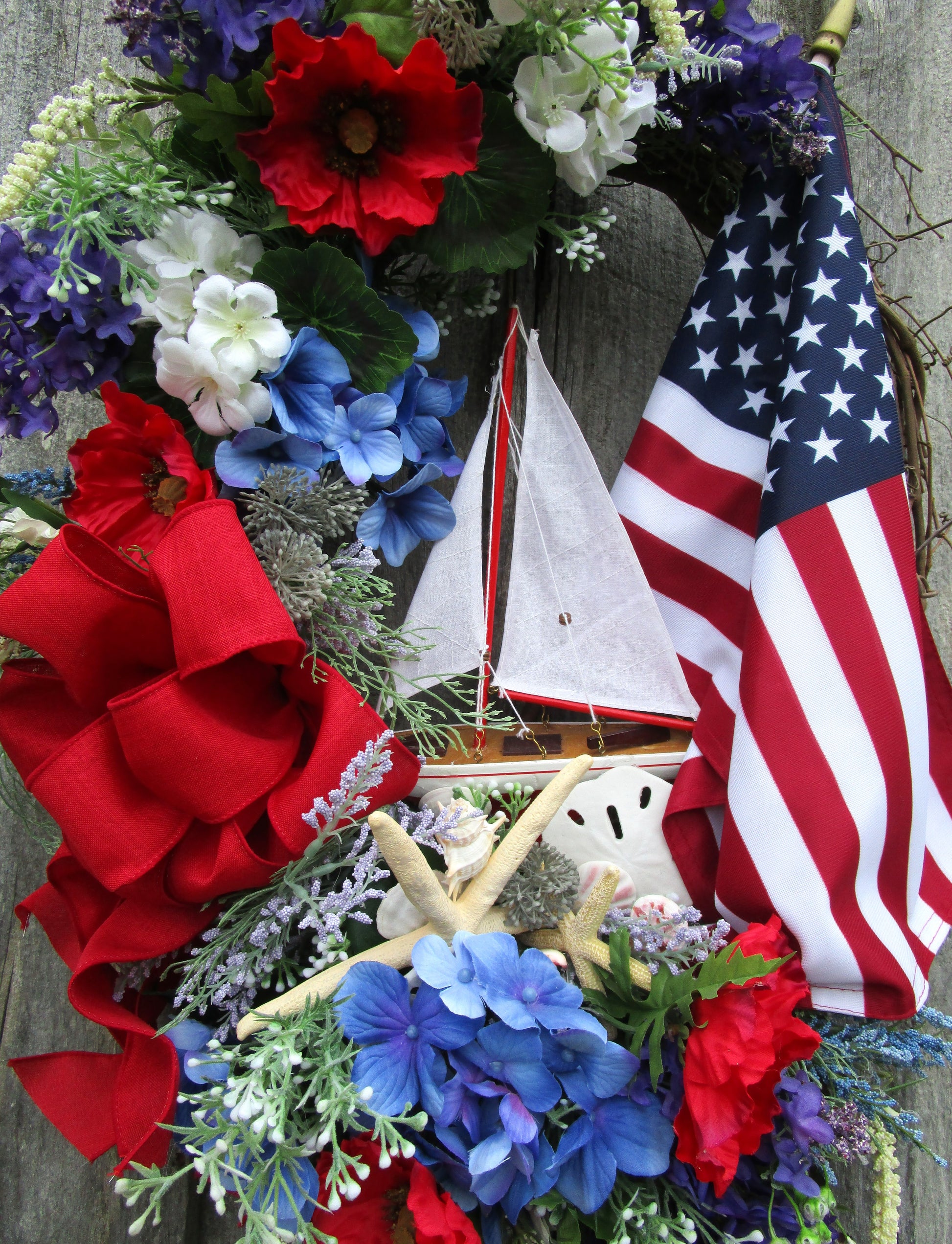 Celebrate American spirit and coastal charm with this nautical wreath featuring a handcrafted sailboat, patriotic florals, seaside accents, and a full-size flag.