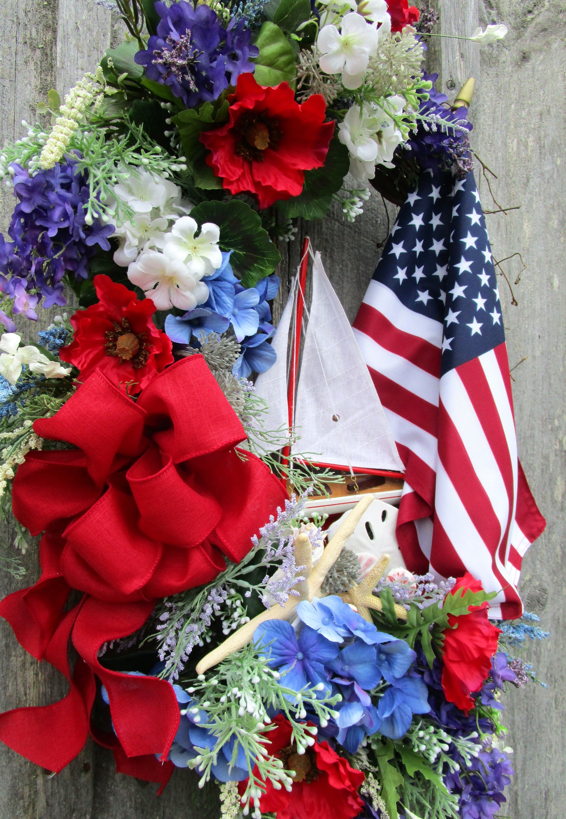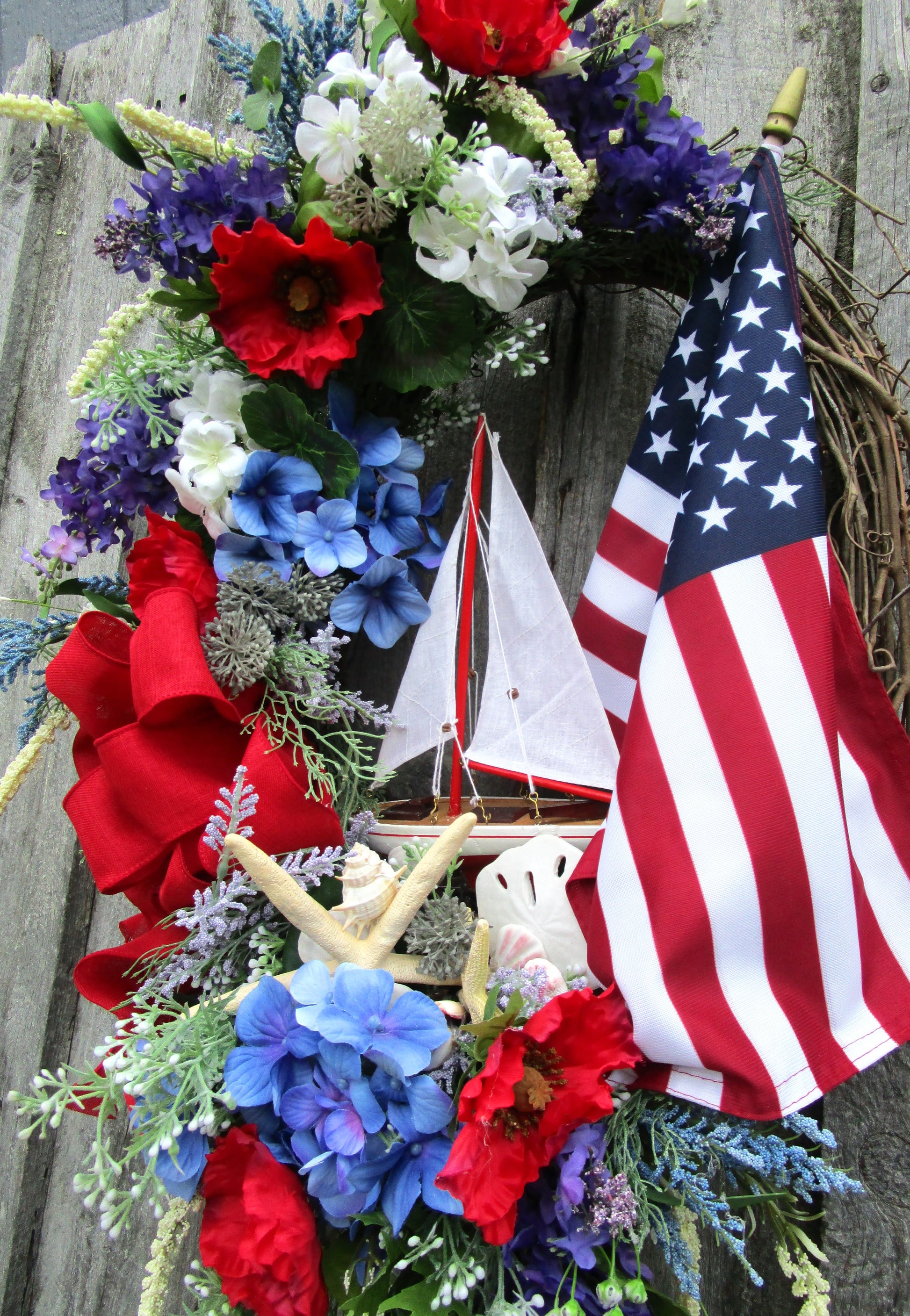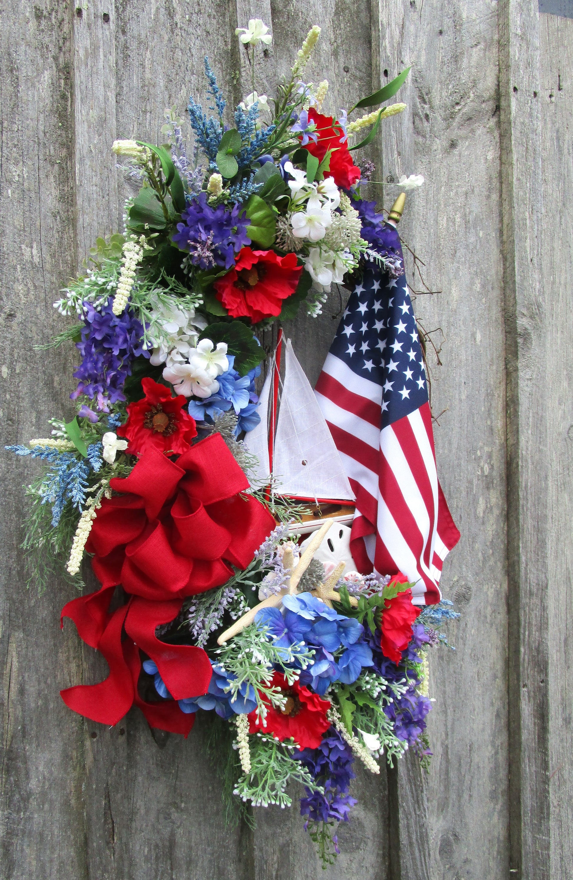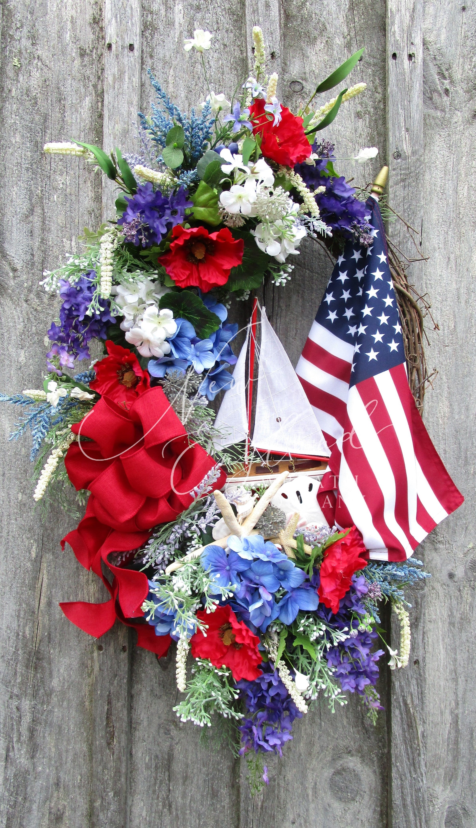 Celebrate American spirit and coastal charm with this nautical wreath featuring a handcrafted sailboat, patriotic florals, seaside accents, and a full-size flag.