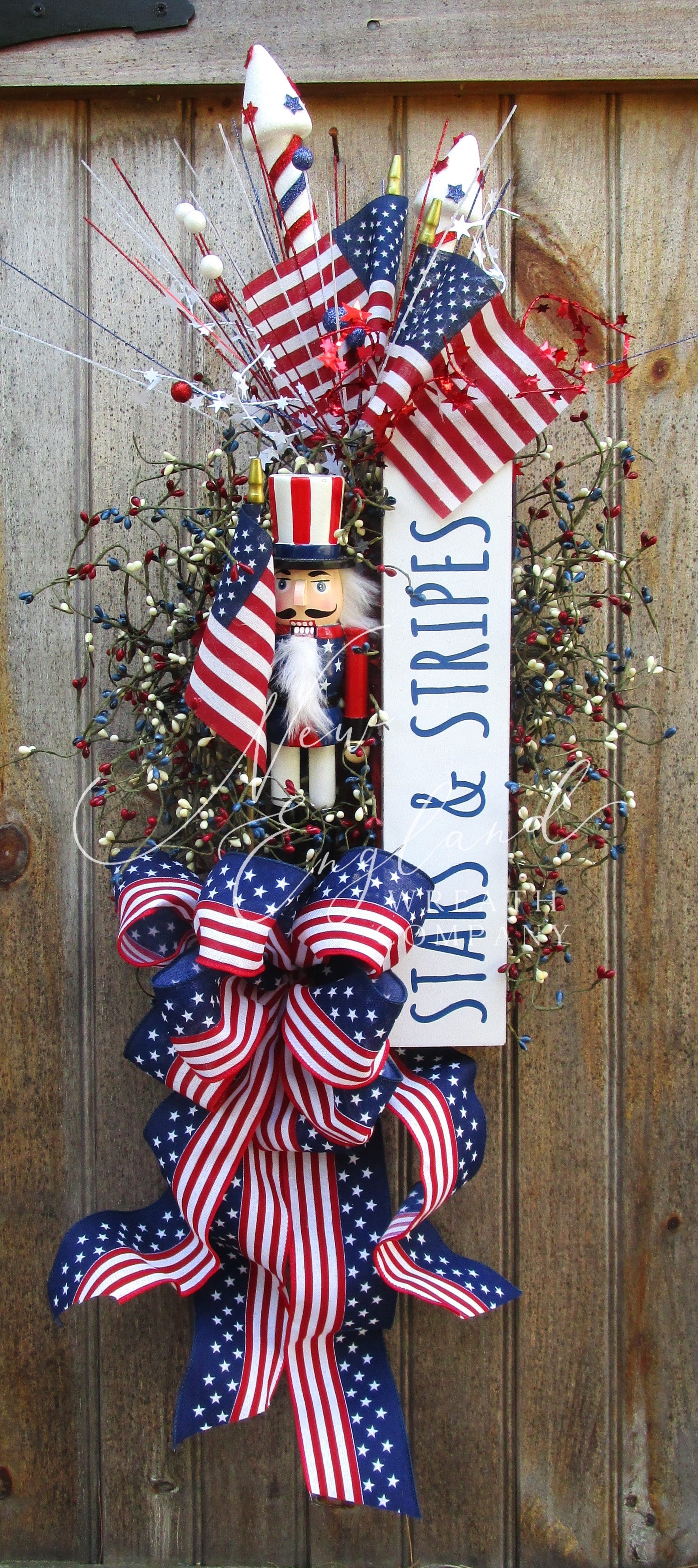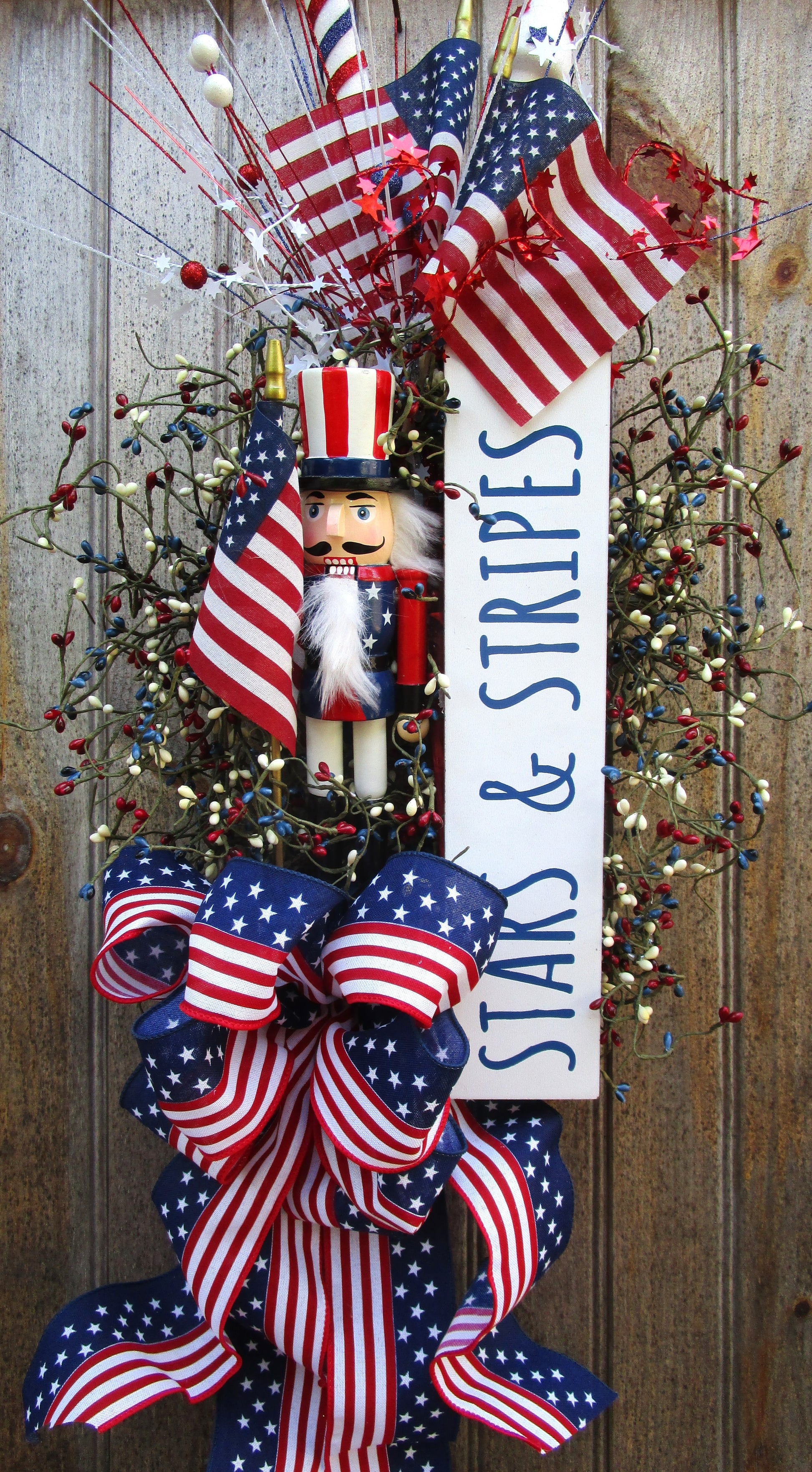 Festive patriotic swag with a 10” nutcracker, pip berries, wood sign, flags, and firework sprays. Finished with a bold stars-and-stripes ribbon bow.