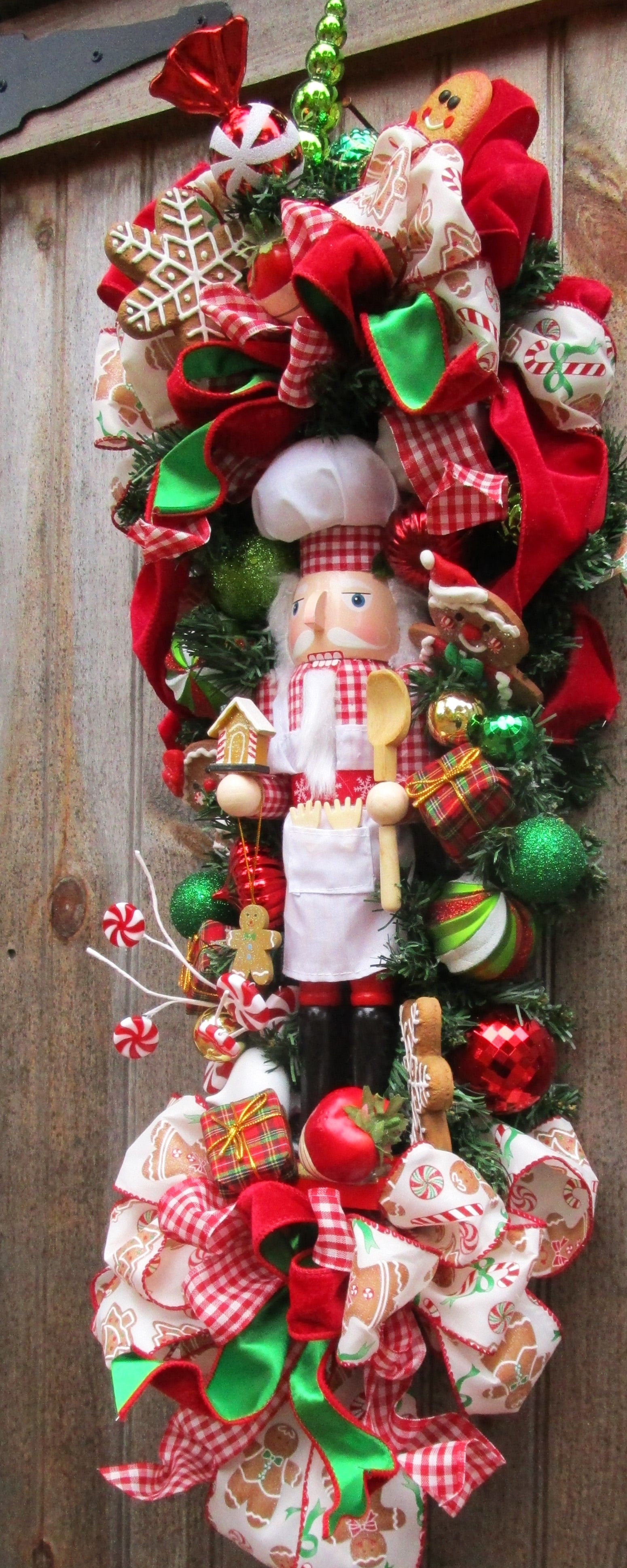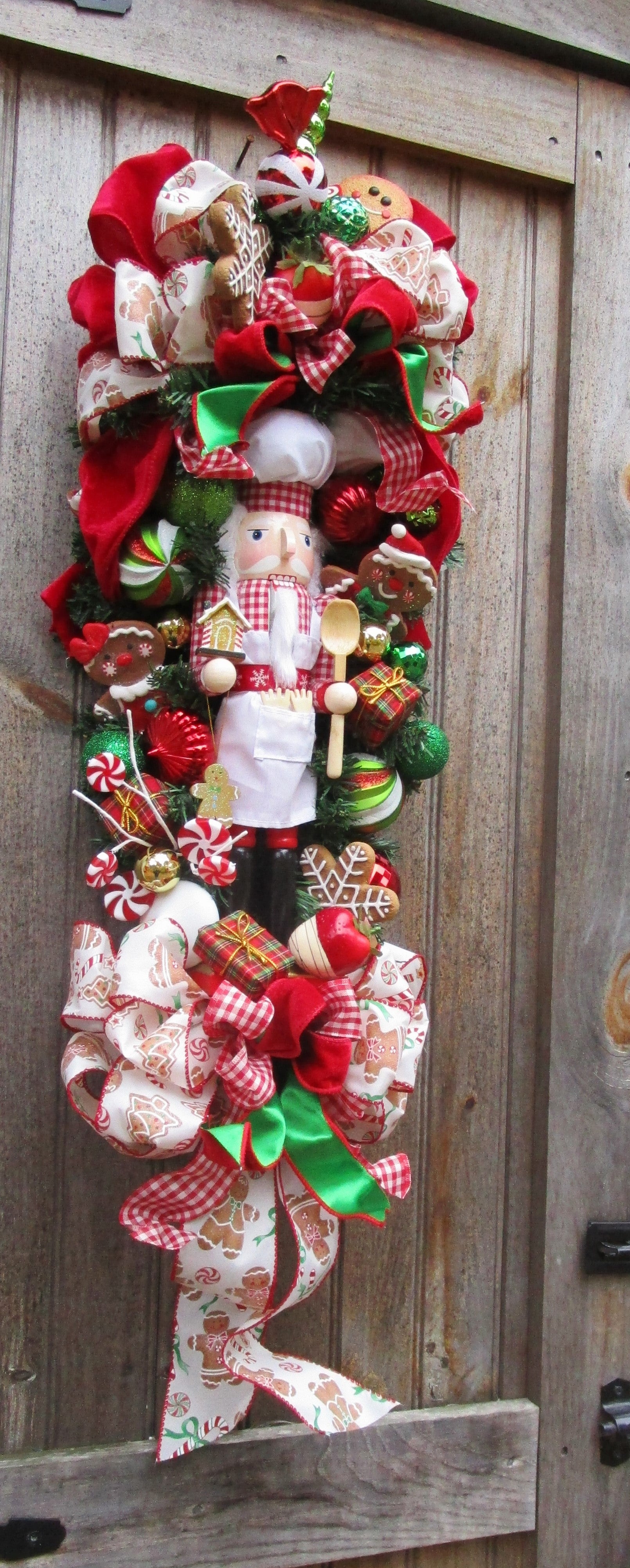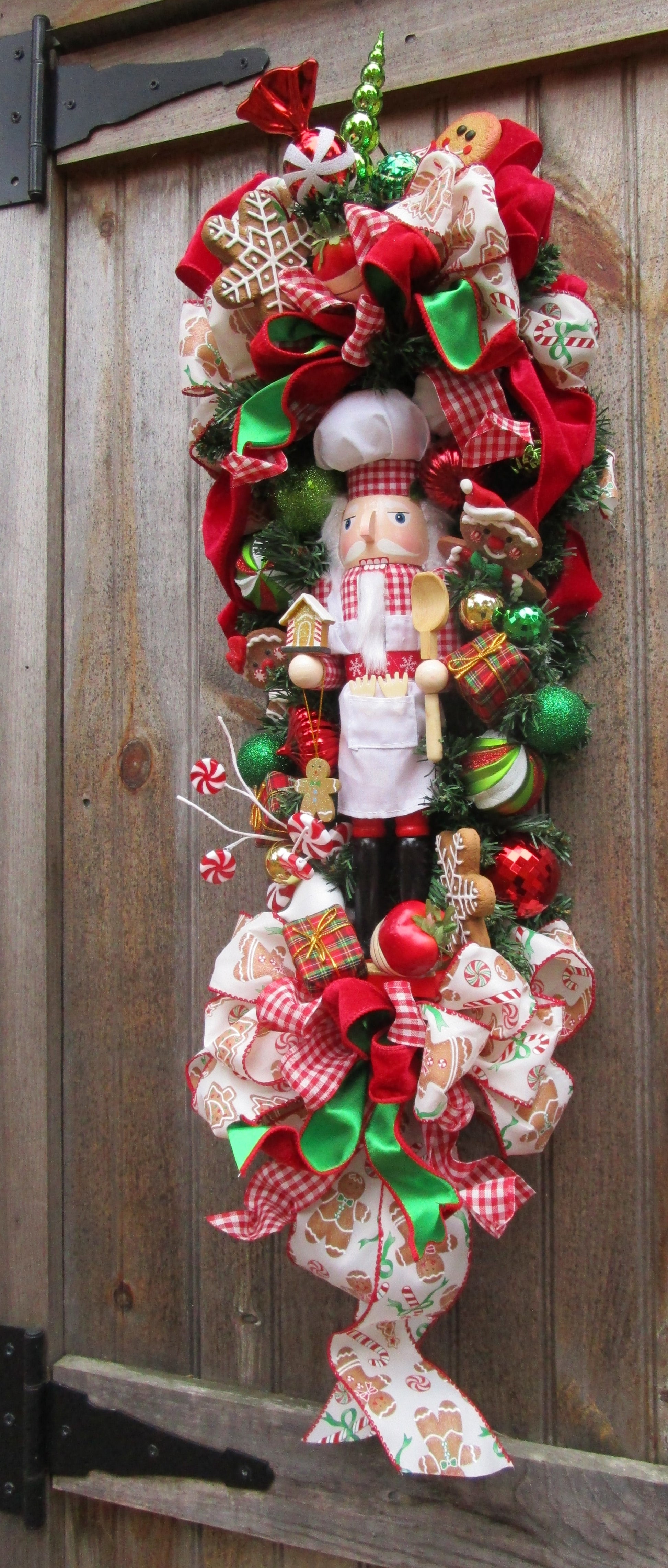 Whimsical holiday kitchen décor featuring a 15” chef nutcracker, gingerbread and candy ornaments, and festive layered bows in red, green, and gingham.