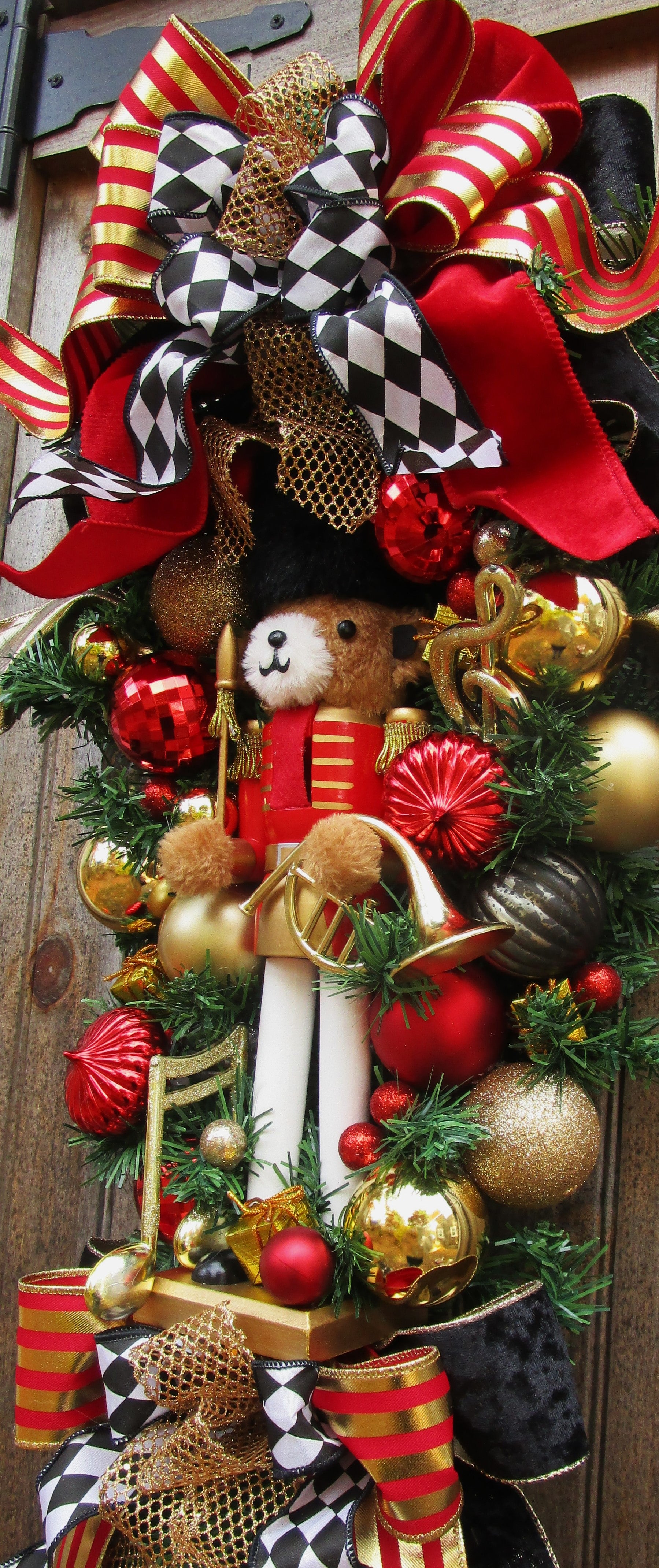 Sweet and festive, this handcrafted holiday swag brings a touch of childhood magic to your seasonal décor. A plush teddy bear-style nutcracker in a bright red uniform stands amid gold ornaments, wrapped presents, and musical decorations. Layered bows in red and gold stripe, harlequin, black and red velvet, and glitter mesh add bold color and movement. Display it on a front door, interior wall, or staircase for an instant dose of holiday cheer.