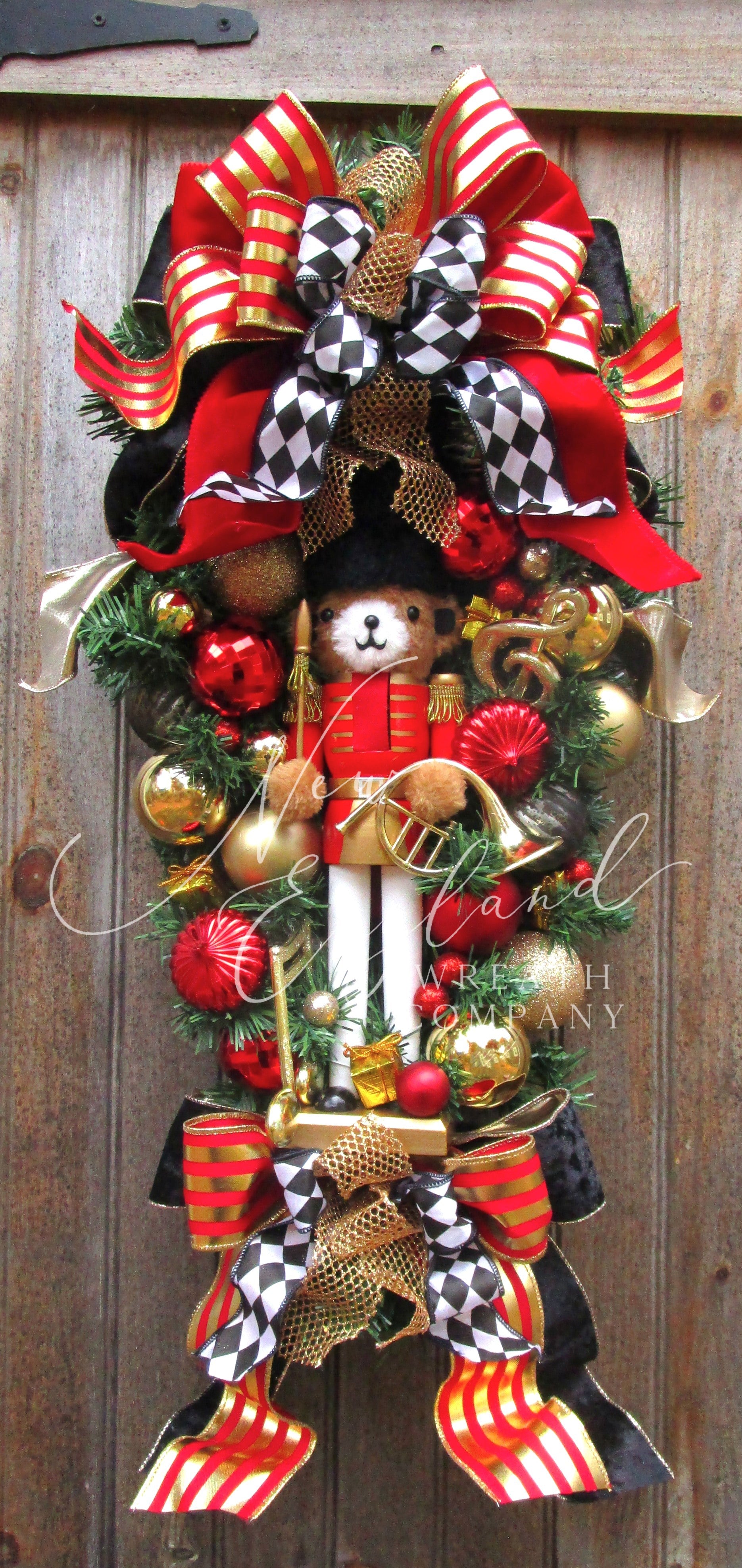 Whimsical Christmas swag with a 15” teddy bear nutcracker, festive ribbon bows, gold ornaments, and musical accents on a lush faux pine base.