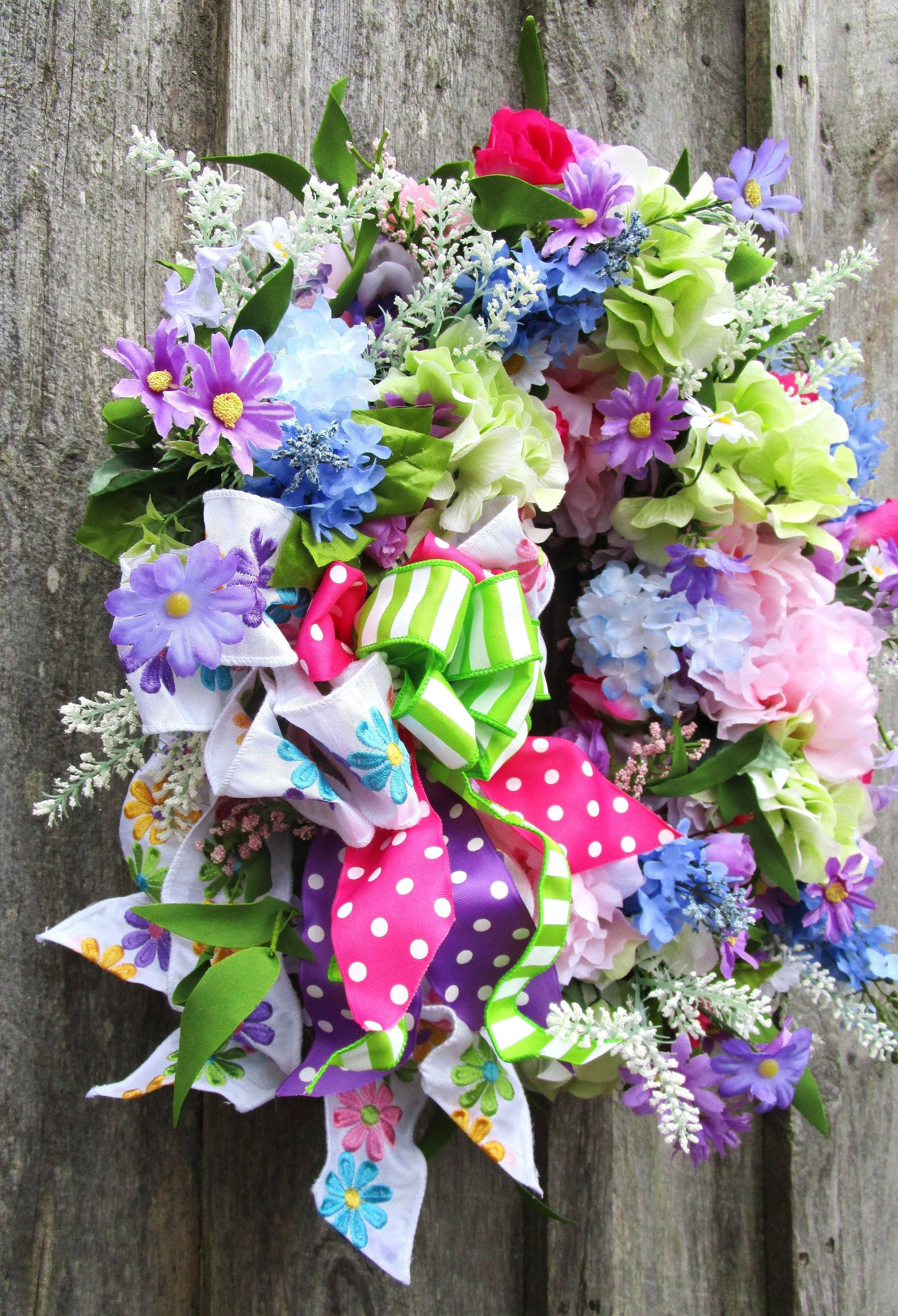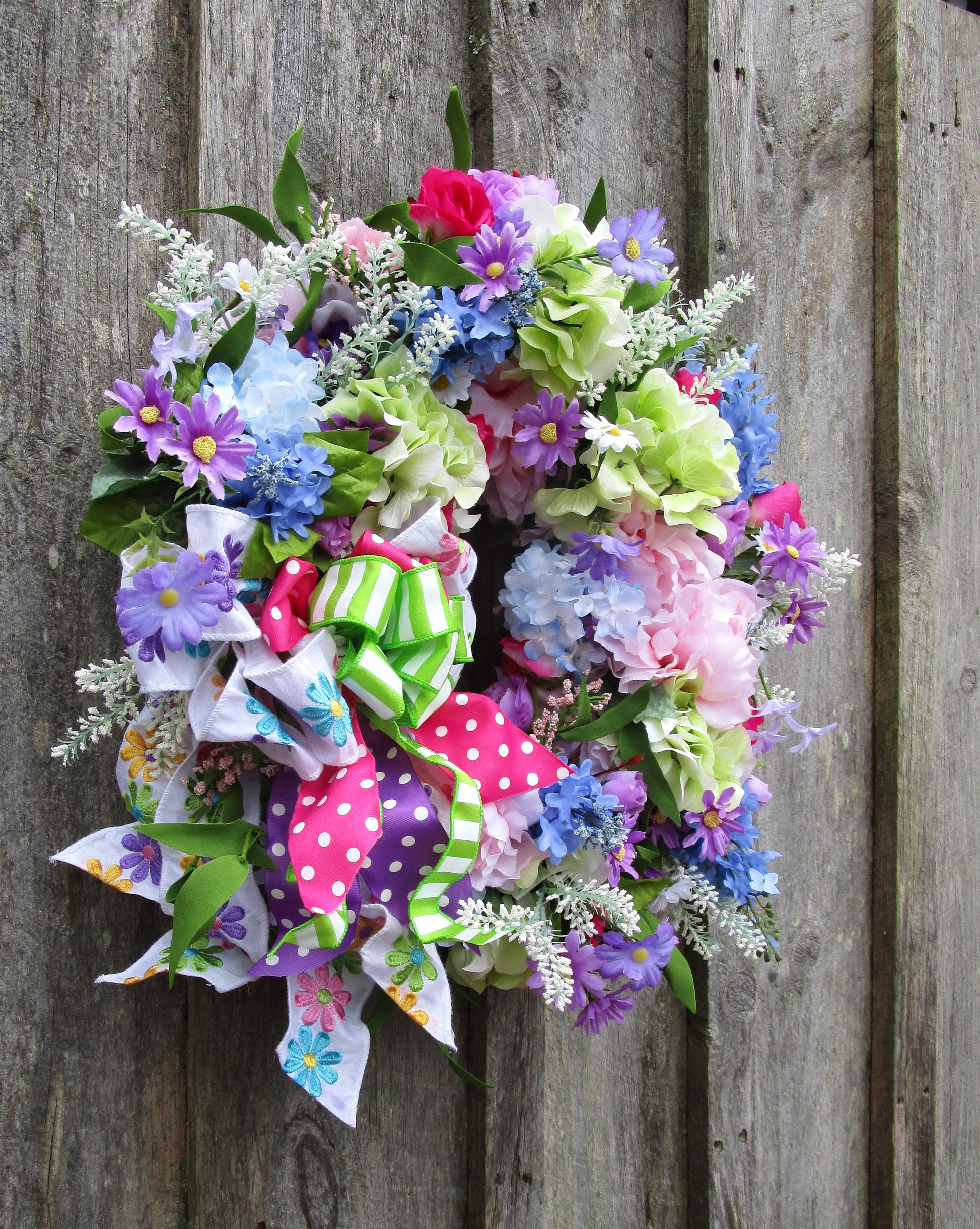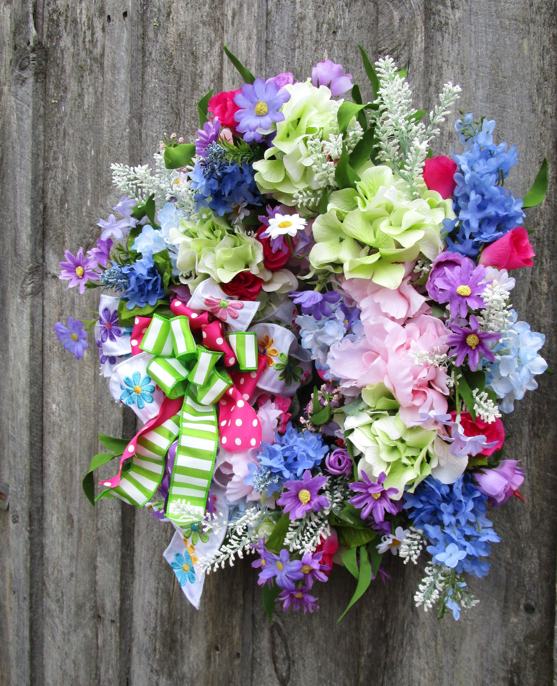Add playful garden charm with this colorful spring wreath featuring lifelike hydrangeas, daisies, lilacs, wildflowers, and a layered whimsical ribbon bow.