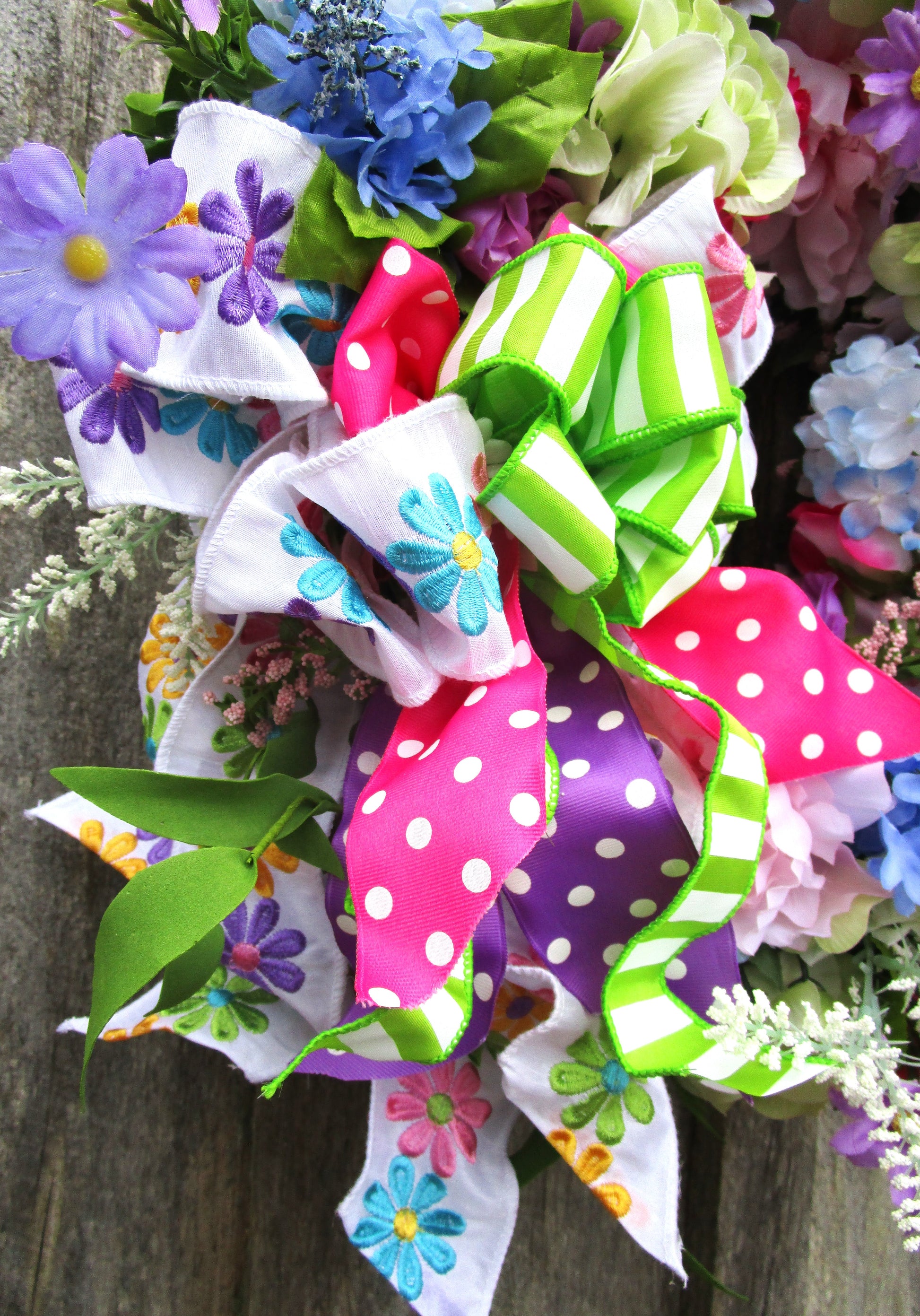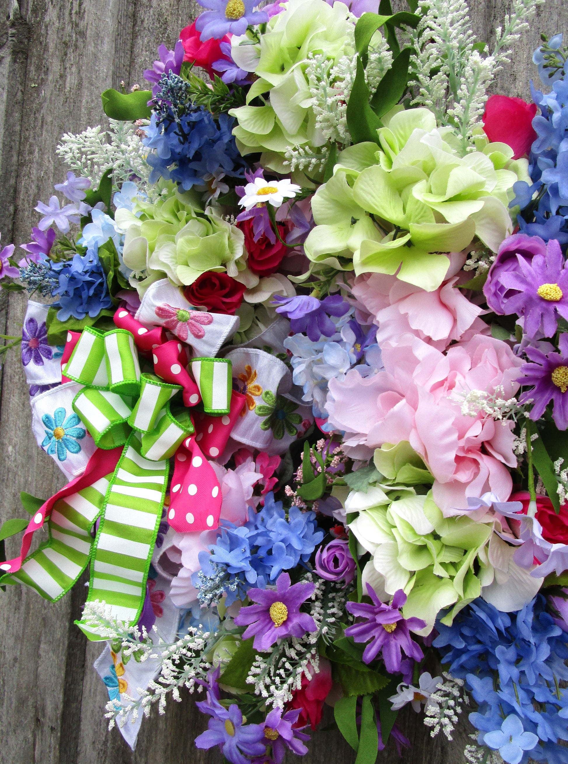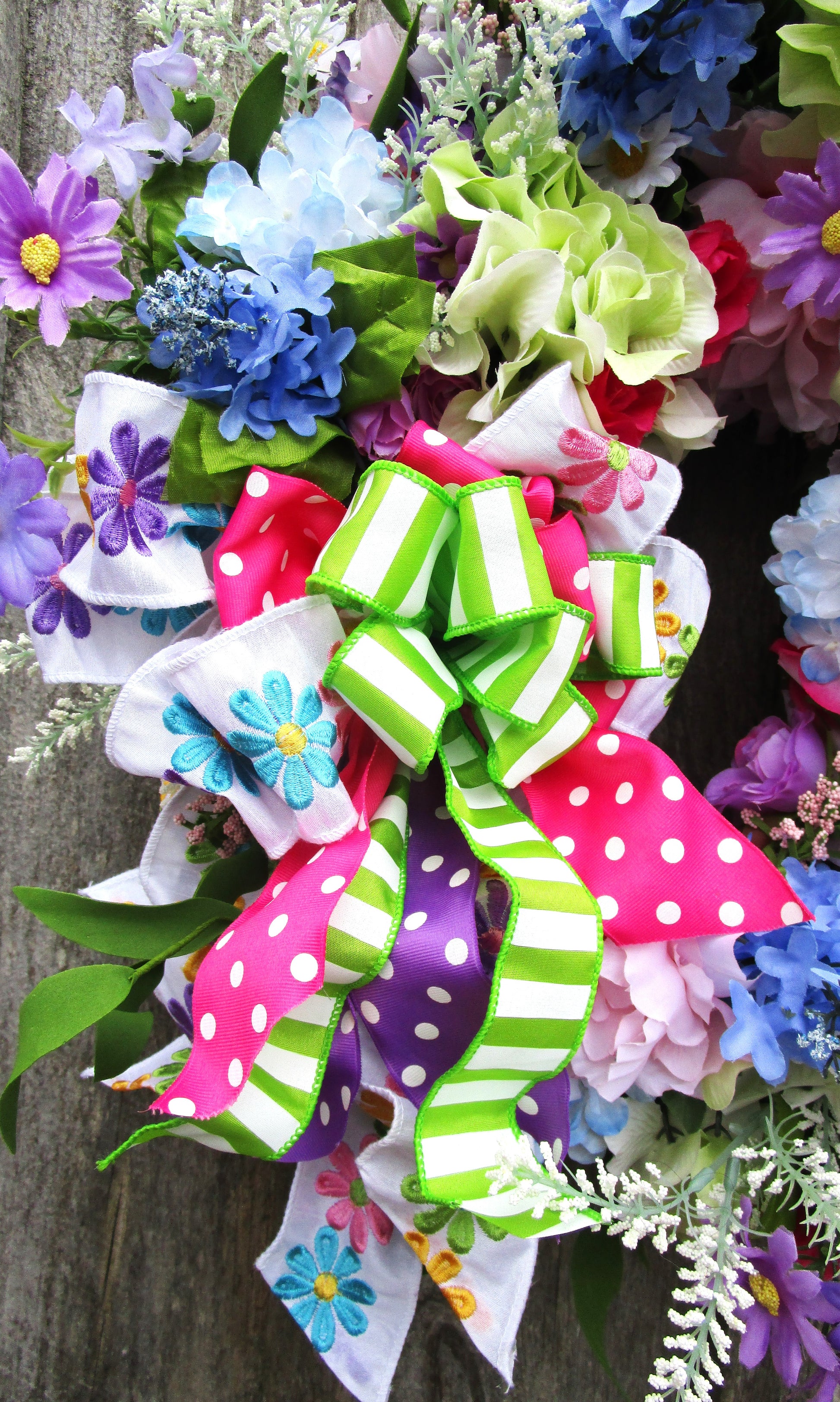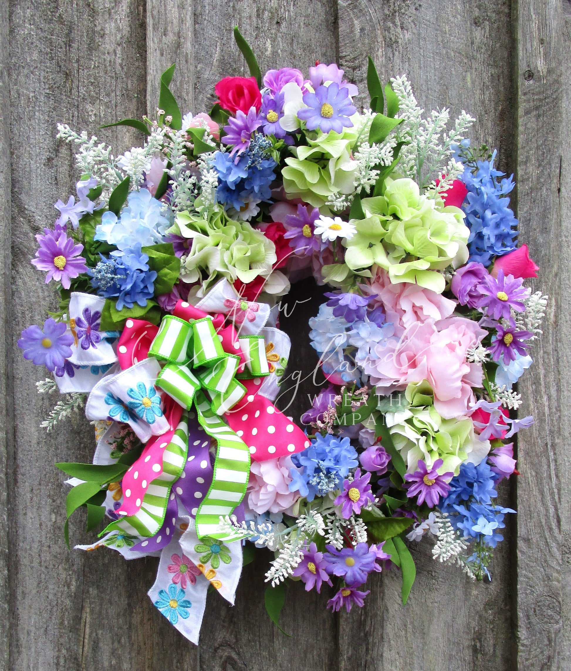 Add playful garden charm with this colorful spring wreath featuring lifelike hydrangeas, daisies, lilacs, wildflowers, and a layered whimsical ribbon bow.