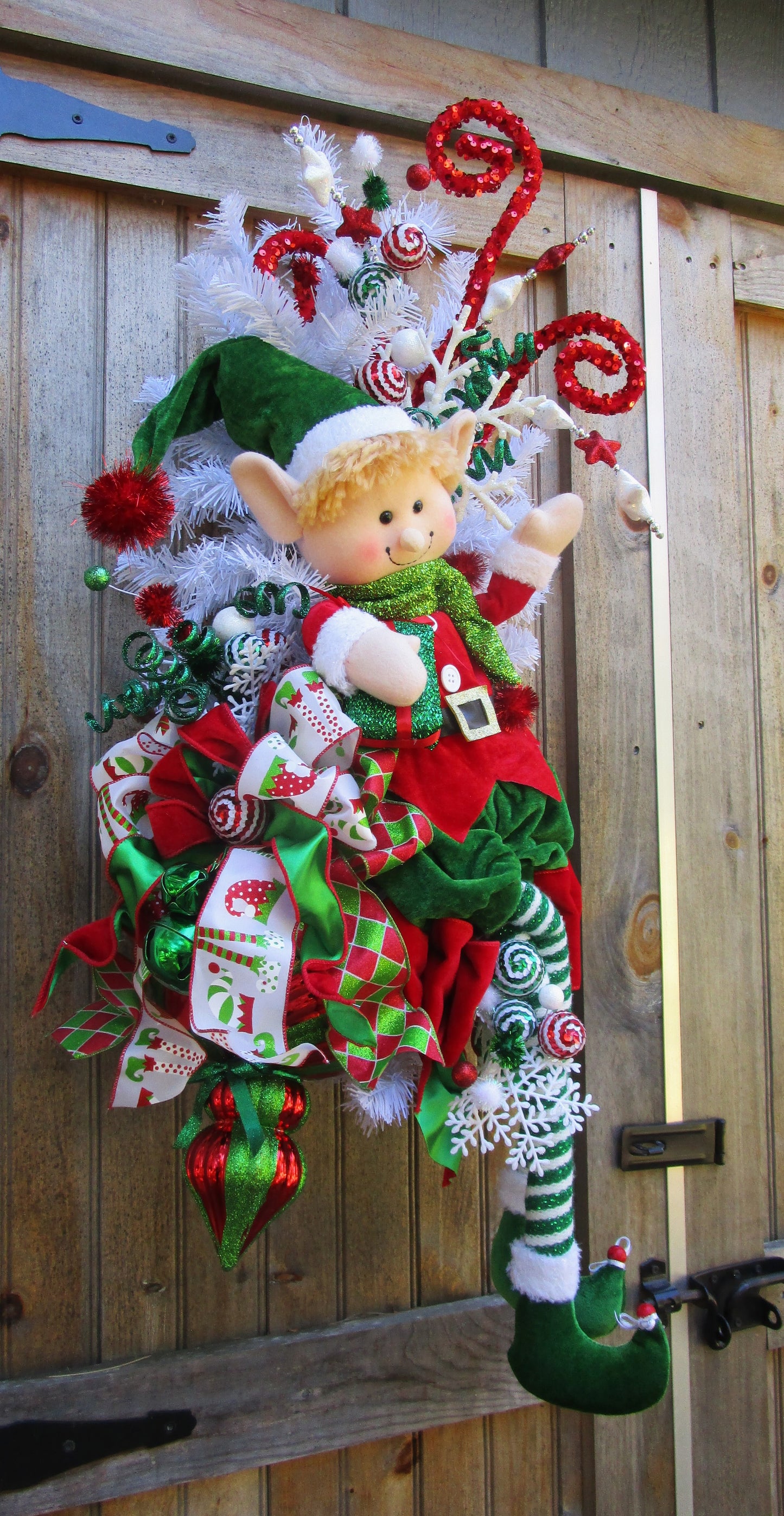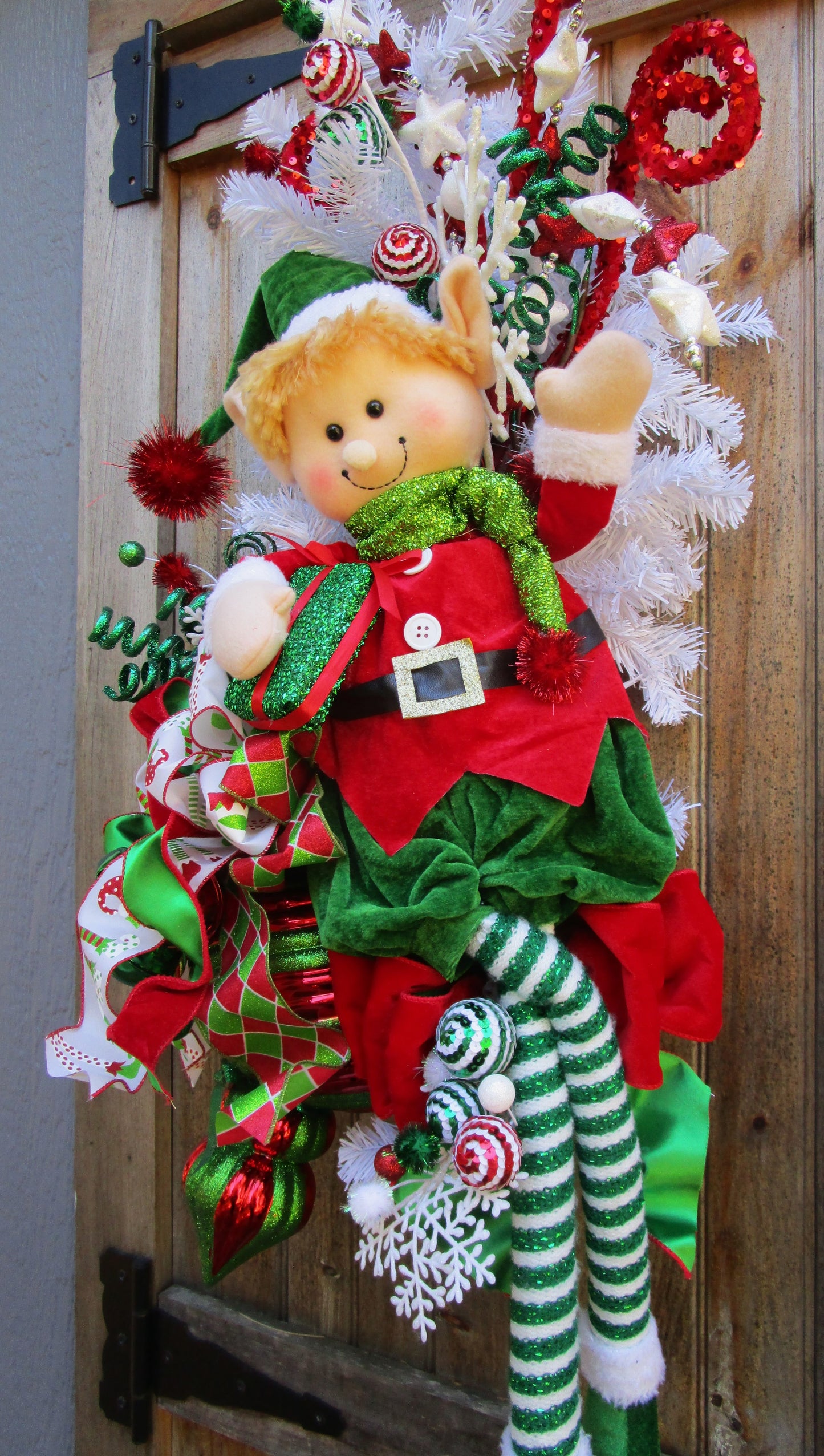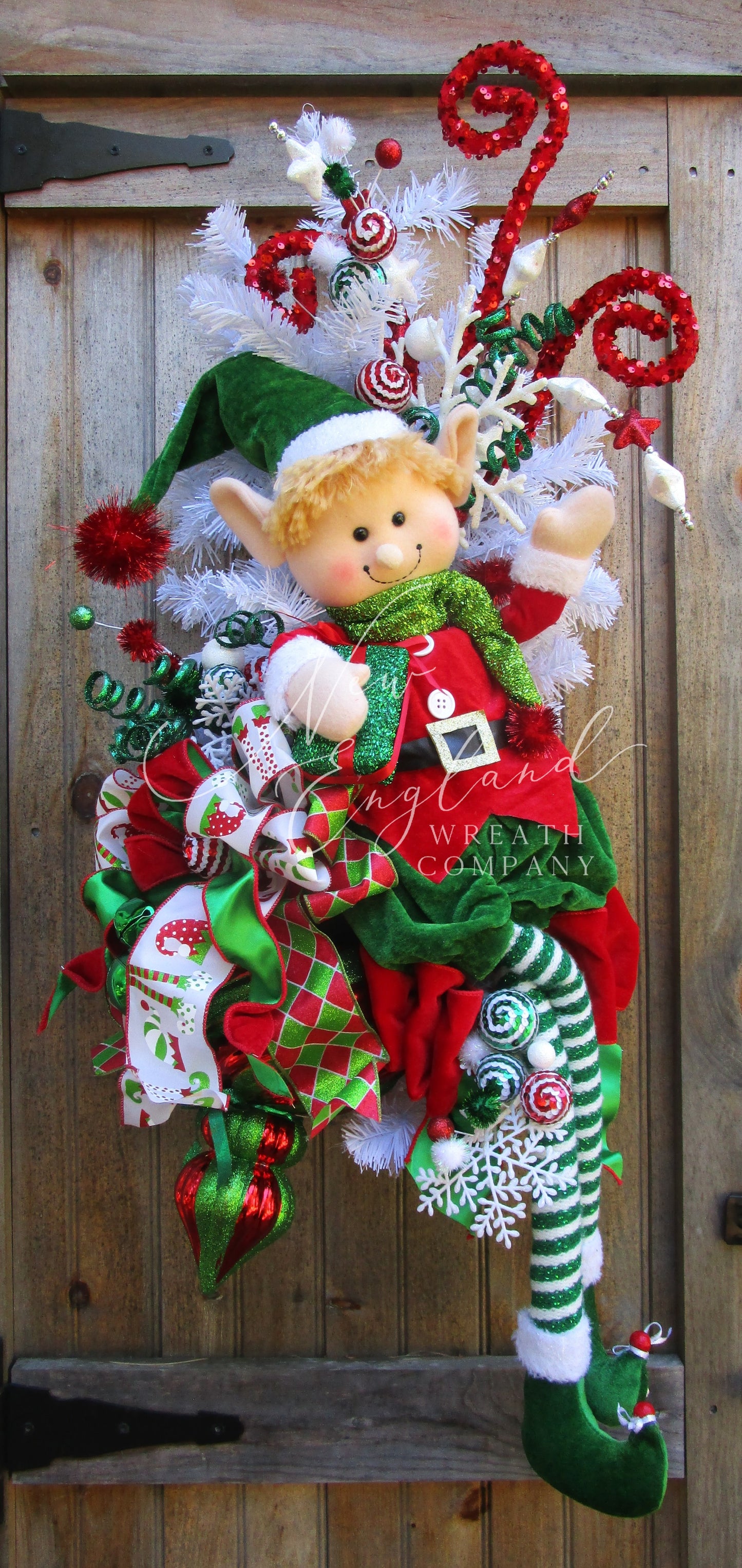 Playful elf swag with white pine, candy accents, jingle bells & a multi-layered bow. A cheerful burst of holiday joy.