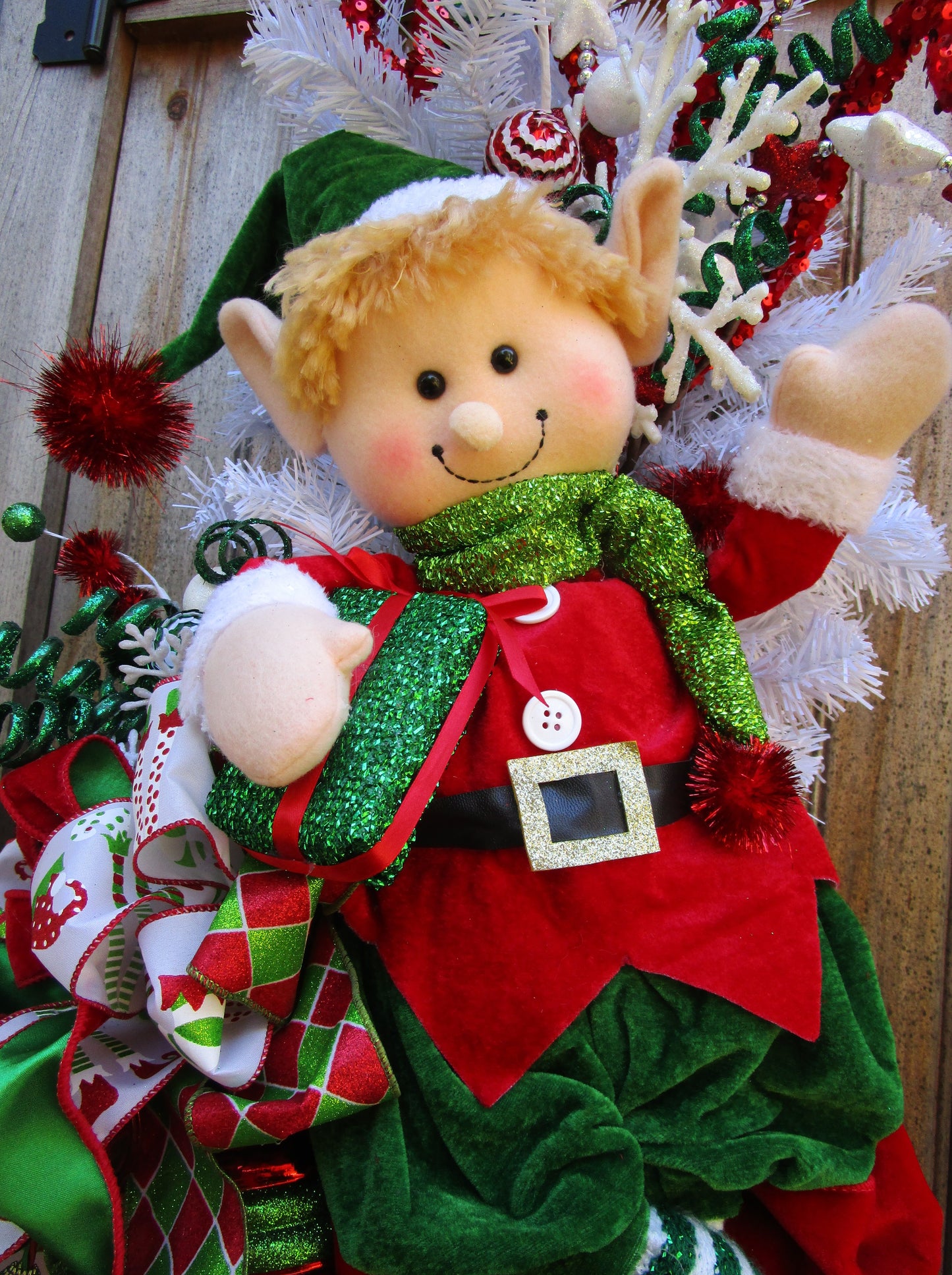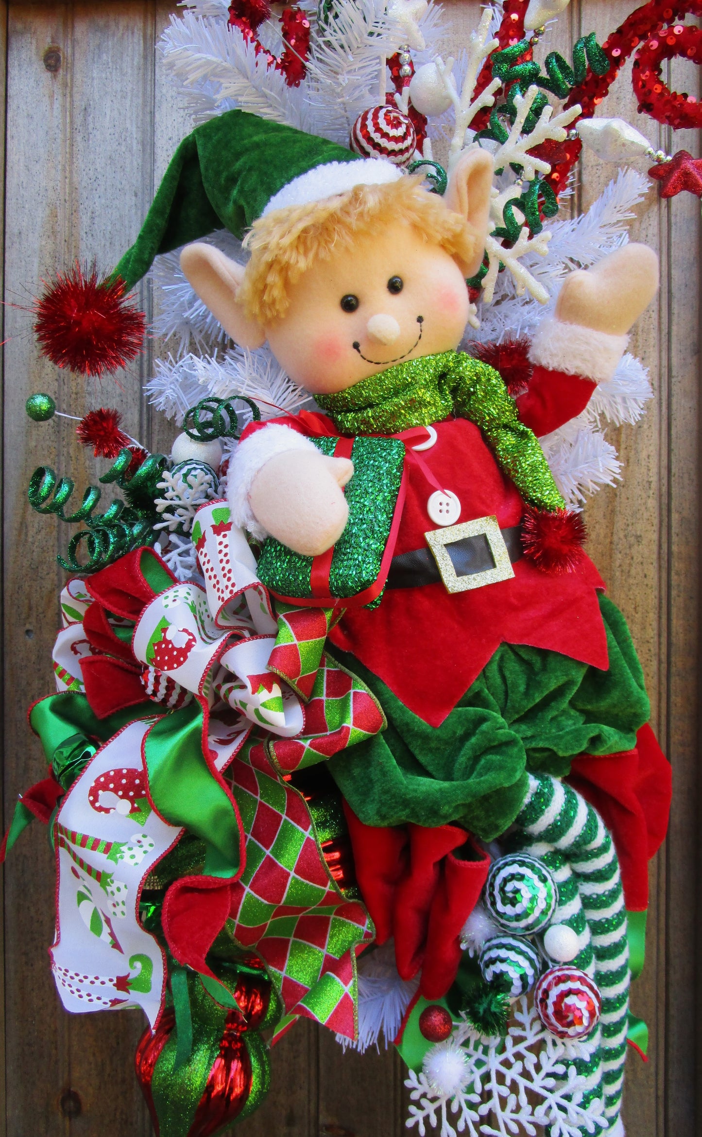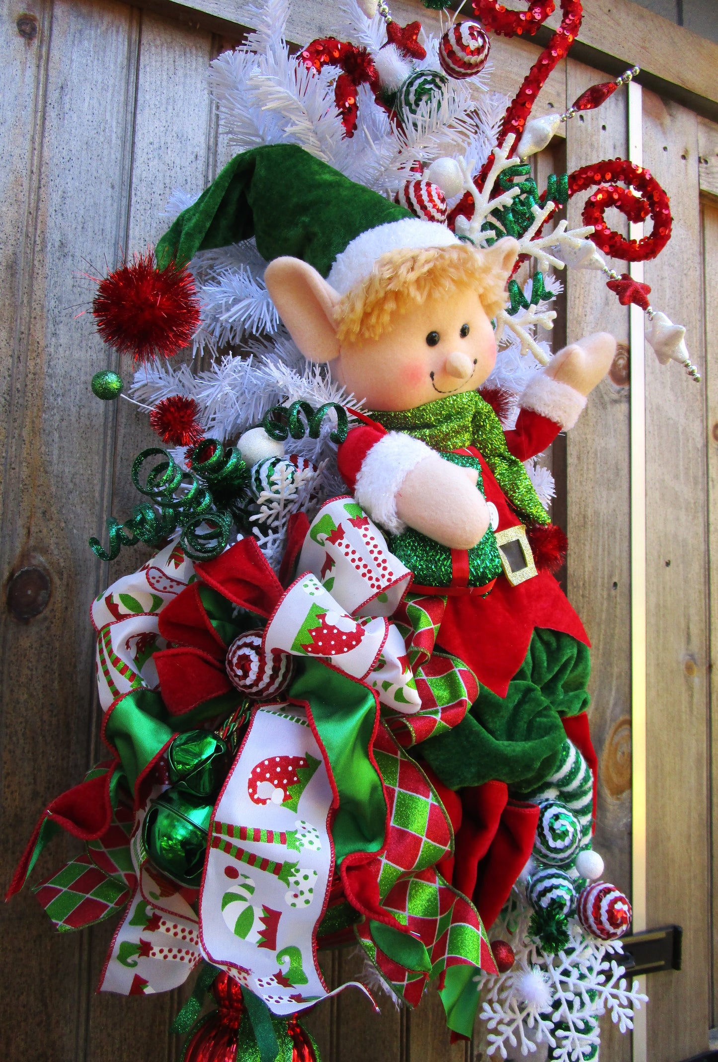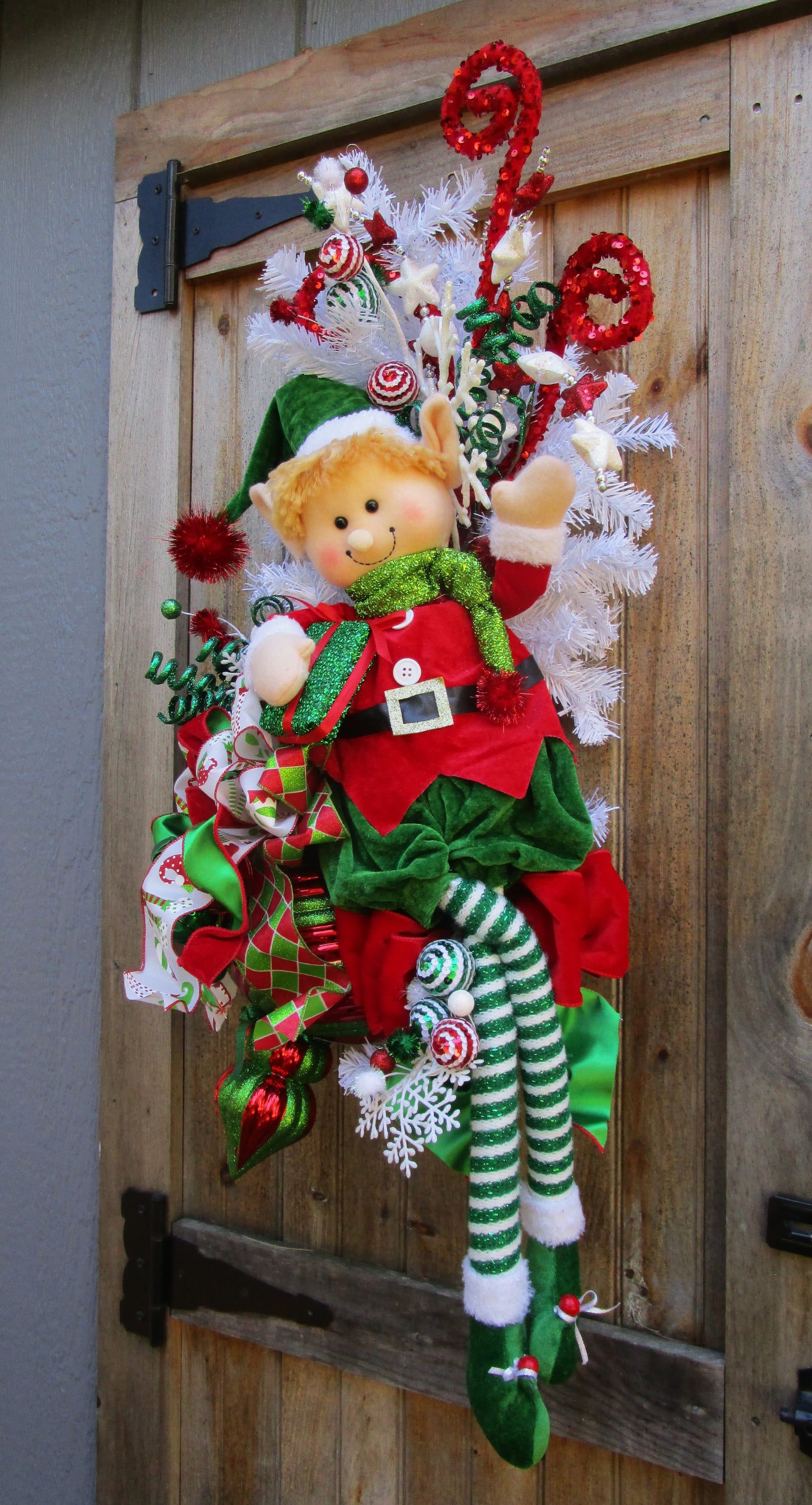 Playful elf swag with white pine, candy accents, jingle bells & a multi-layered bow. A cheerful burst of holiday joy.