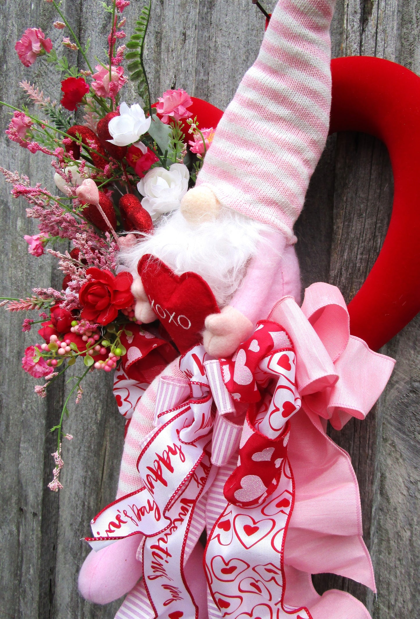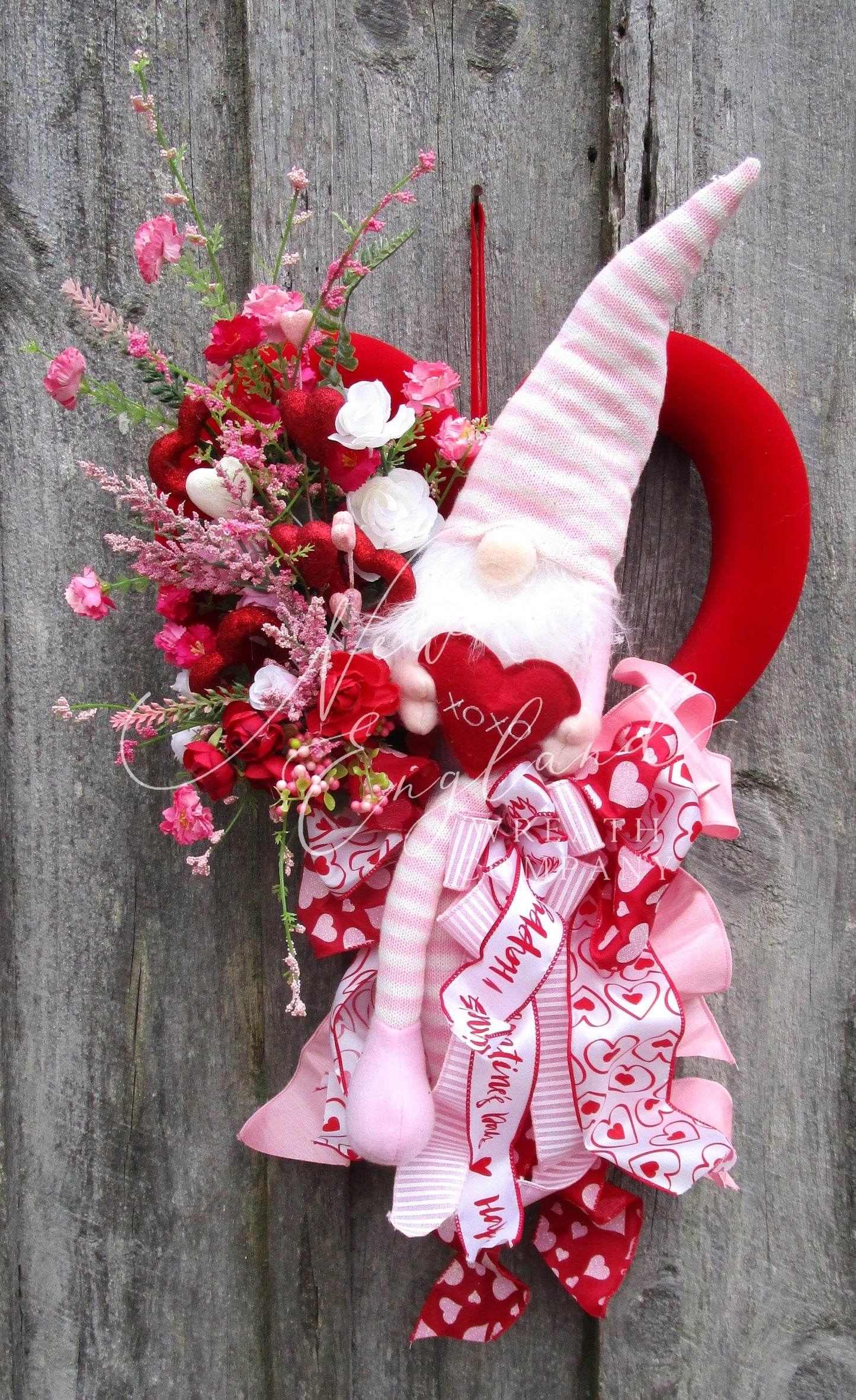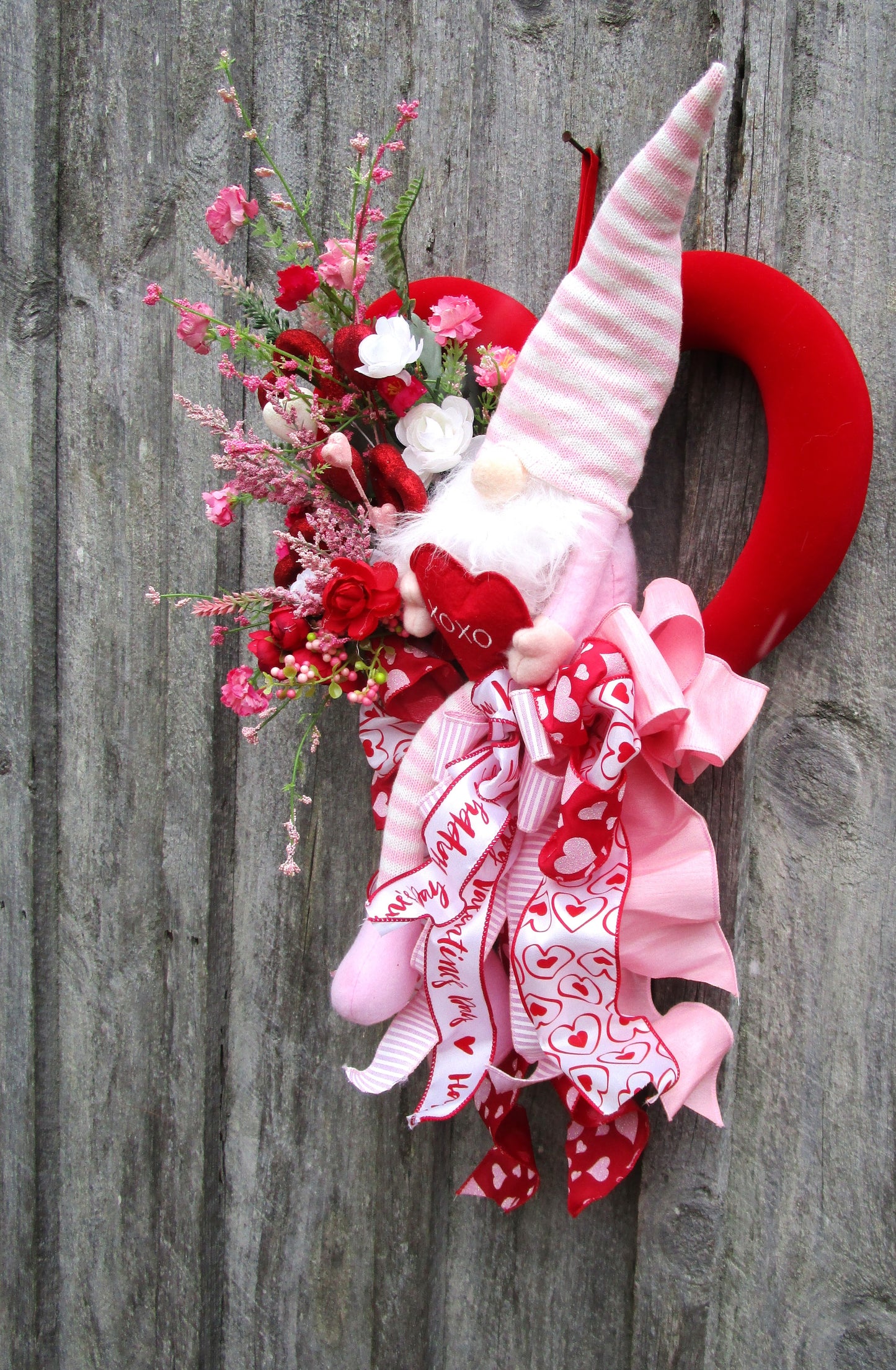 Add cheerful charm to your Valentine’s Day decor with this whimsical gnome wreath! A plush gnome holding an “XOXO” heart sits on a lush velvet-like heart frame, surrounded by a bouquet of festive florals, glittered hearts, and a layered bow.