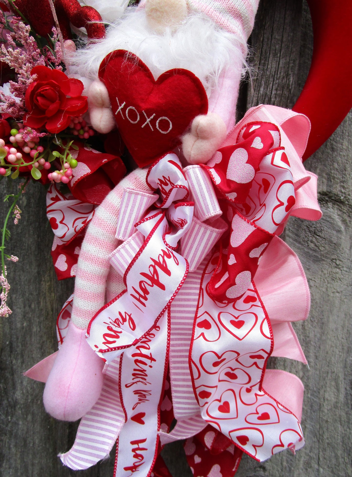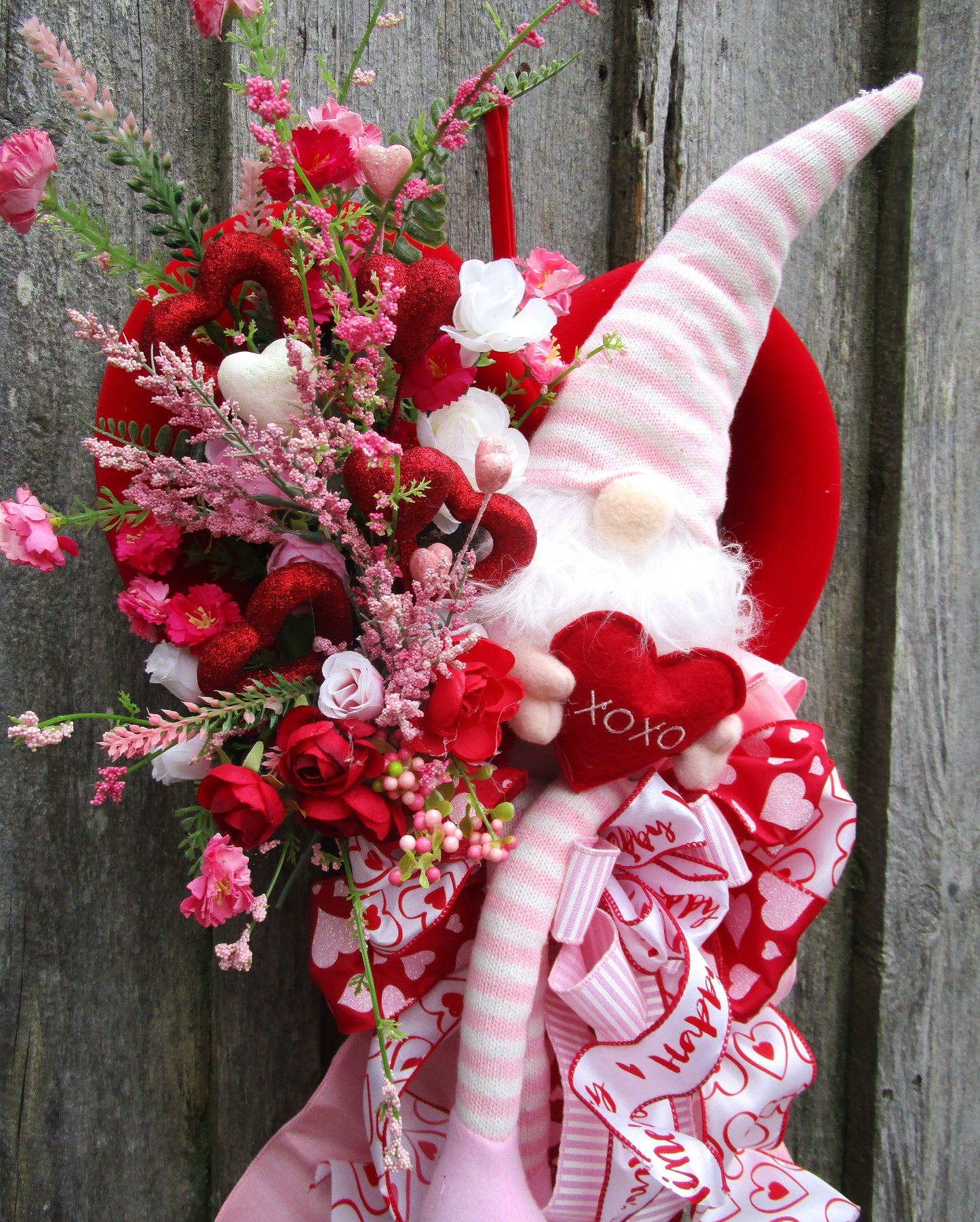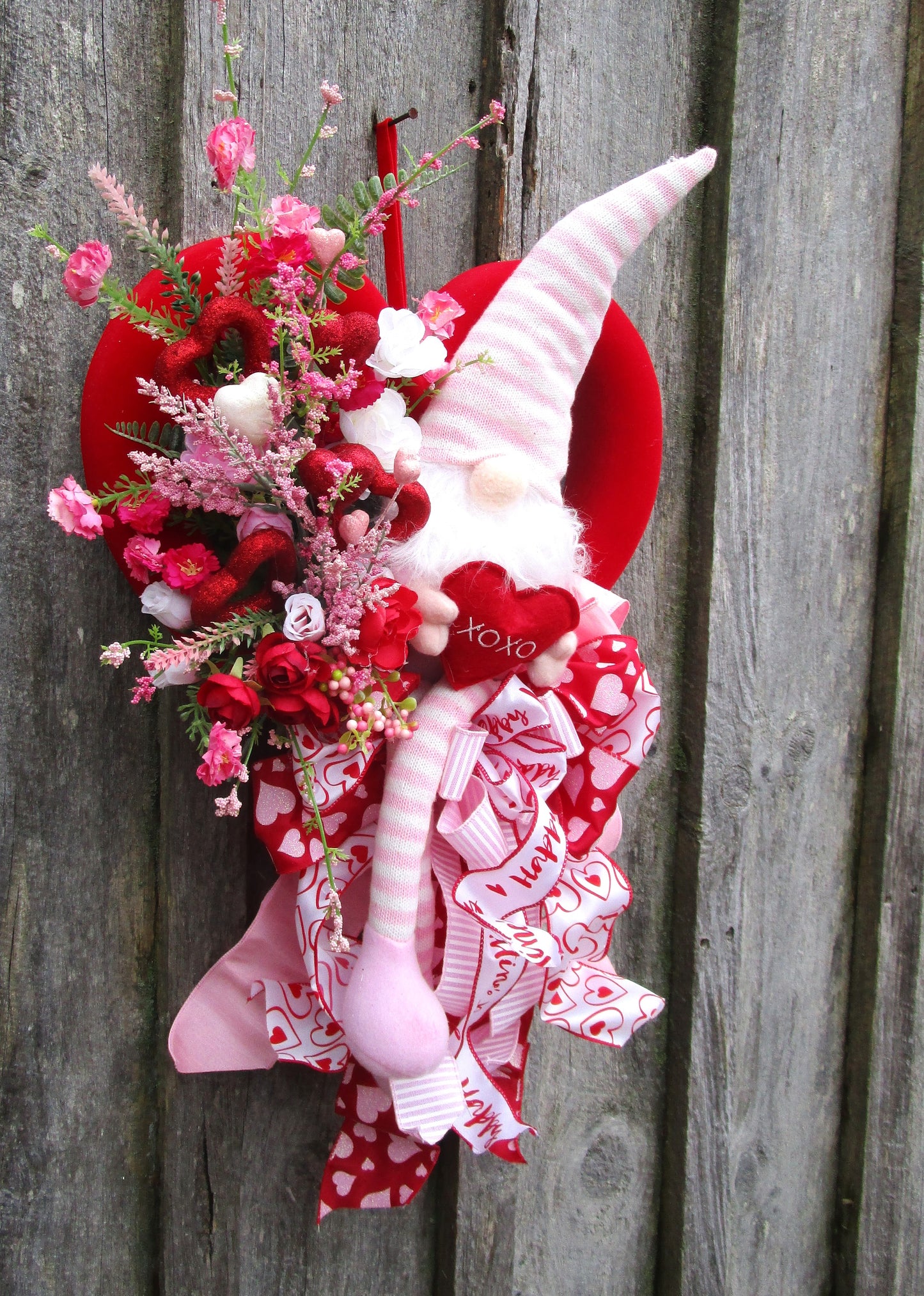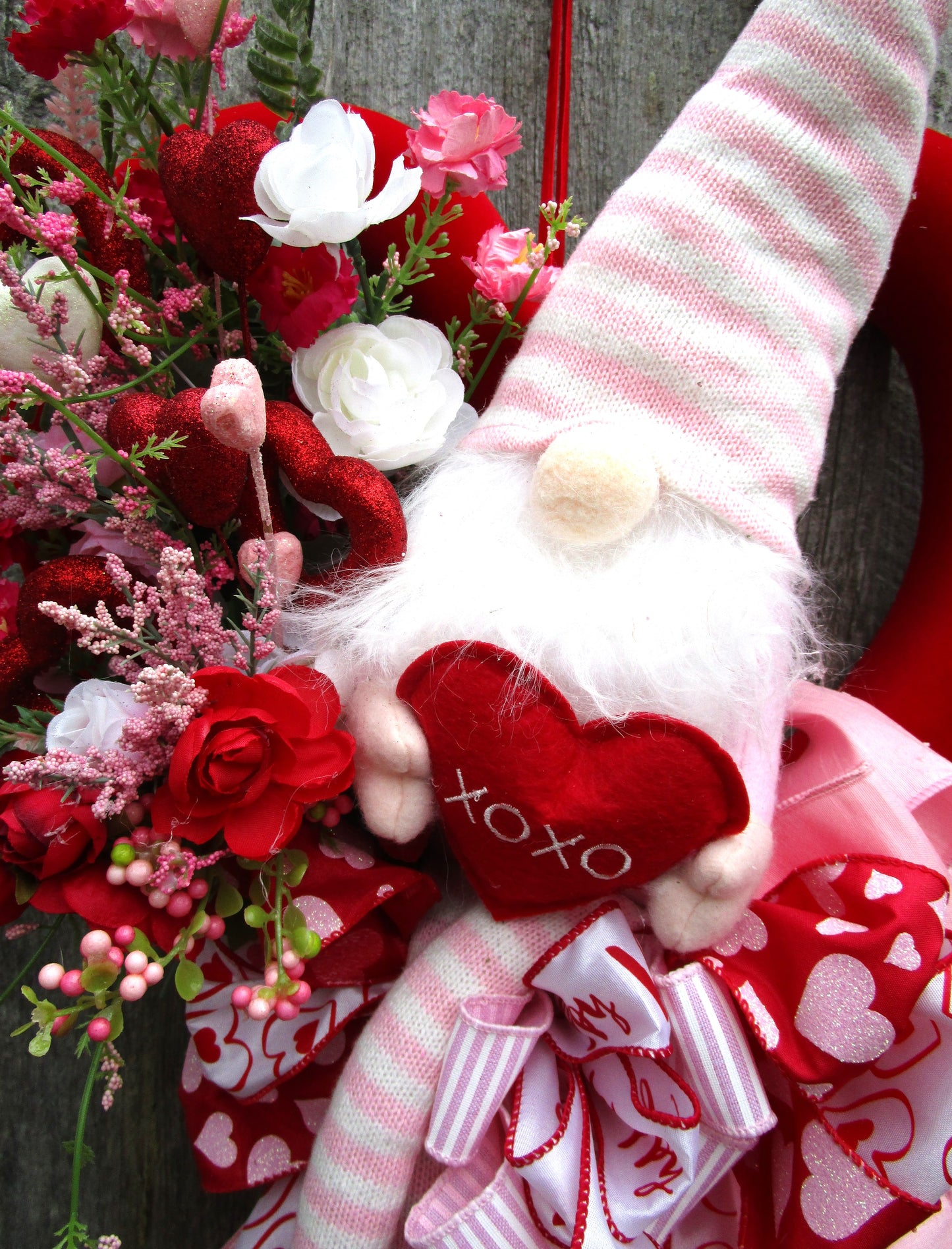 Add cheerful charm to your Valentine’s Day decor with this whimsical gnome wreath! A plush gnome holding an “XOXO” heart sits on a lush velvet-like heart frame, surrounded by a bouquet of festive florals, glittered hearts, and a layered bow.